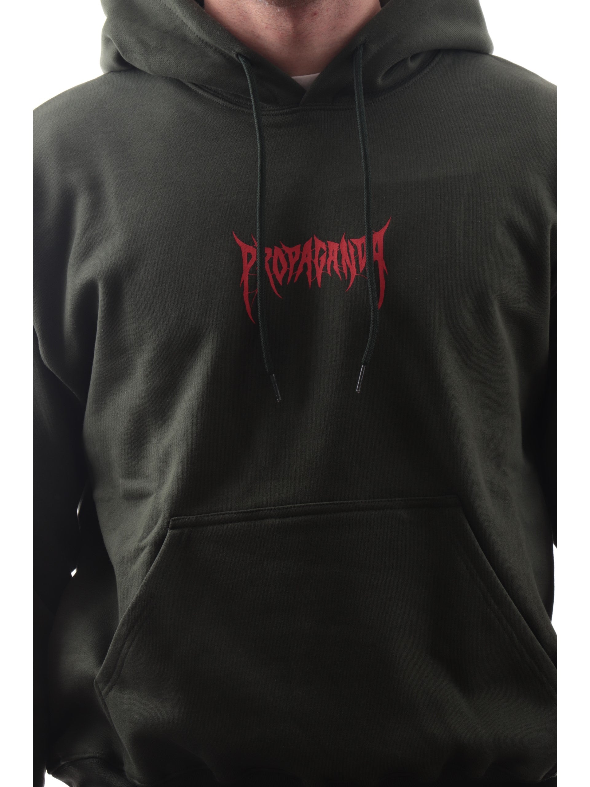 Felpa Propaganda verde Ribs Spider 25FWPRFE, realizzata in 100% puro cotone. Questa felpa Propaganda ha il cappuccio fisso regolabile con laccetti, una comoda tasca a marsupio, la maxi stampa Ribs Spider sul lato posteriore, il logo Propaganda stampato sul davanti, polsini e fondo elasticizzati.