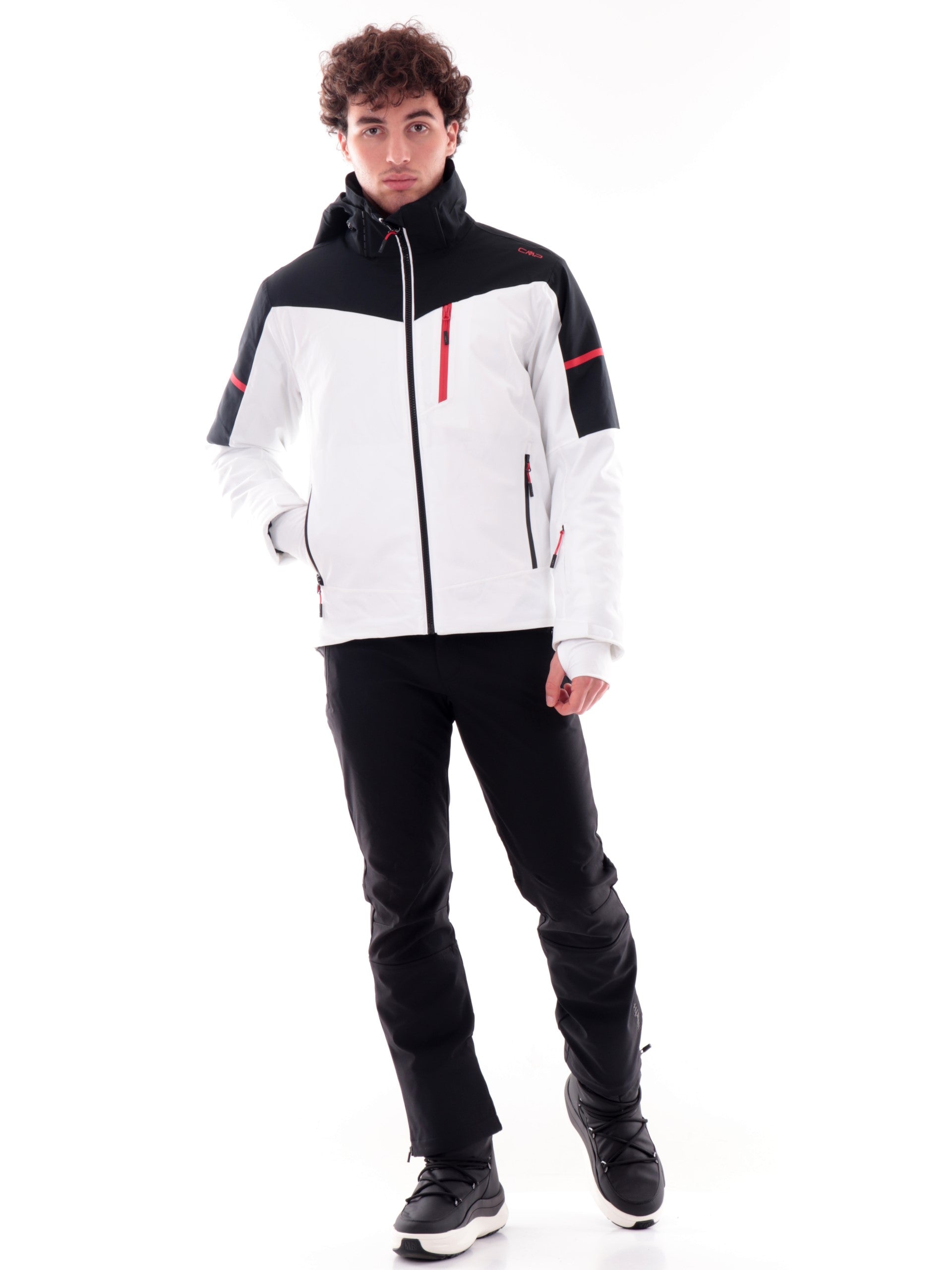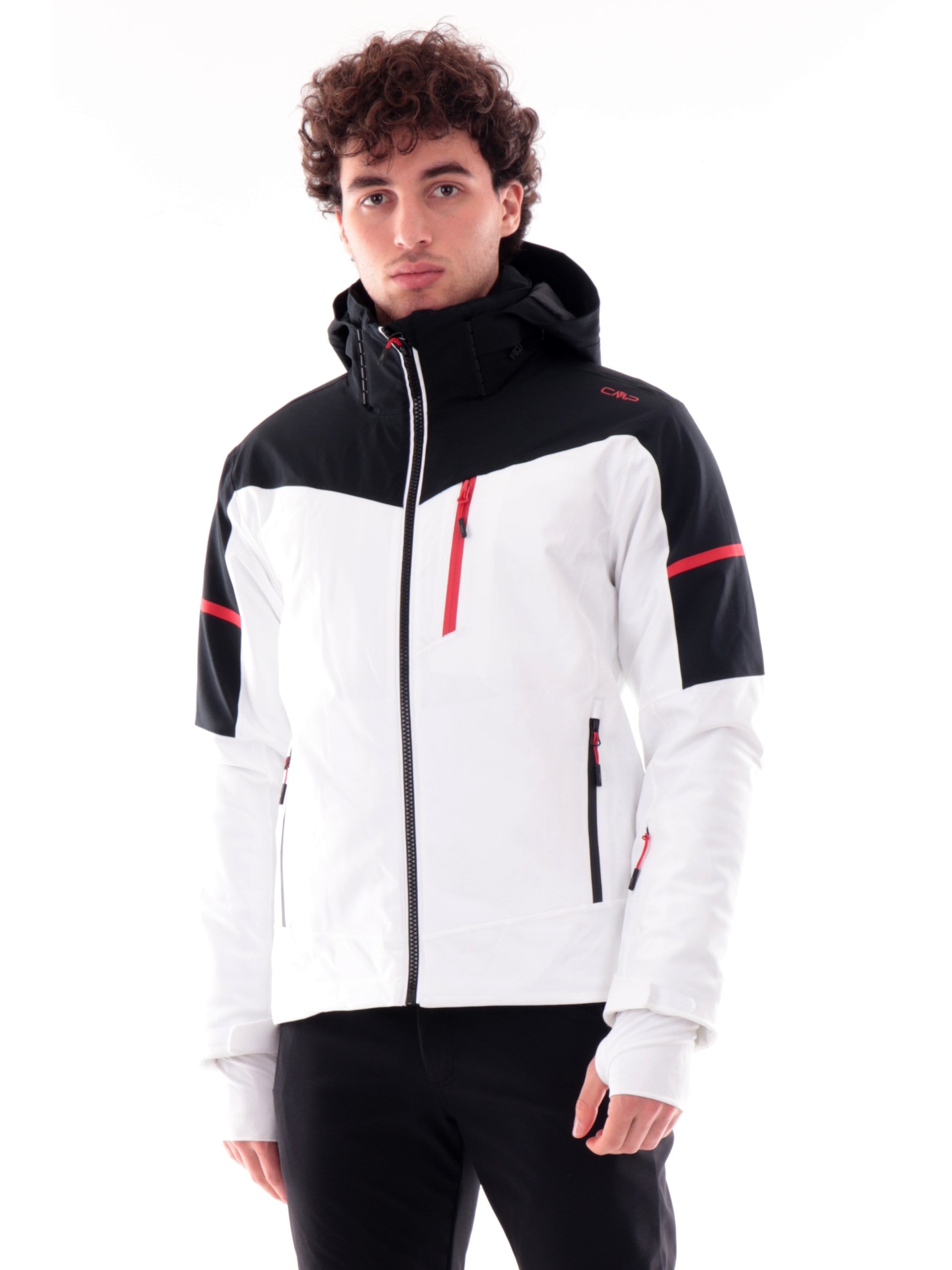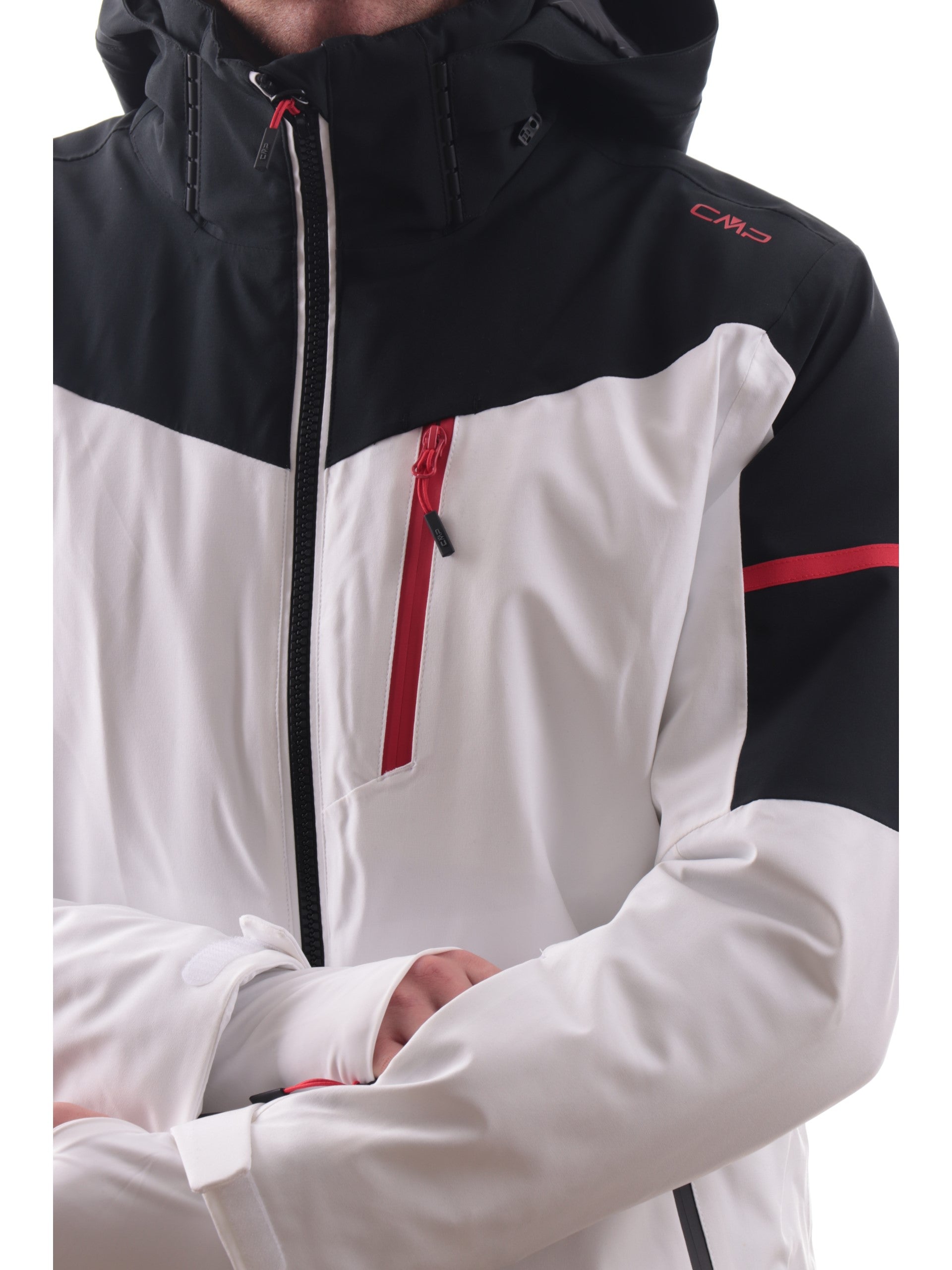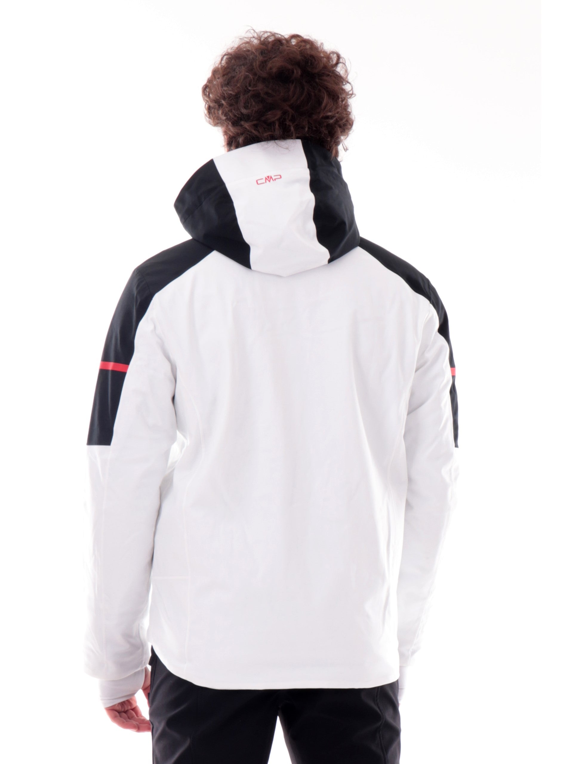 Giacca da sci bianco da uomo CMP. Questa giacca da neve realizzata con il tessuto 4-way stretch, progettata per garantire elevate performance e libertà di movimento anche nelle condizioni più estreme, dall'imbottitura Feel Warm Flat, calda che assicura isolamento termico ottimale, mentre il sistema Clima Protect con membrana impermeabile e traspirante offre una protezione efficace contro vento eneve. Questa giacca è caratterizzata dal cappuccioremovibile con coulisse, chiusura full zip centrale, due tasche lateralicon zip, tasca lato cuore con zip, sulla manica troviamo un taschino per lo skipass, polsini elasticizzati e fondo regolare con coulisse, all'interno troviamodue tasche, una aperta e una chiusa.