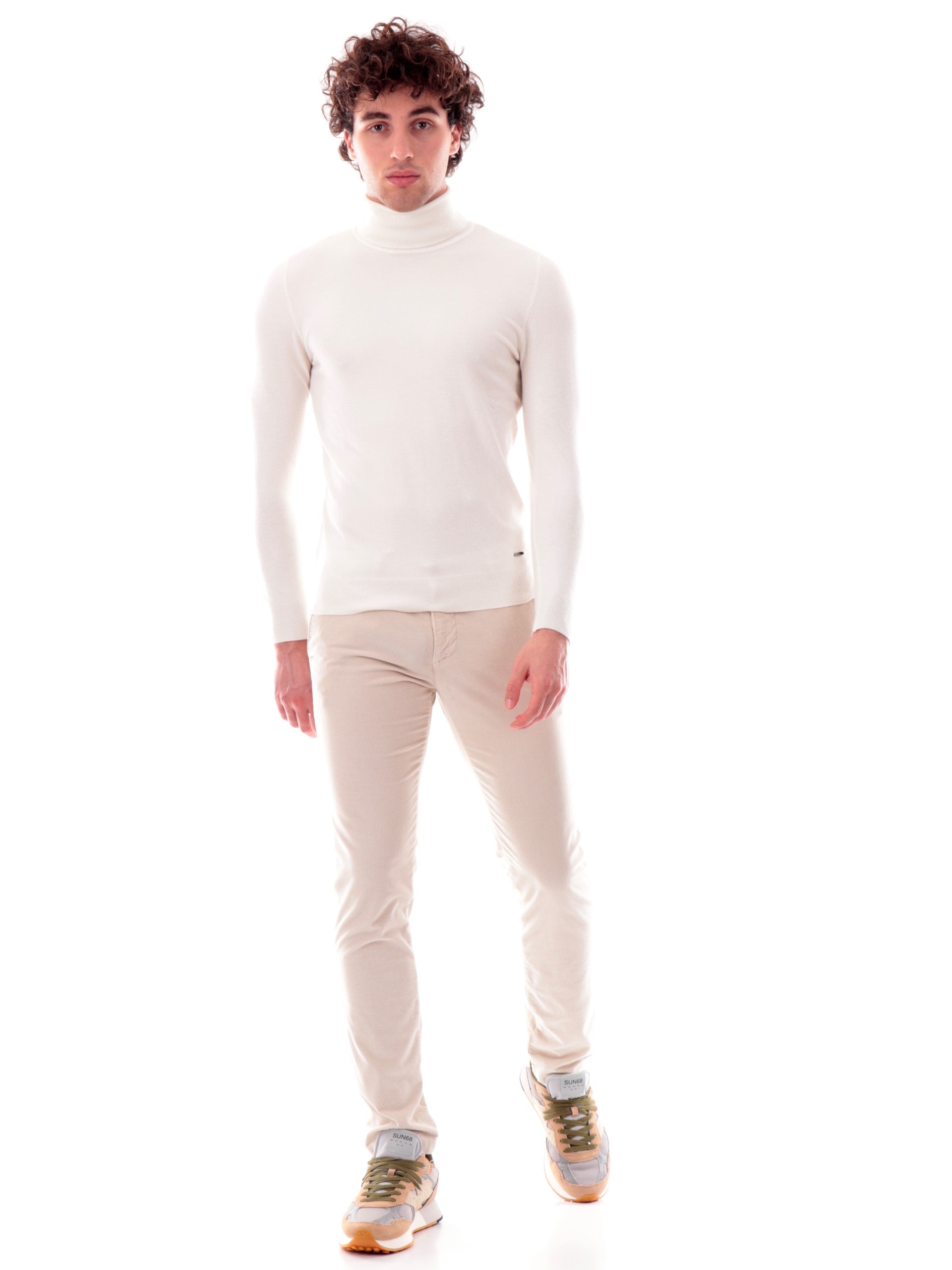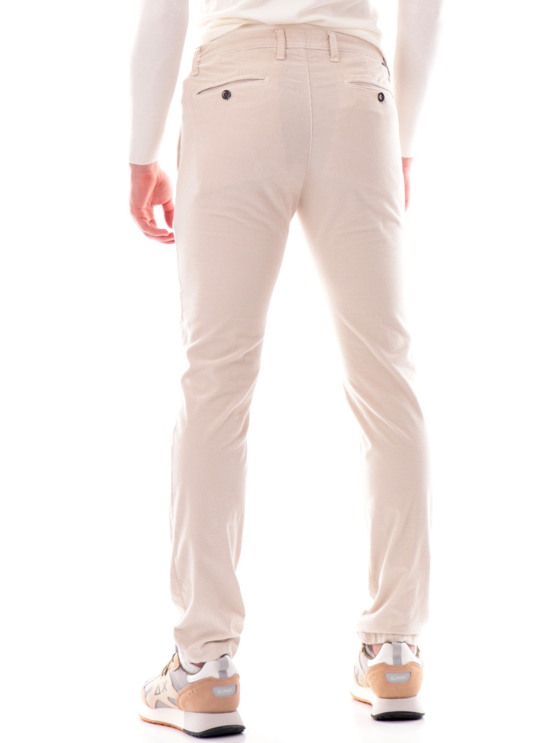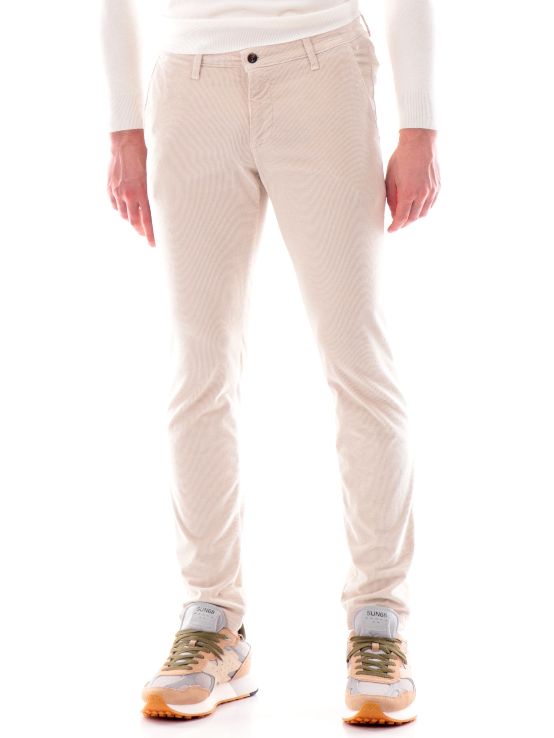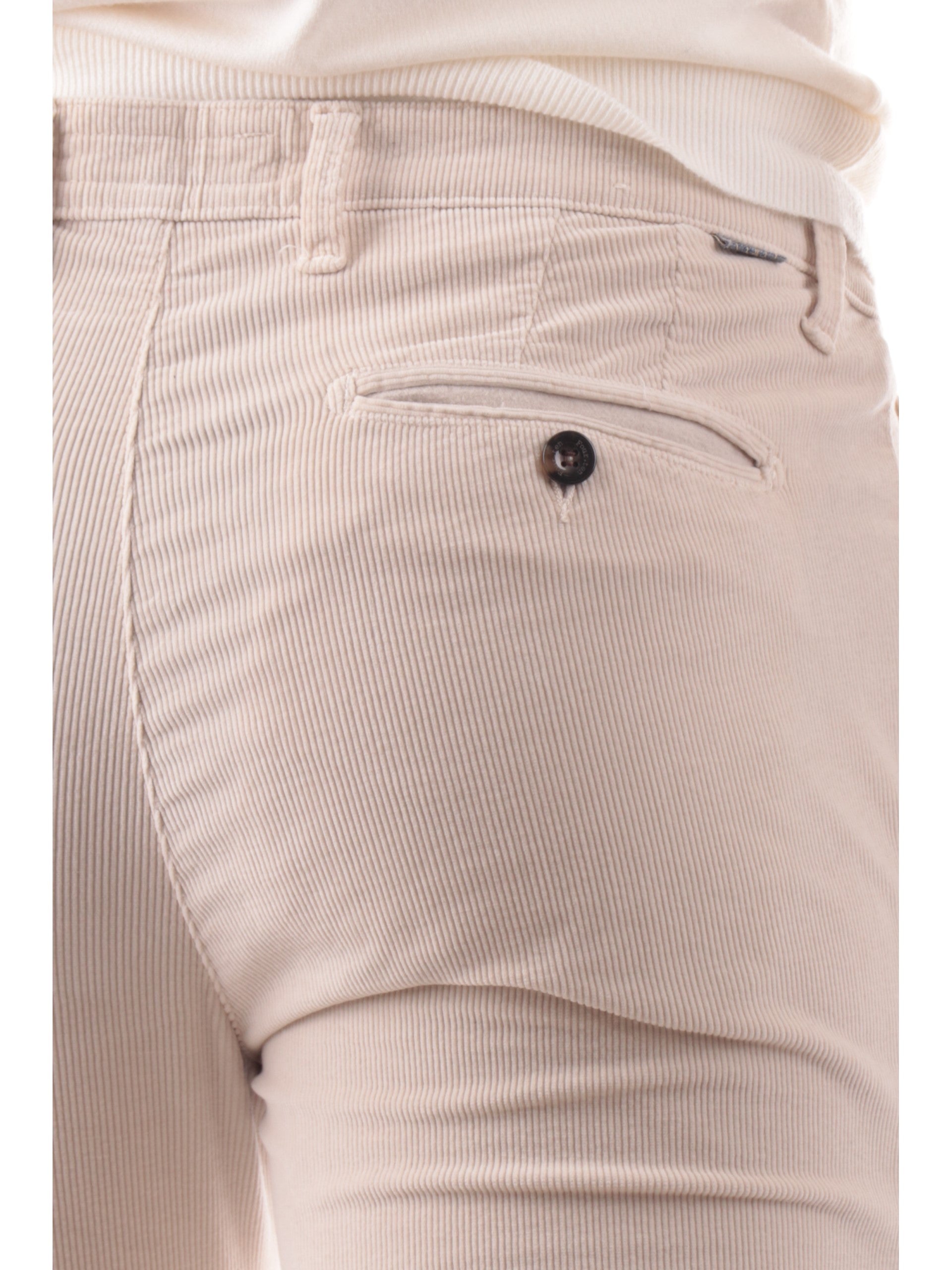 Pantaloni velluto Four Ten bianchi da uomo a costine 200072, realizzati in cotone. Questi pantaloni uomo Four Ten bianchi hanno la chiusura con bottone più zip, la predisposizione per indossare la cintura, due tasche laterali aperte con taglio obliquo, due tasche posteriori a filo con bottone e la vestibilità Slim.