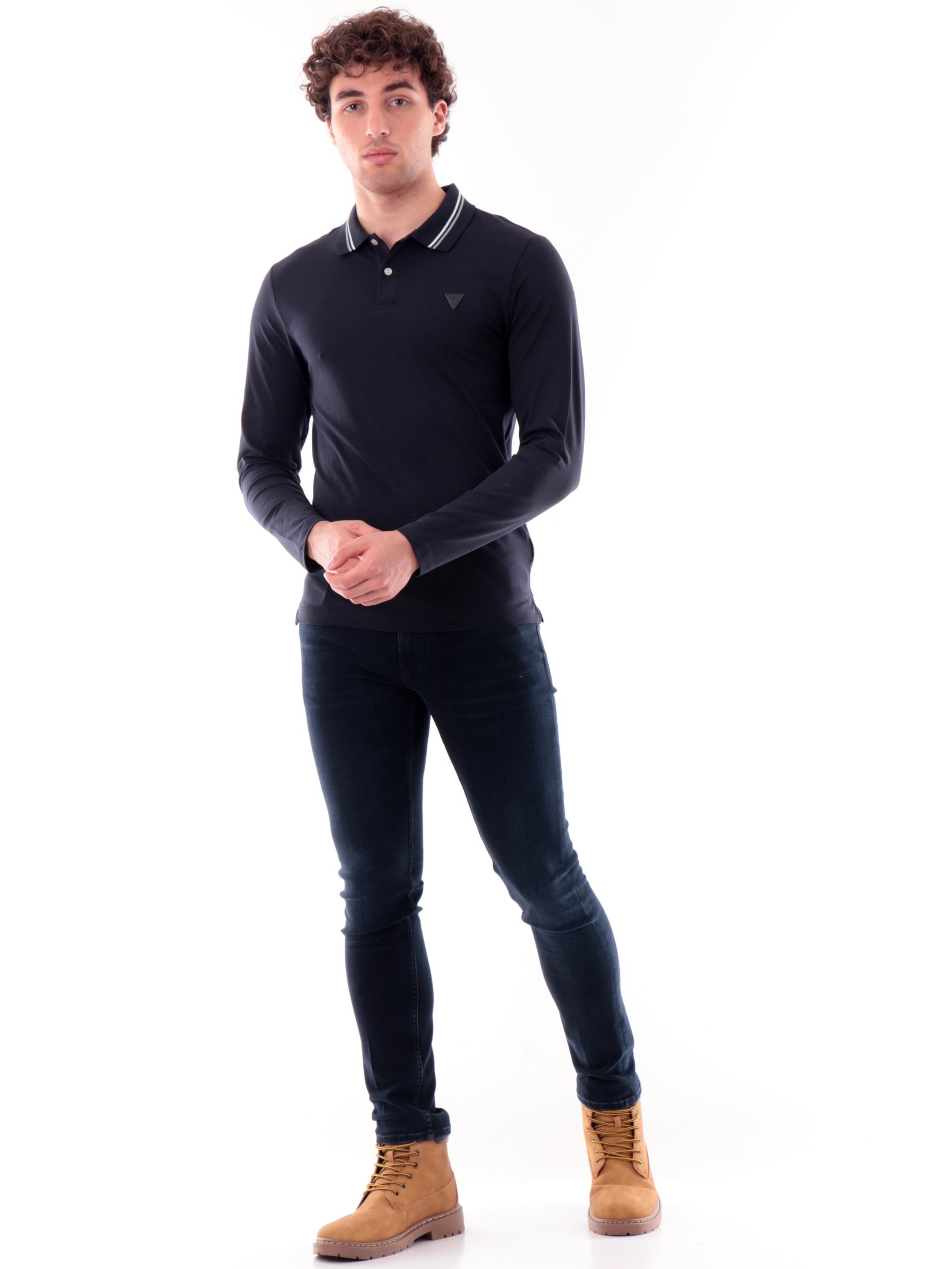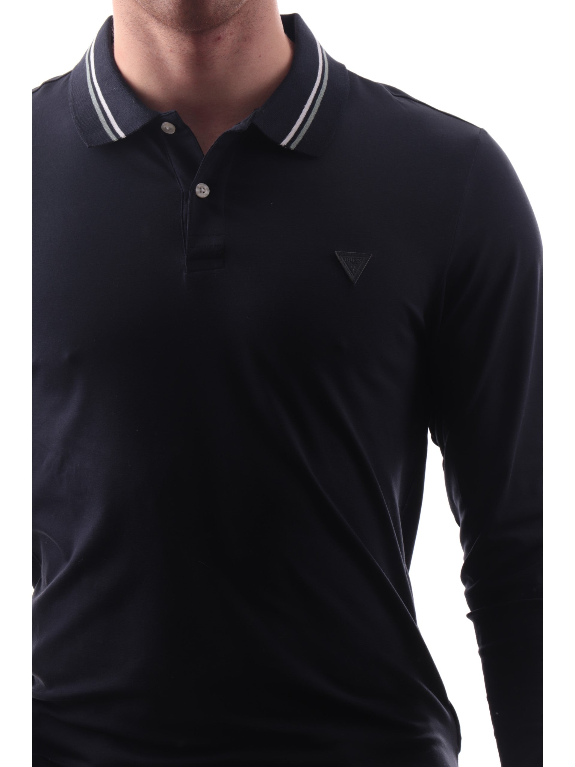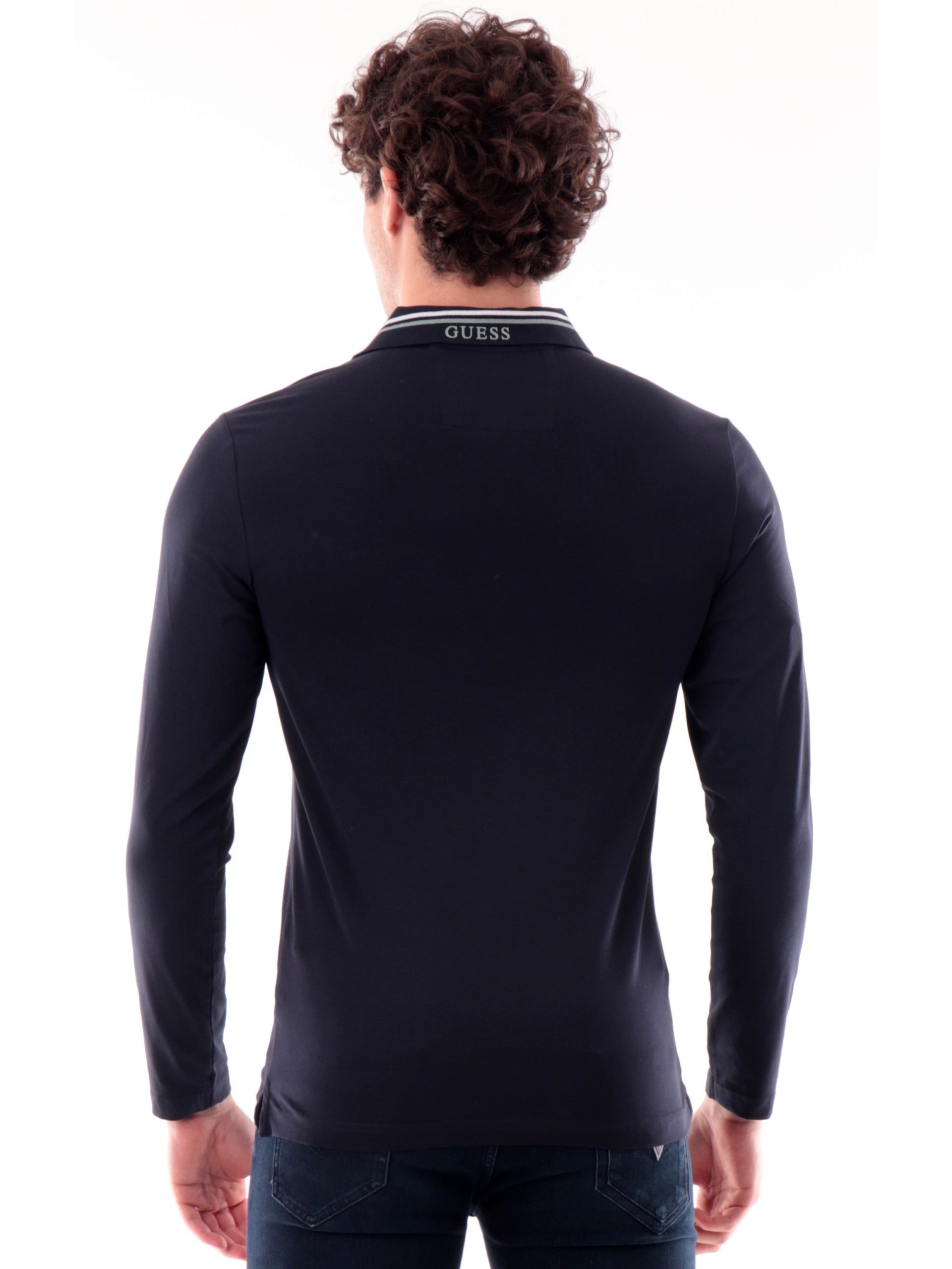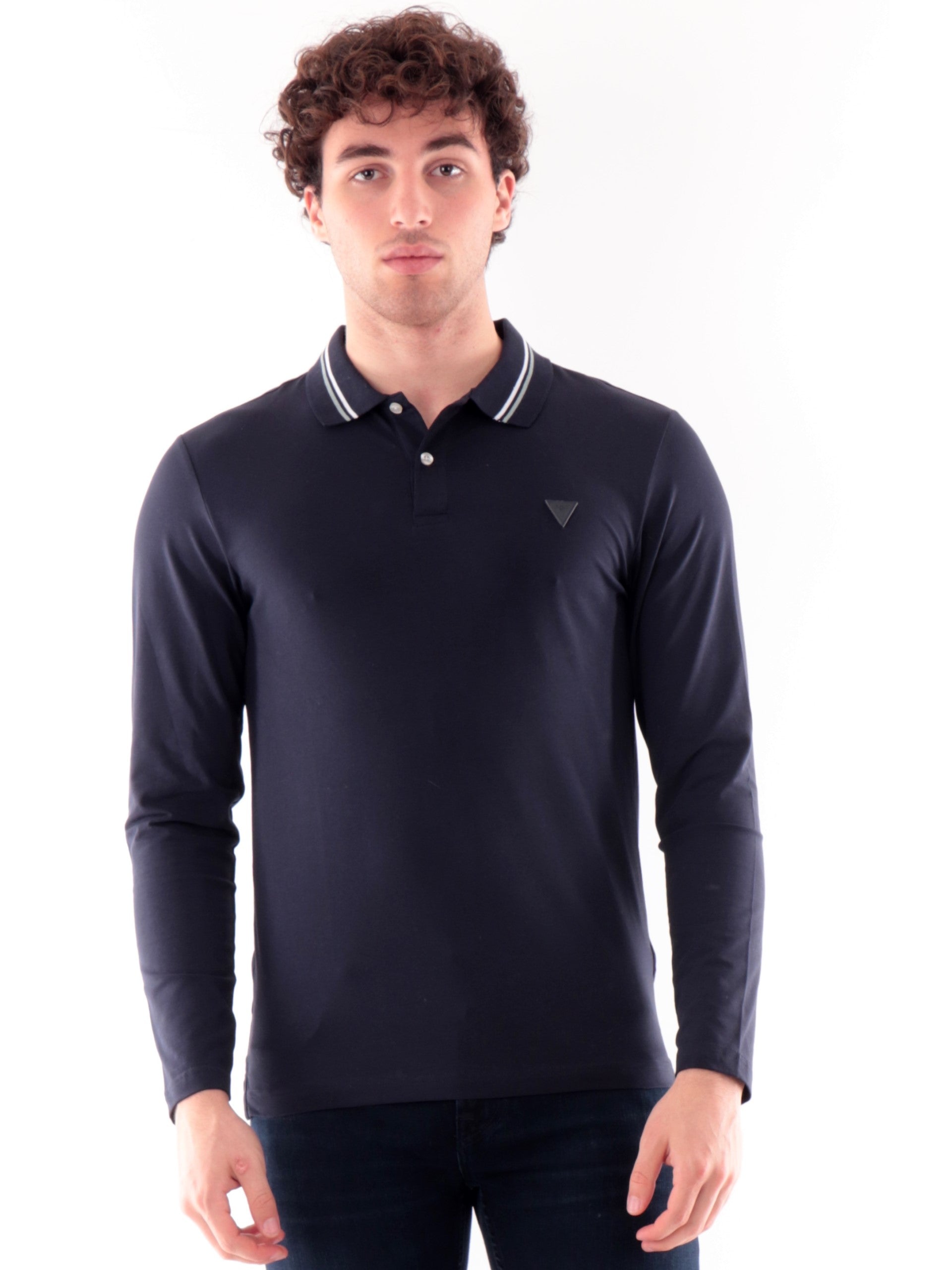 Polo Guess blu maniche lunghe da uomo Oliver M5YP36J1314, realizzata in cotone. Questa polo Guess blu ha il colletto alla francese, la chiusura con bottoni, le maniche lunghe e il logo Guess applicato lato cuore.