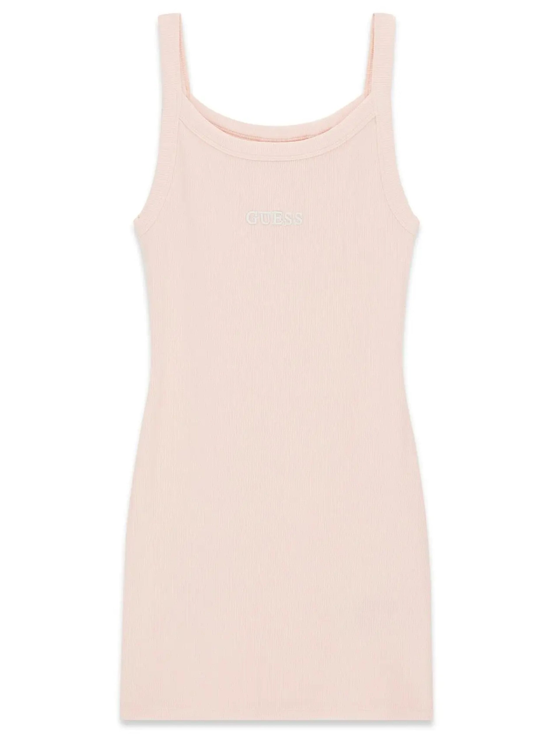 Abito a canotta rosa da bambina Guess. Questo abito rosa, realizzato in viscosa, perfetto per la stagione estiva, è caratterizzato dallo scollo a giro, spalline, scritta Guess applicata sul davanti efondo regolare