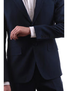 Marineblauer, eleganter Herrenanzug AB600TR104 von Aldo Maria Testa aus weichem und leichtem Stoff. Die Jacke dieses Anzugs von Aldo Maria Testa hat einen Kragen, dekorative Knöpfe an den Manschetten, zwei seitliche Leistentaschen mit Klappen und einen doppelten Seitenschlitz an der Unterseite. Die Hose dieses Anzugs von Aldo Maria Testa hat einen Knopf- und Reißverschluss, eine Möglichkeit zum Tragen eines Gürtels, zwei offene Seitentaschen, zwei Gesäßtaschen mit Knöpfen und einen normalen Hosenbund.