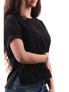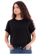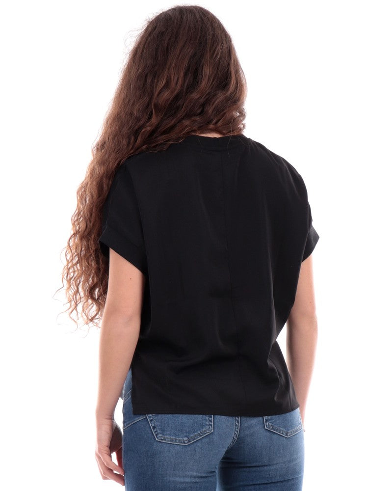 Schwarze Tiffosi-Bluse für Damen von Trufa 4 10055360, aus weichem Slip-Stoff. Dieses schwarze Tiffosi-Hemd hat einen gerippten elastischen Kragen, kurze Ärmel mit breiten Manschetten und einen Saum mit Seitenschlitzen.