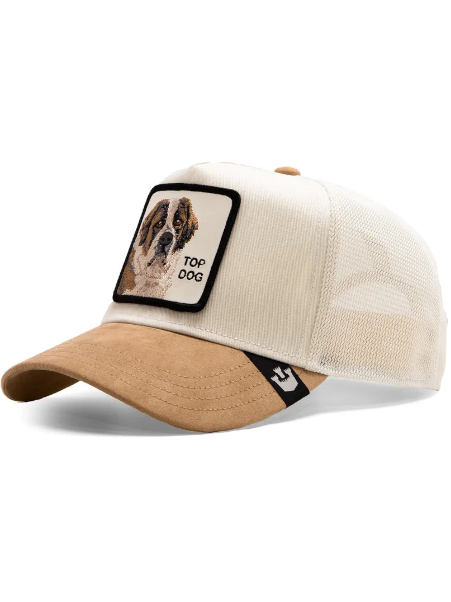 Cappello Goorin Bros san bernardo top dog trucker Cap 101181. Questo berretto Goorin Bros bianco e beige san bernardo top dog ha il patch san bernardo cucito sul davanti, il patch logo applicato sulla visiera lato sinistro, la retina traspirante e la regolazione con laccetto.
