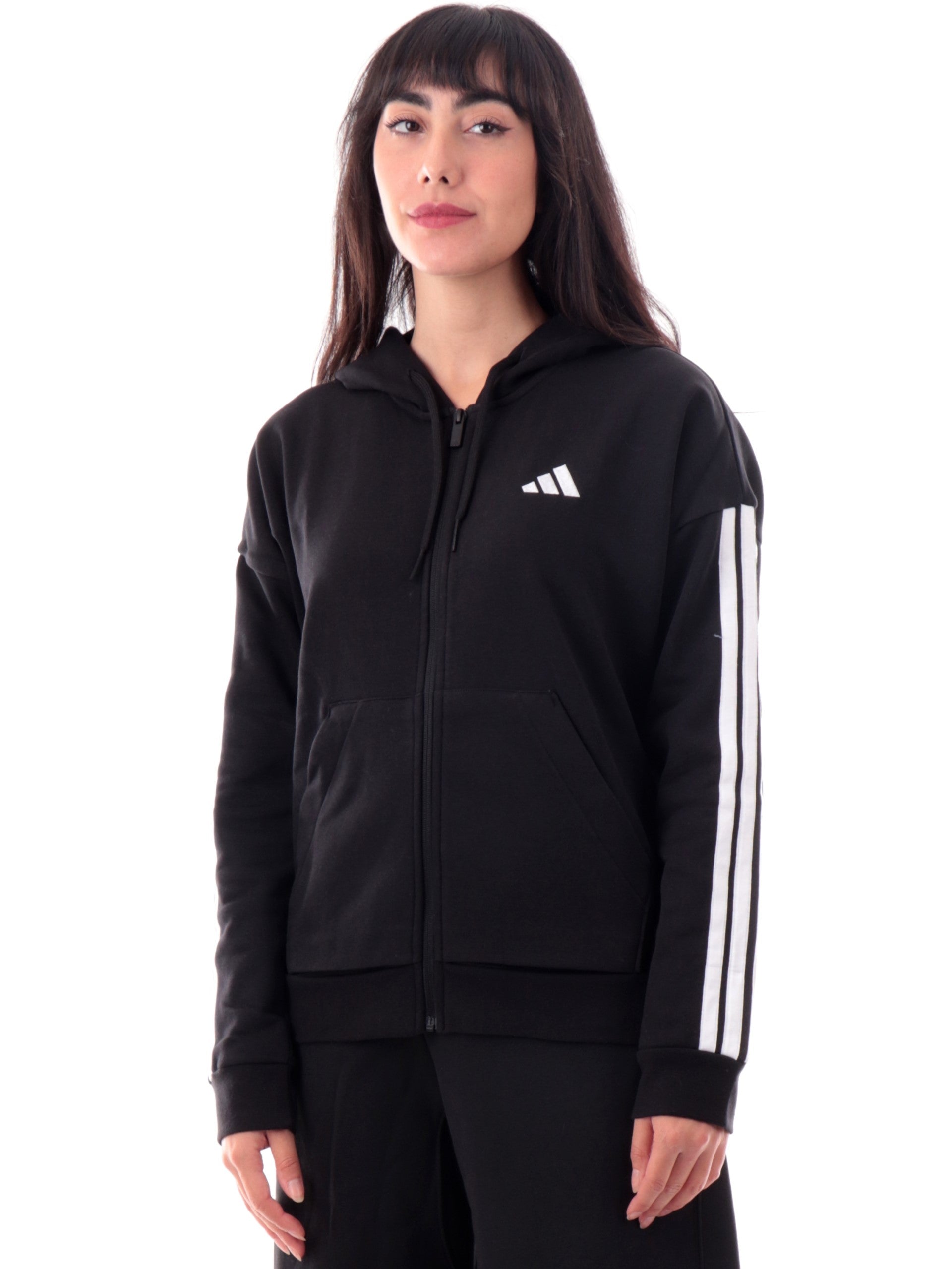 Felpa Adidas nera felpata da donna full zip con cappuccio JE1283, realizzata in cotone. Questa felpa donna Adidas nera ha il cappuccio regolabile con laccetti, la chiusura full zip centrale, due tasche laterali aperte, le iconiche 3Stripes ambo i lati e il logo Adidas ricamato lato cuore.