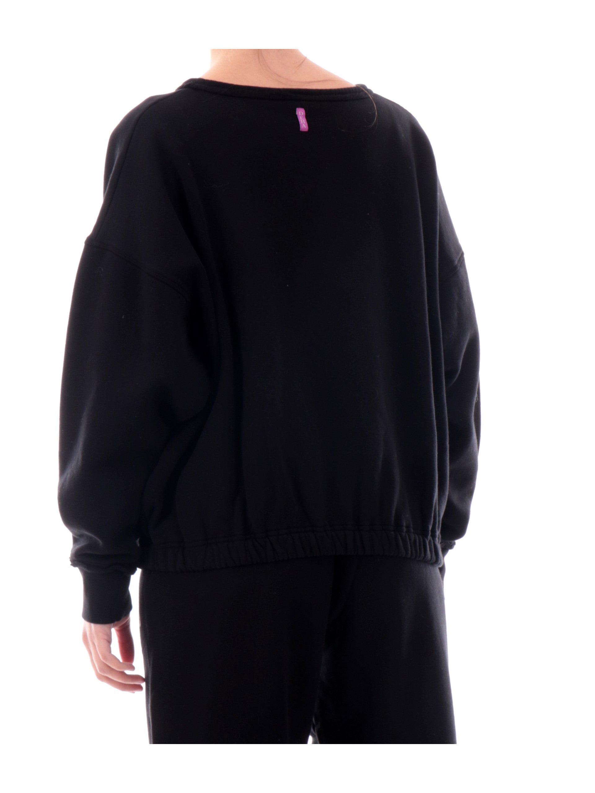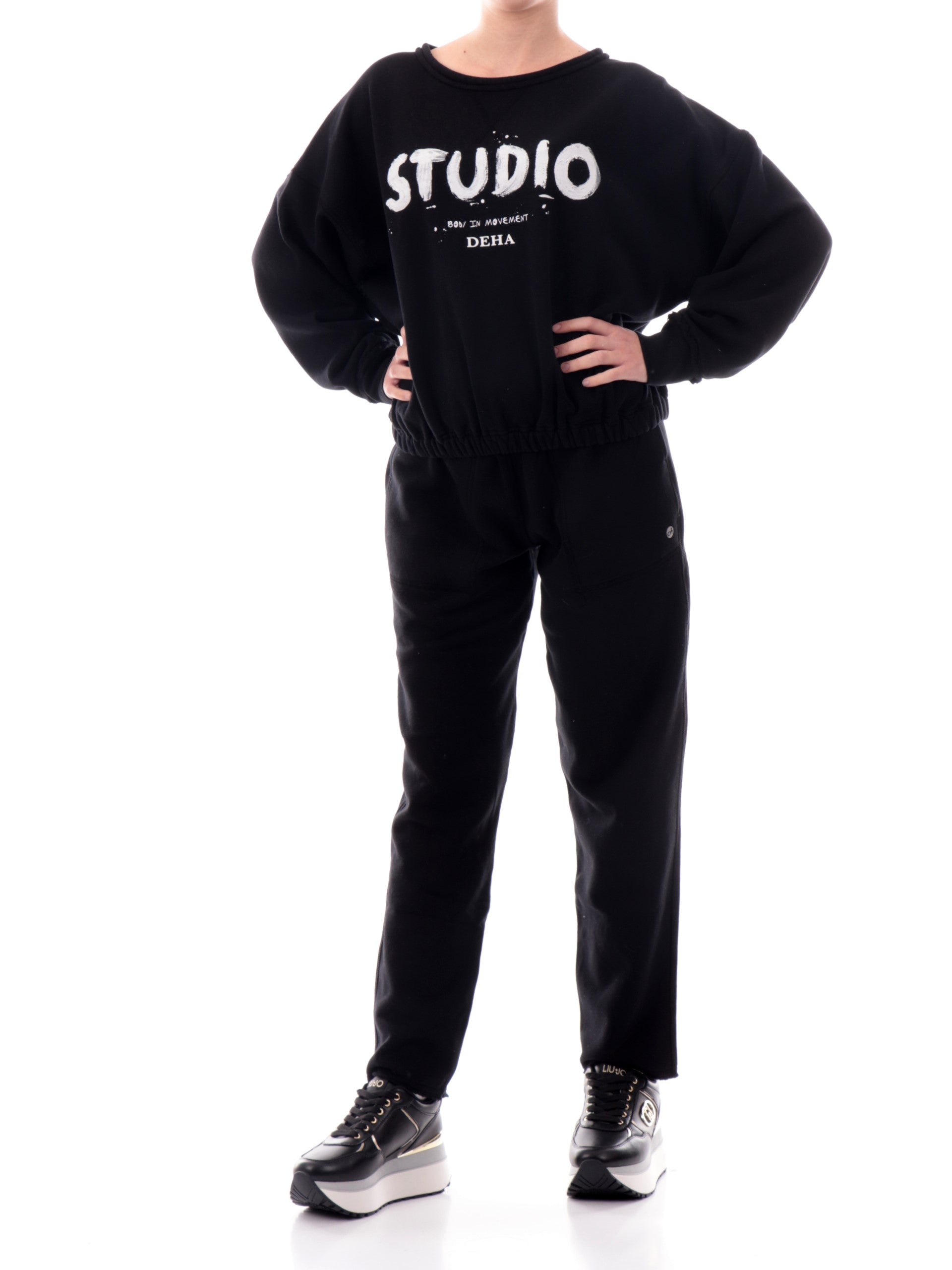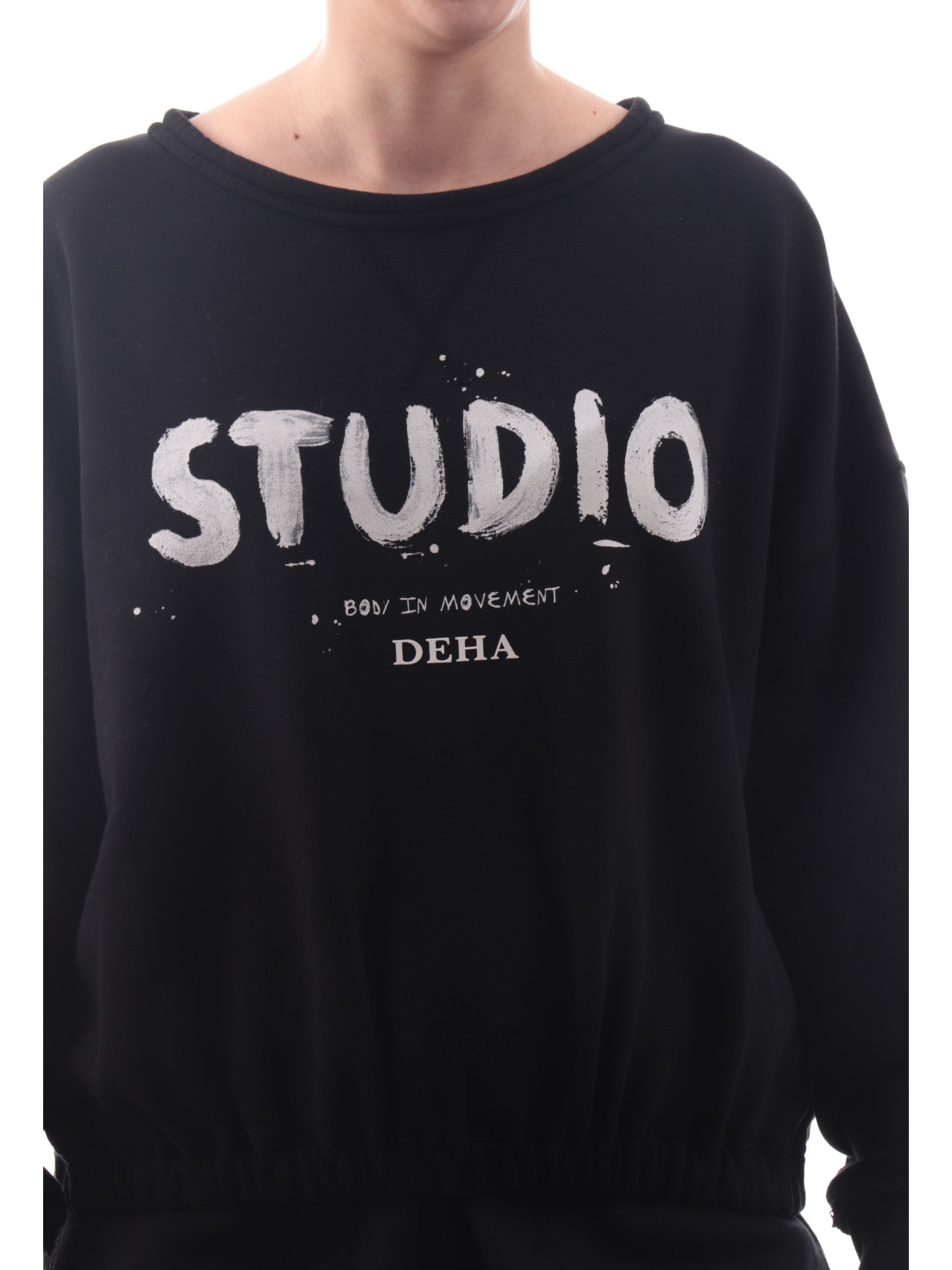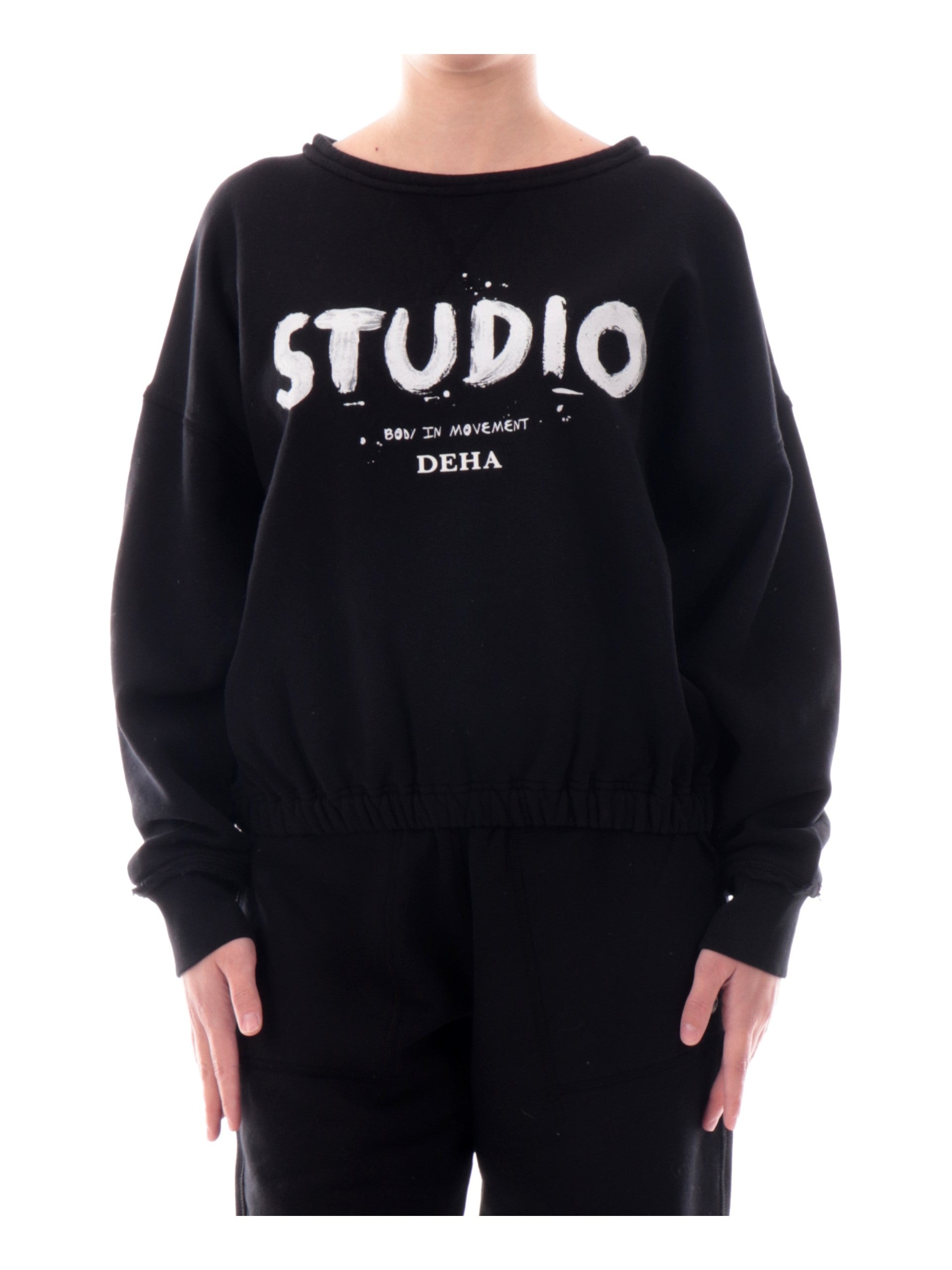 Felpa nera Deha over da donna felpata. Questa felpa nera a girocollo Deha realizzata 100% in puro cotone è caratterizzata da una scritta sul davanti, polsini e fondo elasticizzati. all'interno di questa felpa troviamo un tessuto caldo, morbido e soffice al tatto