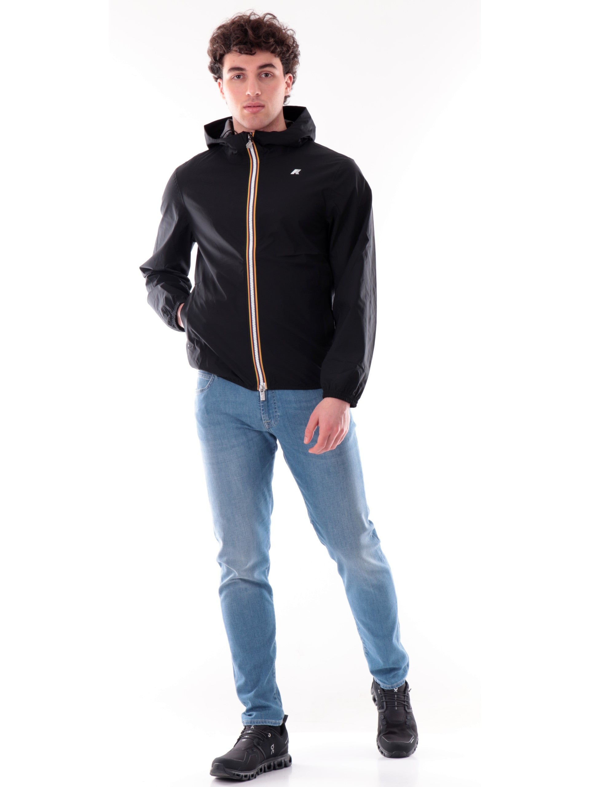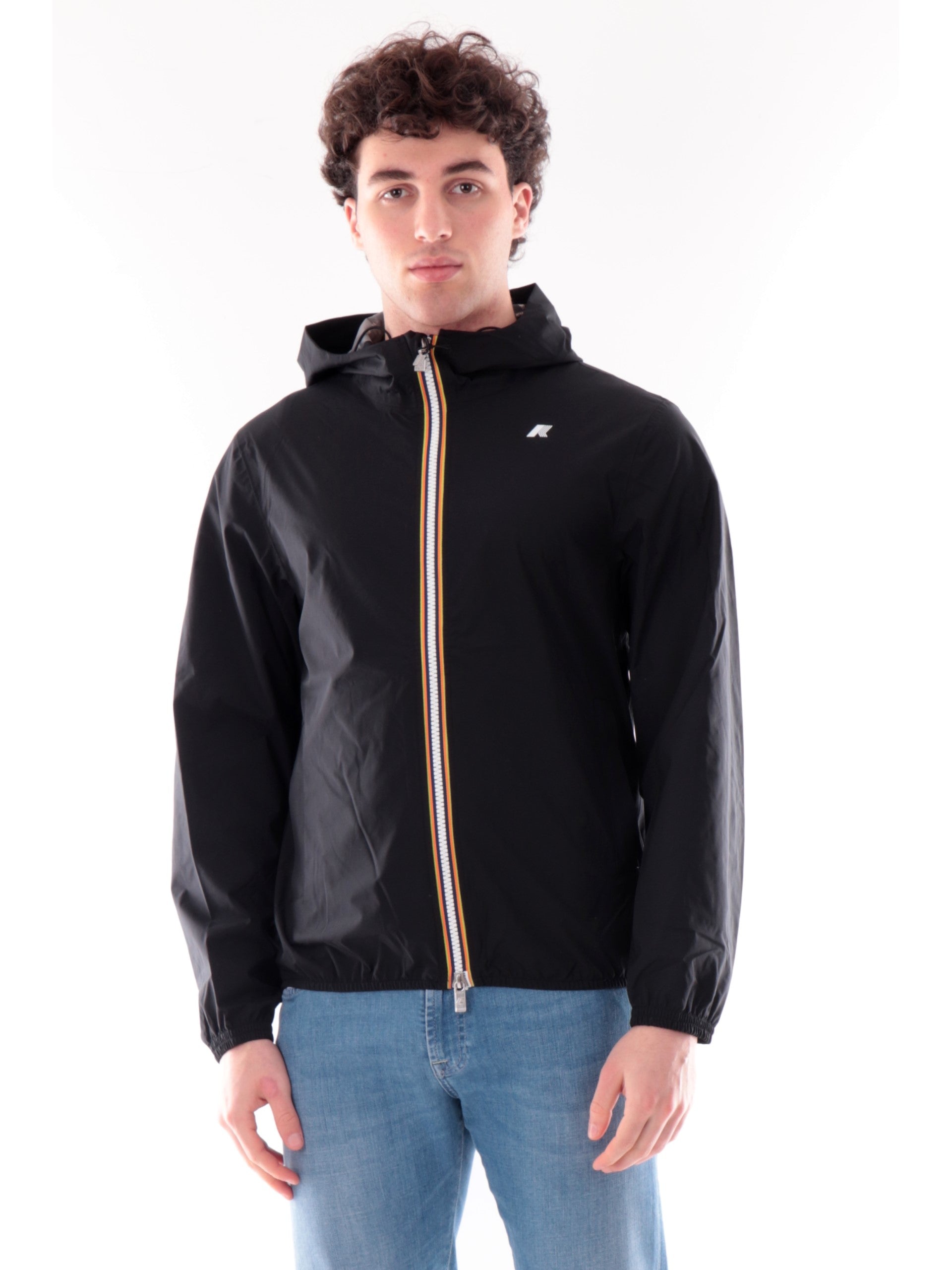 Giacca K-Way nero da uomo Jack Stretch Dot. Questa giacca K-Way è ideale per le mezze stagioni e con vestibilità slim, realizzata in tessuto tecnico elasticizzato, che segue i movimenti e protegge dal vento e dalla pioggia. L'interno è foderato con una membrana isolante decorata con K-Way stampato all over in tonalità argento. Questo giaccetto K-Way è caratterizzato dal cappuccio fisso con coulisse, chiusura full zip con doppio cursore, due tasche laterali con zip, logo del branda applicato a lato cuore, polsini e fondo elasticizzati.