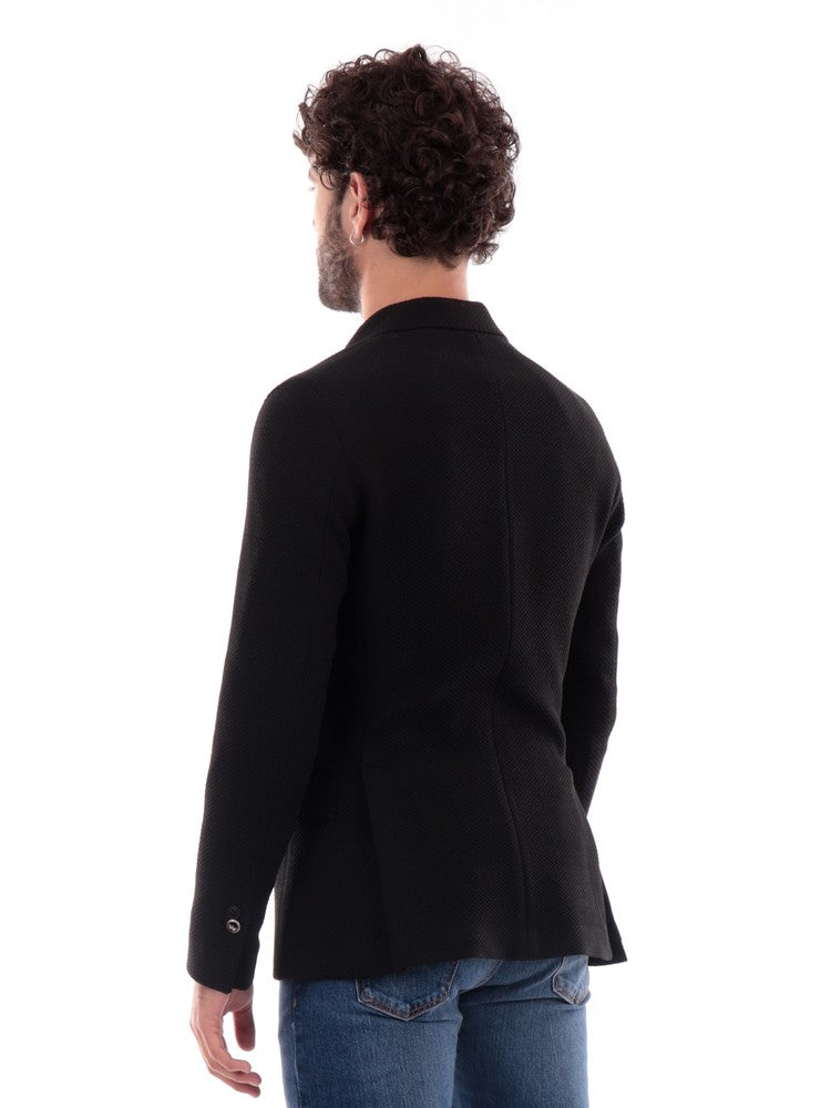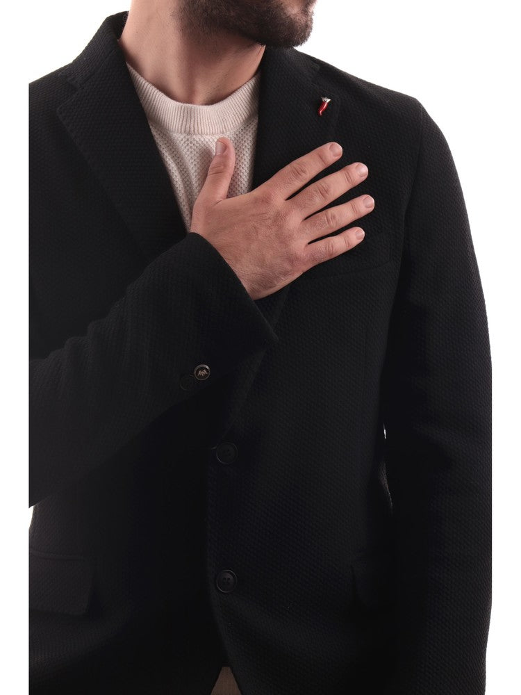 Schwarze Mulish-Herrenjacke IMPACTHKS900, hergestellt in Italien. Diese elegante schwarze Mulish-Jacke hat den traditionellen Kragen mit dem roten Horn, den Knopfverschluss, zwei dekorative Seitentaschen und einen Saum mit Schlitz hinten. Diese minimalistische, bequeme und elegante Mulish-Jacke darf in Ihrer Garderobe nicht fehlen.