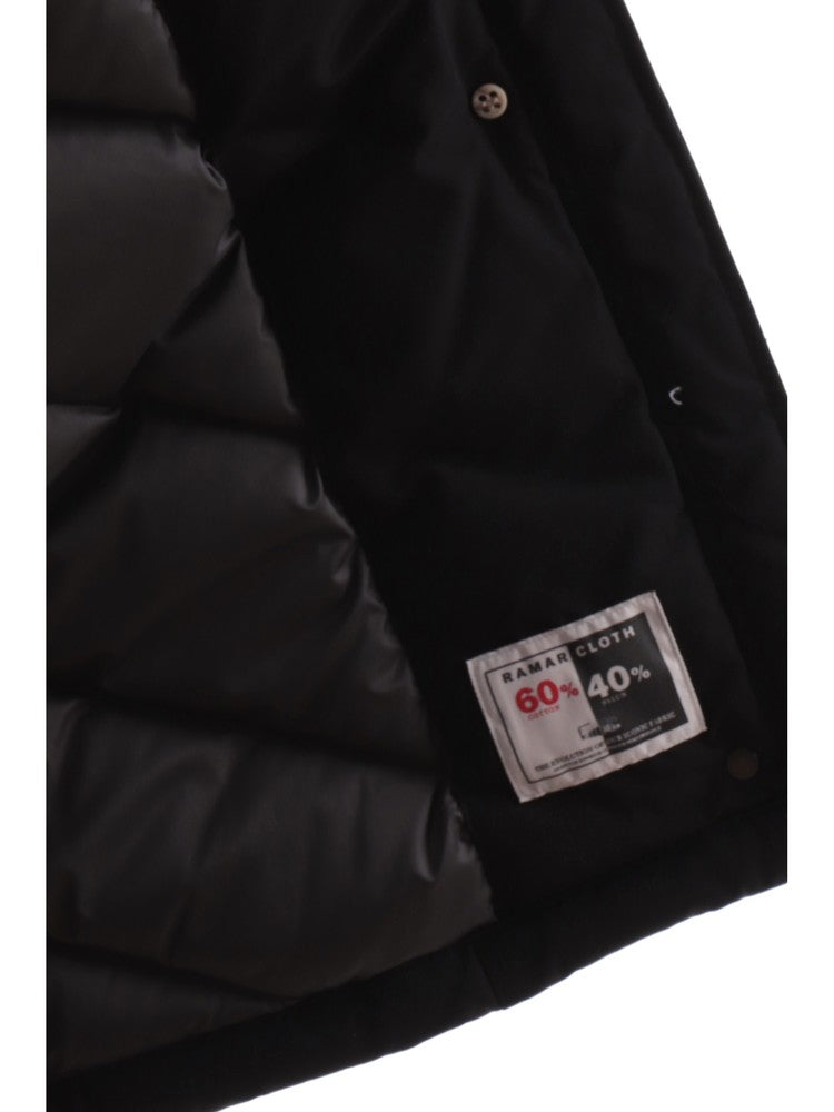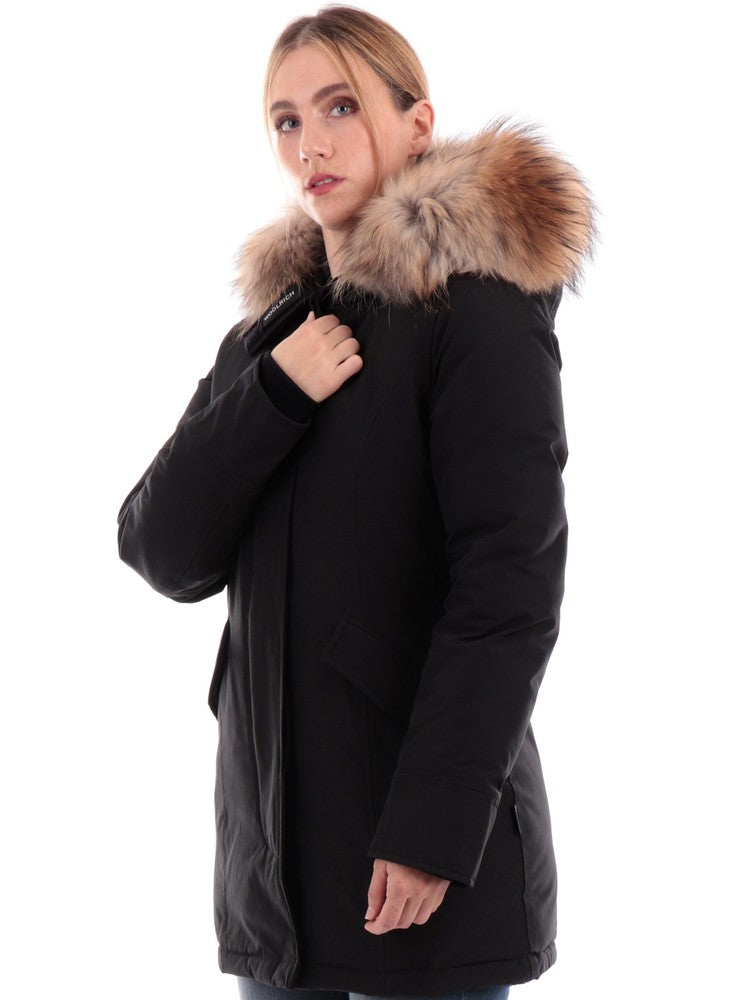 Schwarze Arctic Raccoon Parka-Jacke von Woolrich für Damen, 0538FRUT0001, hergestellt mit natürlicher Daunenfüllung. Dieser schwarze Woolrich-Mantel hat eine feste Kapuze mit Murmasky-Fell, einen Halswärmer mit dem ikonischen Logoetikett mit Klettverschluss, einen zentralen durchgehenden Reißverschluss, der durch eine Knopfleiste verdeckt wird, und zwei große Seitentaschen. Mit dieser Woolrich-Jacke bleiben Sie bis zu einer Temperatur von -20 °C warm.