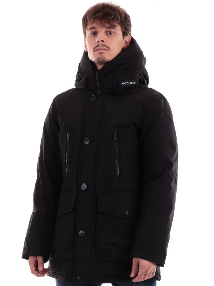 Schwarze Herrenjacke von Woolrich mit per Reißverschluss verlängerbarer Kapuze 0866MRUT0001