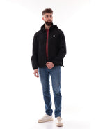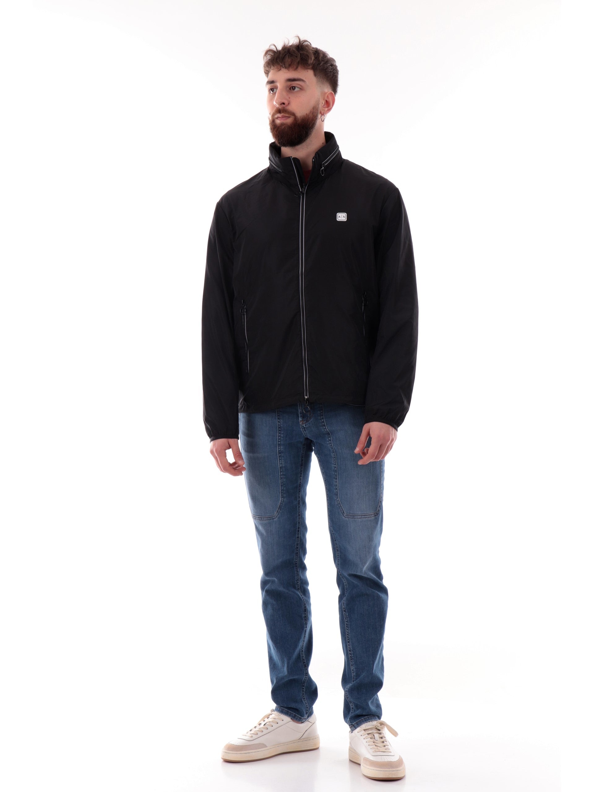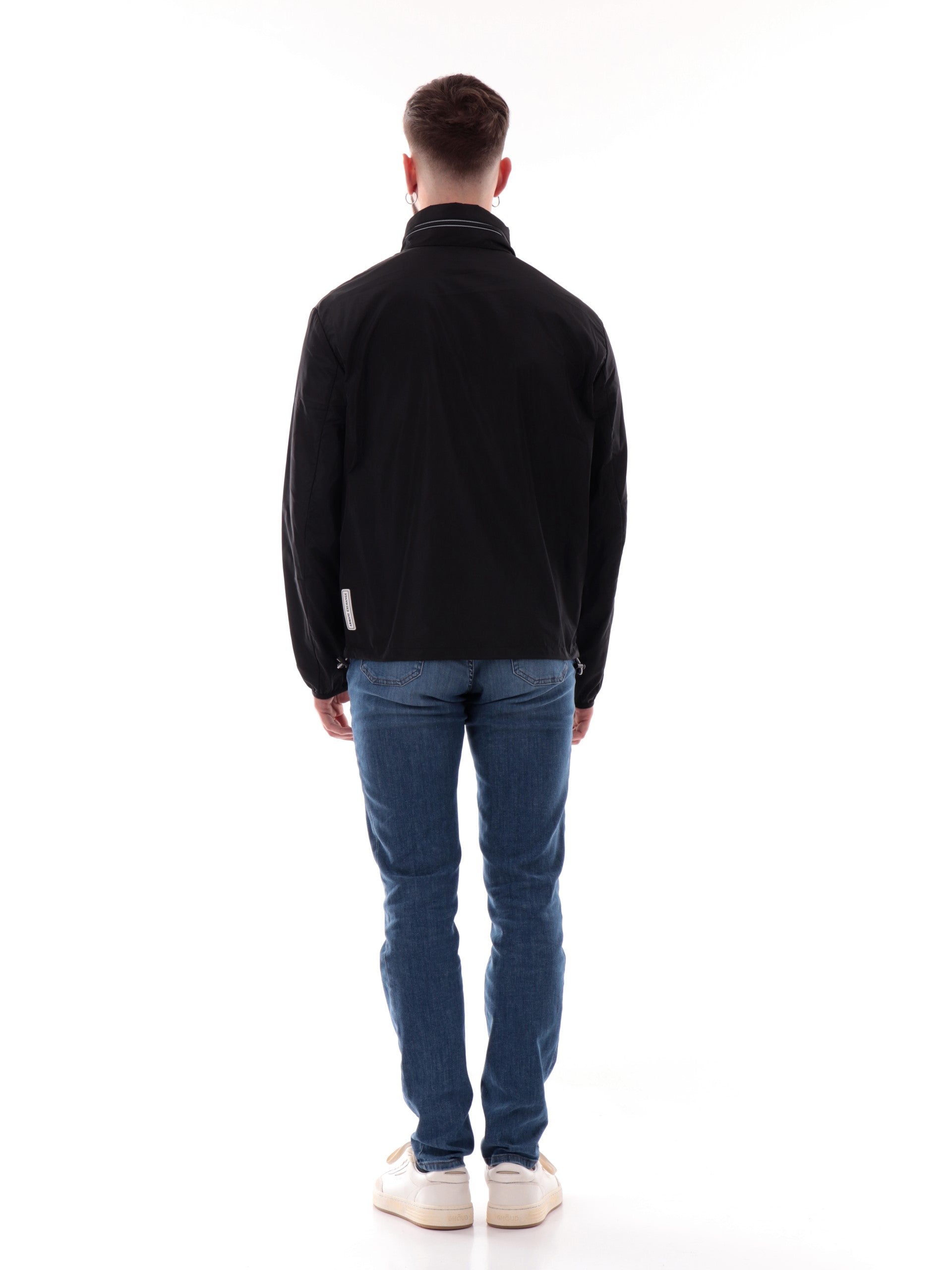 Giubbino Armani Exchange nero da uomo, modello Blouson 8NZB07ZNWFZ, realizzato in morbido tessuto a tinta unita. Questa giacca AX nera ha il cappuccio estraible regolabile con coulisse, lo scaldacollo, la chiusura full zip centrale con doppio cursore, due tasche laterali con zip e il fondo regolabile con coulisse. Patch gommato sul cuore.