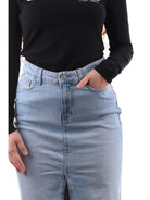 Tiffosi Damen-Jeansrock Stefani 2 10054514, aus weicher Baumwolle. Dieser Tiffosi-Rock hat einen Logo-Knopf und einen Reißverschluss, zwei offene Seitentaschen, zwei Leistentaschen hinten und einen geteilten Saum mit Fransen.