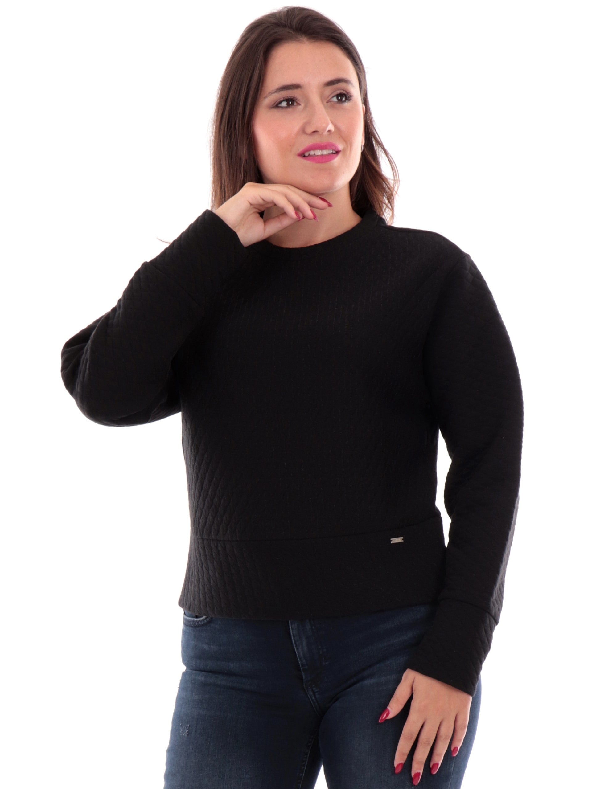 Maglia Armani Exchange nera da donna 6DYM44YJHHZ, realizzata in morbida felpa di cotone con fili lurex. Questa maglia AX nera ha il girocollo, le maniche lunghe, il fondo regolare e il logo metallicodel brand cucito sul fondo.