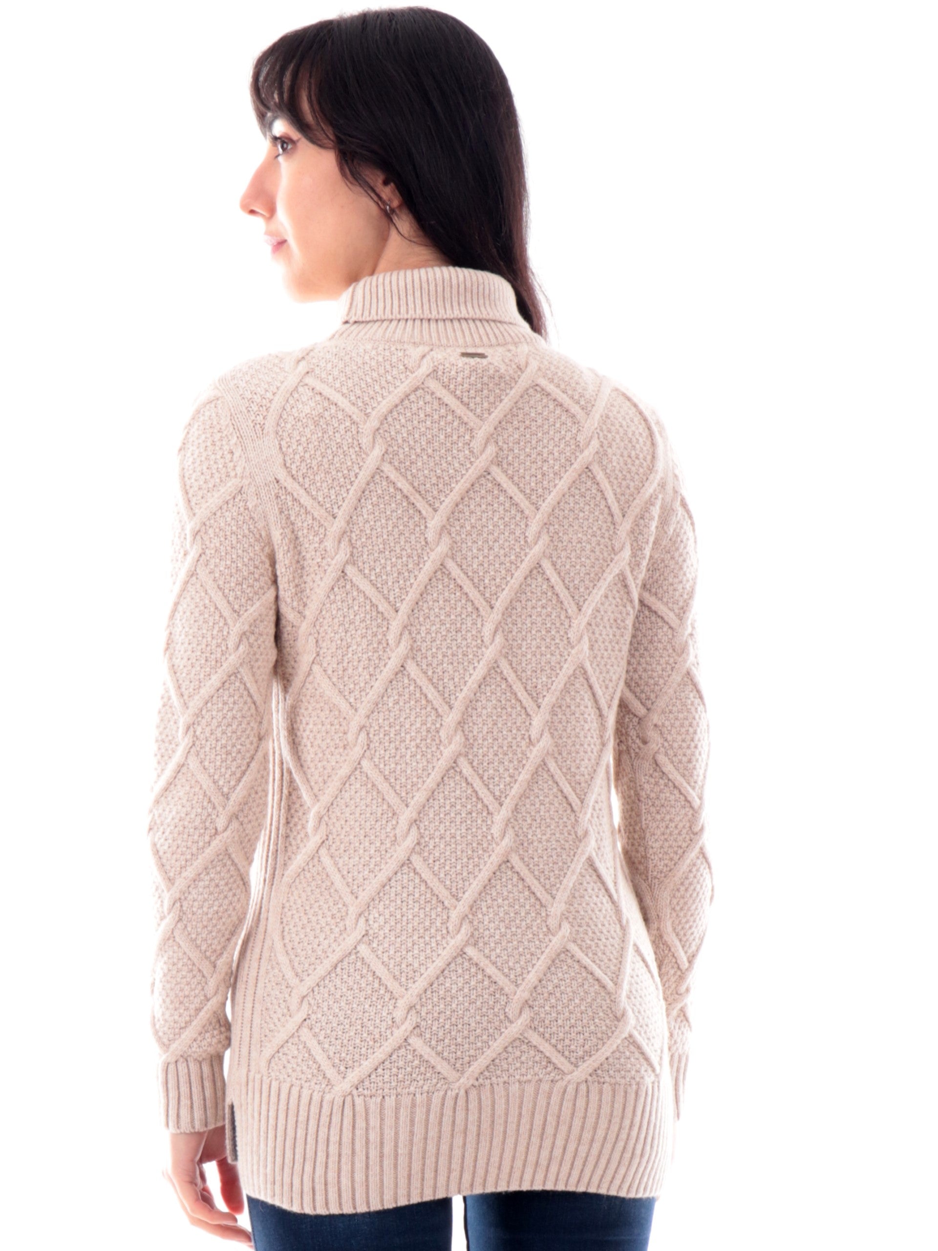 Maglione beige da donna Barbour BURNE ROLL NECK KNIT. Questo maglione beige Barbour è realizzato da un tessuto caldo ed avvolgente perfetto per la stagione invernale ed è realizzato dallla fantasia aquadri. Questo maglione è caratterizzato dal dolcevita, fantasia a quadri all over, polsini e fondo elasticizzati a costine. Questo maglione Barbour da donna è perfetto sopra un jeans