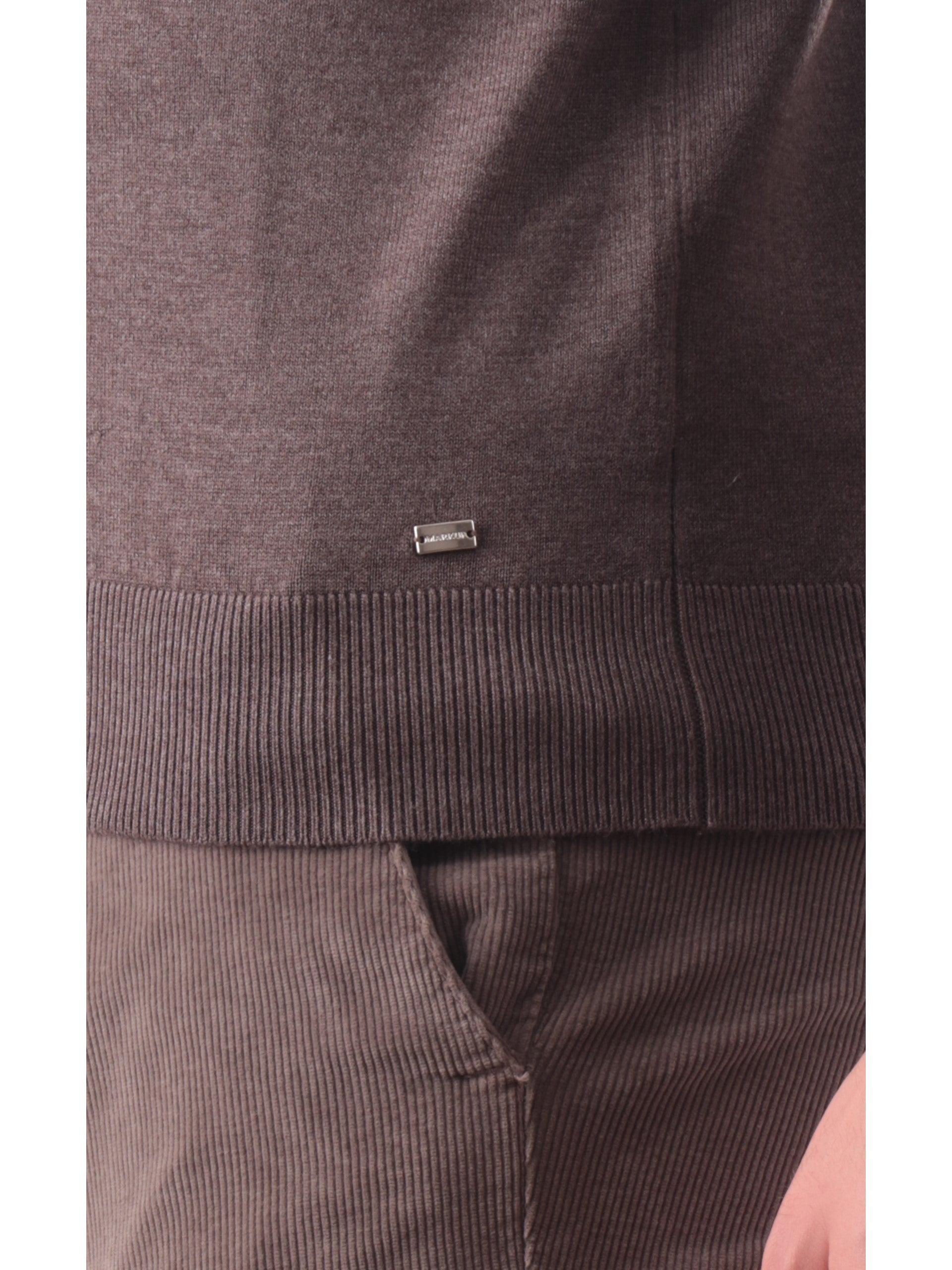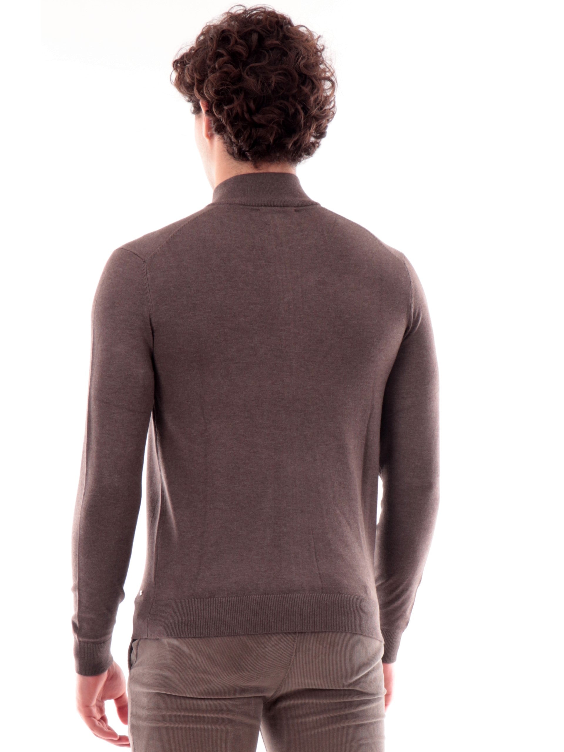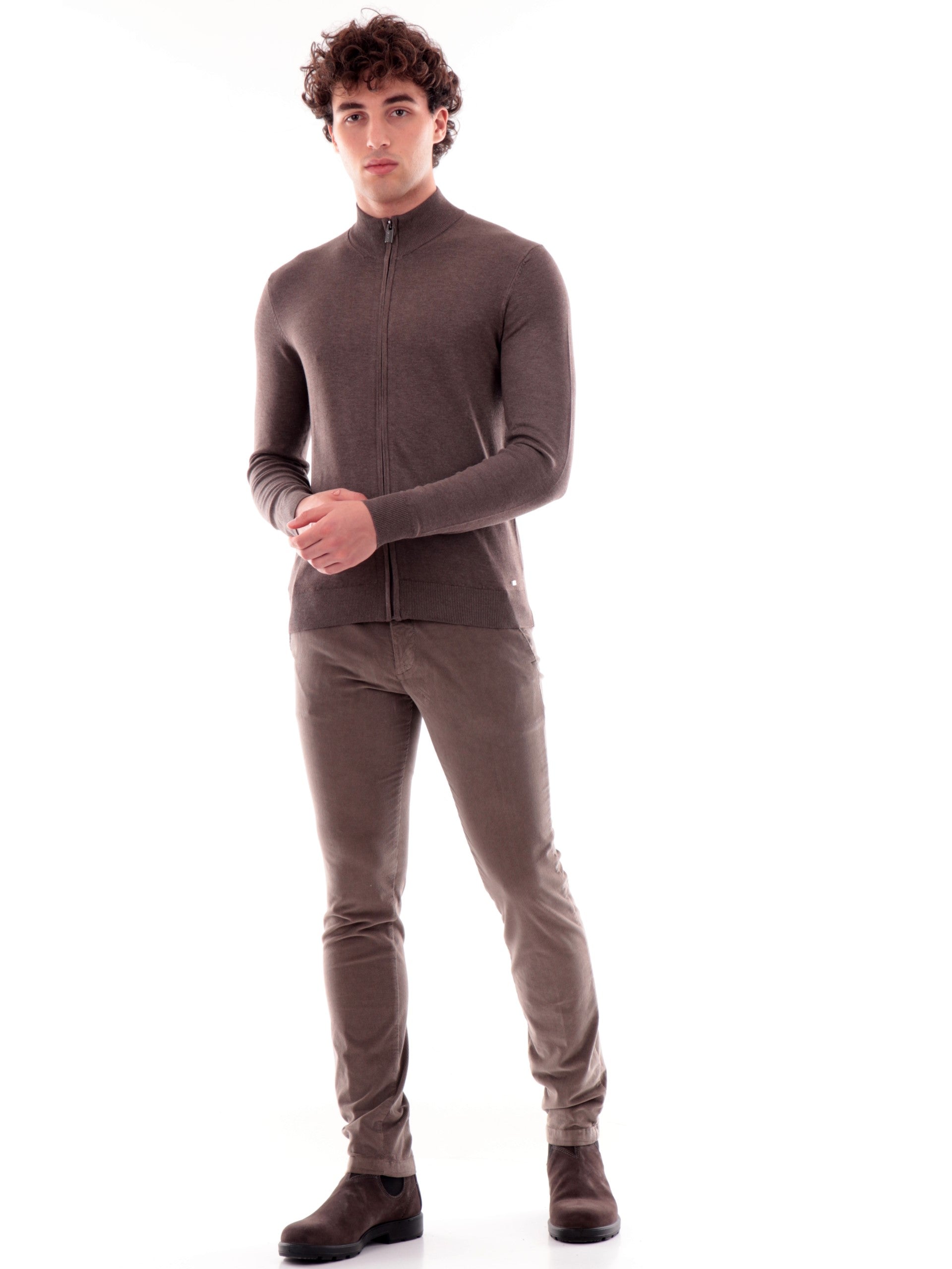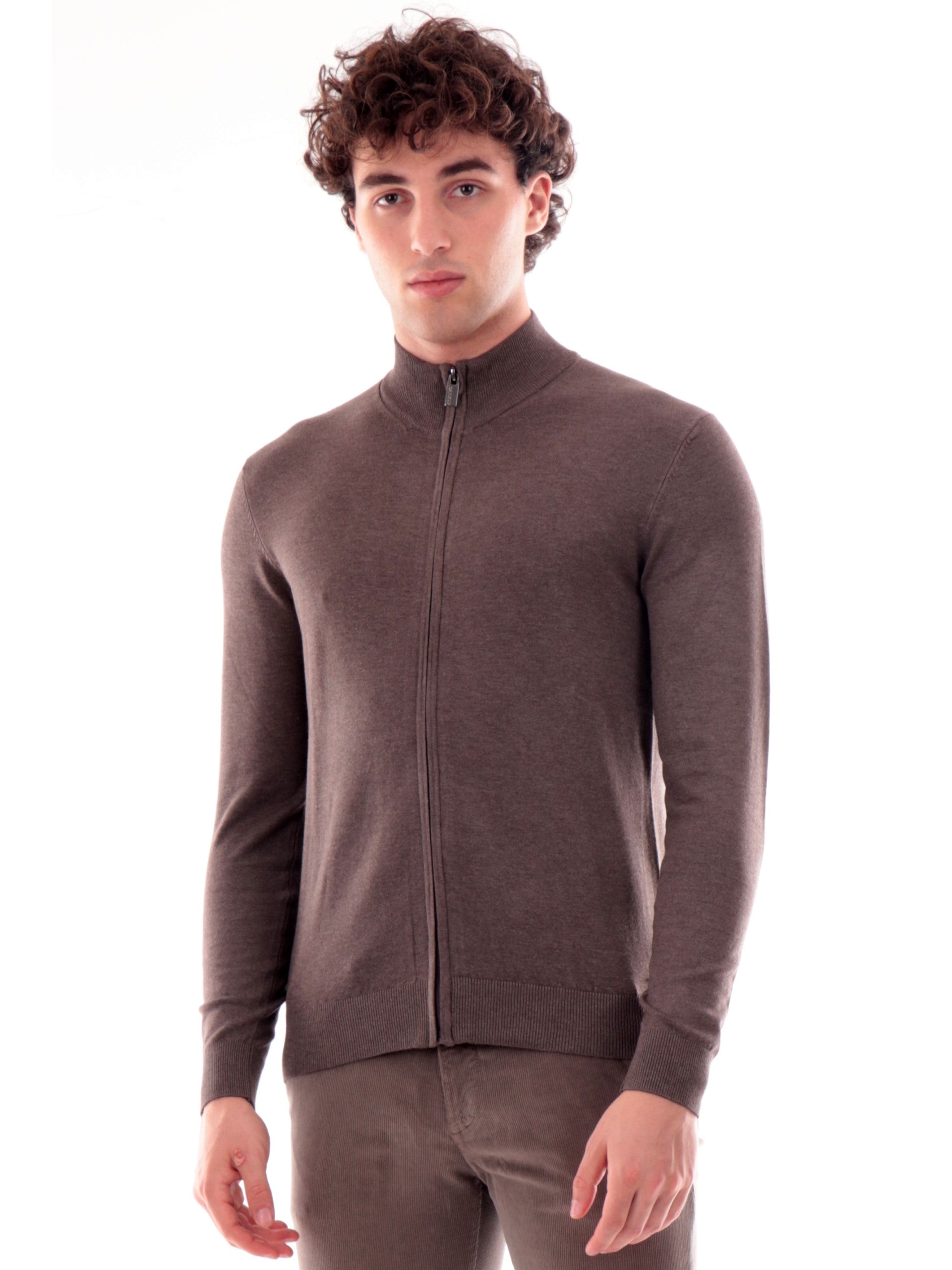 Maglione cardigan Markup marrone da uomo full zip viscosa MK20016. Questo cardigan Markup marrone ha il collo alto, la chiusura full zip centrale, il logo del brand applicato sul fondo a contrasto colore, polsini e fondo elasticizzati a costine.