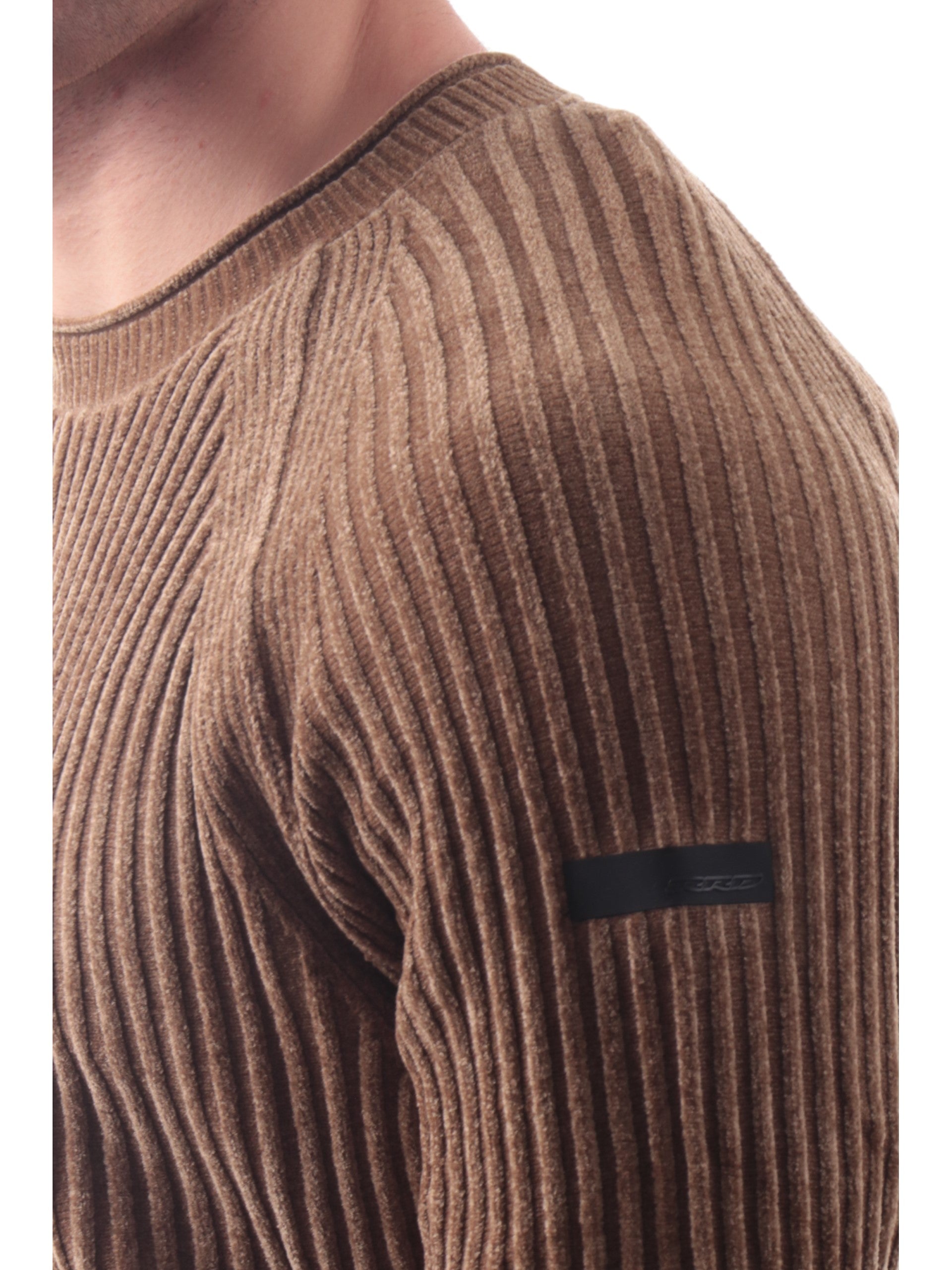Maglione RRD velluto marrone da uomo girocollo VELVET RAVE ROUND. Questo maglione uomo RRD a costine girocollo marrone ha le maniche lunghe, il patch del brand applicato sulla manica sinistra a contrasto colore, polsini e fondo elasticizzati a costine.