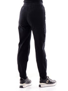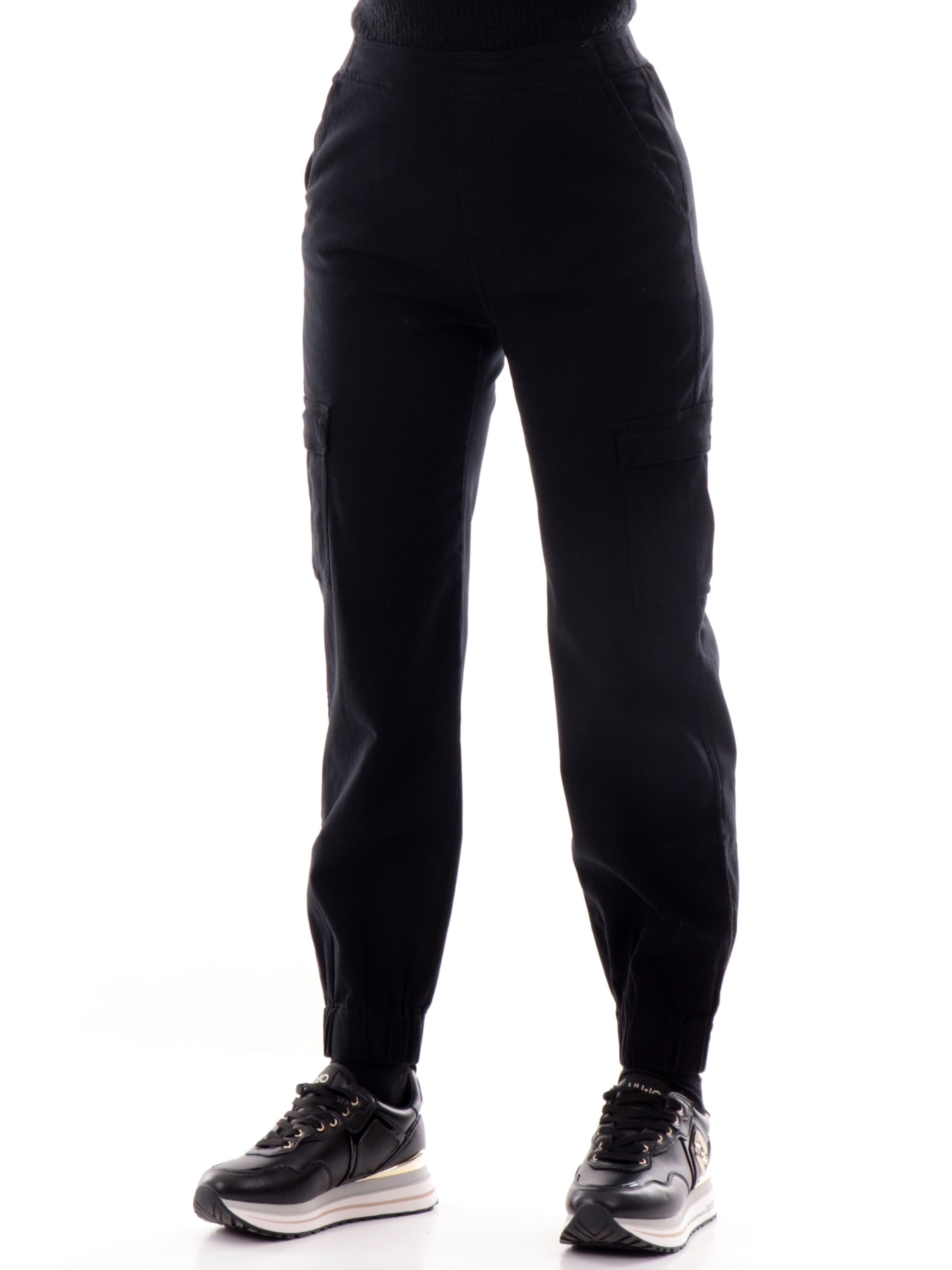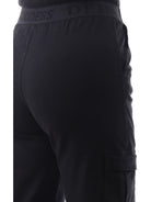 Pantaloni cargo nero da donna Deha. Questi pantaloni cargo comodi e morbidi al tatto sono realizzati in cotone ed sono caratterizzati da due tasche oblique aperte e due tasche con patta, in vita hanno la banda elastica e il fondo elasticizzato