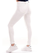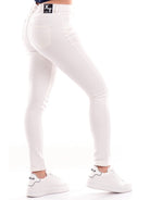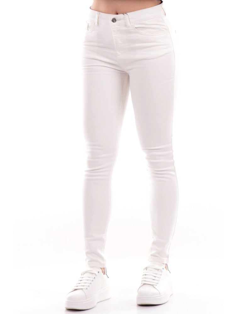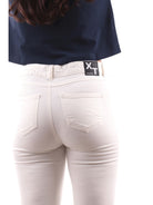 Weiße Damen-Jeanshose von XT Studio, Skinny-Modell SV1001W61501, aus weicher Baumwolle. Diese weißen XT Studio-Hosen haben ein Gummiband in der Taille, einen Knopf- und Reißverschluss, zwei offene Seitentaschen (eine davon mit Tasche), Möglichkeit zum Tragen eines Gürtels, zwei offene Gesäßtaschen und einen normalen Hosenbund.