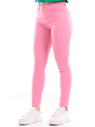 Rosa Damen-Jeanshose von XT Studio, Skinny-Modell SV1001W61501, aus weicher Baumwolle. Diese rosa XT Studio-Hose hat ein Gummiband in der Taille, einen Knopf- und Reißverschluss, zwei offene Seitentaschen (eine davon mit Tasche), Möglichkeit zum Tragen eines Gürtels, zwei offene Gesäßtaschen und einen normalen Hosenbund.