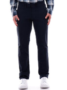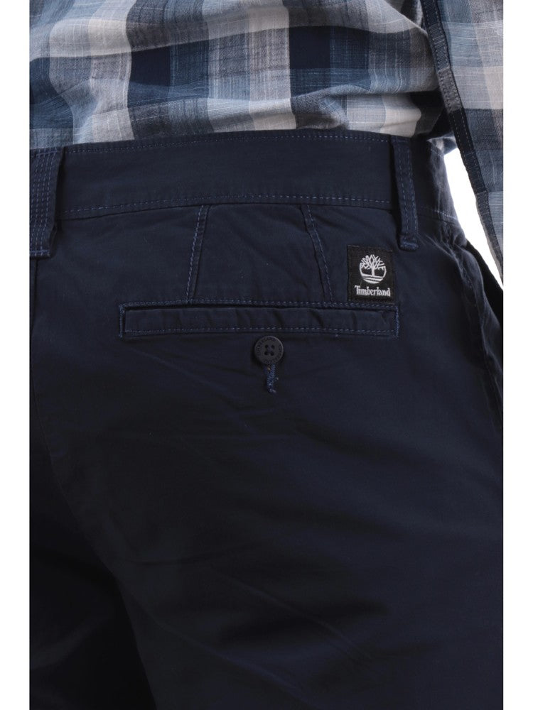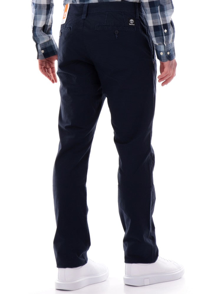 Blaue Herren-Chinohose TB0A5TU von Timberland aus weicher Baumwolle. Diese blauen Timberland-Hosen haben einen Logo-Knopf und einen Reißverschluss, zwei offene Seitentaschen mit schrägen Schnitten, zwei Leistentaschen hinten und einen normalen Saum.