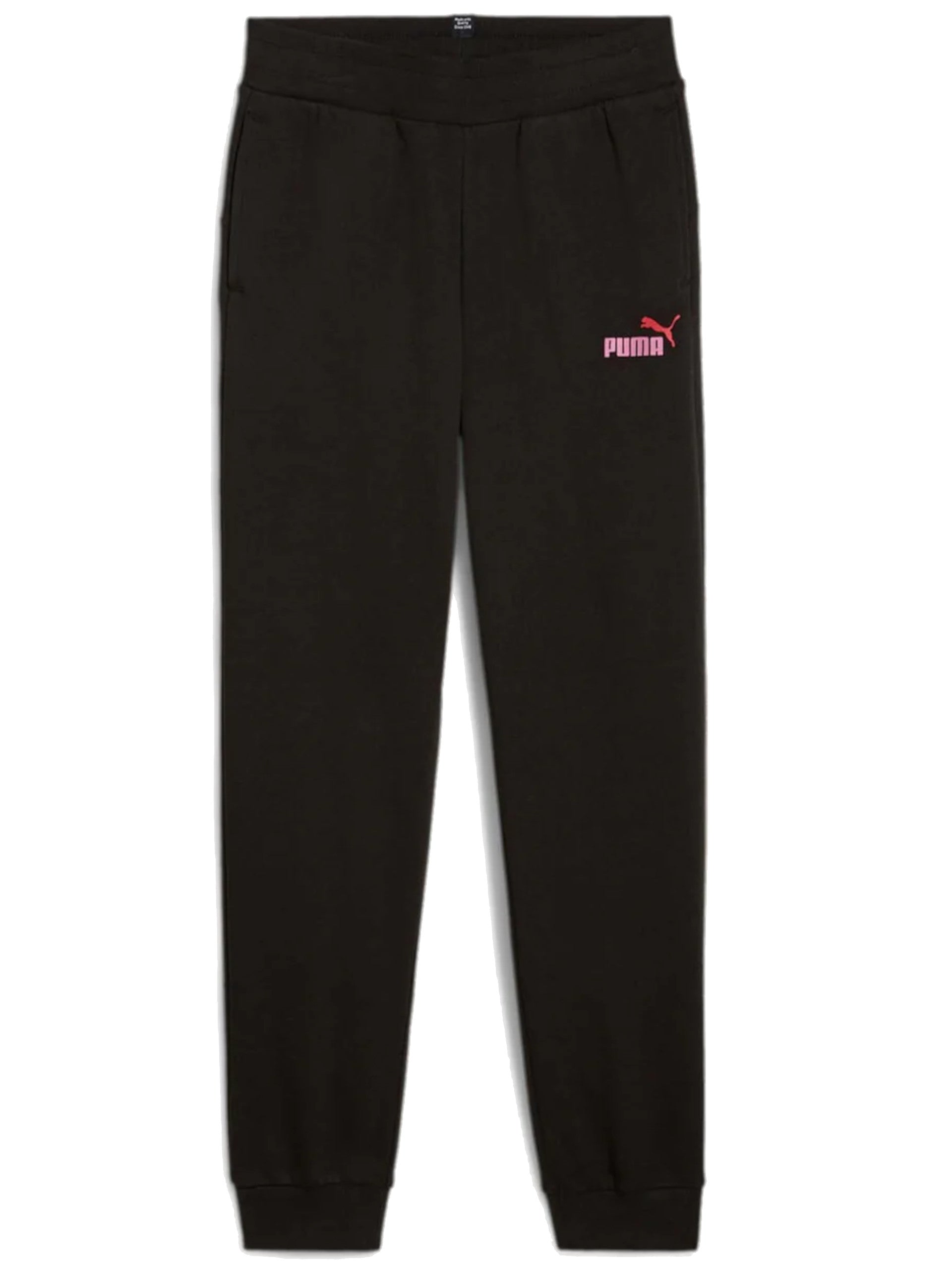 Pantaloni tuta Puma neri da bambina 627922. Questi pantaloni tuta Puma neri hanno la banda elastica sul punto vita regolabile con laccetti, due tasche laterali aperte, la stampa del brand applicata sulla gamba sinistra e polsini elasticizzati.