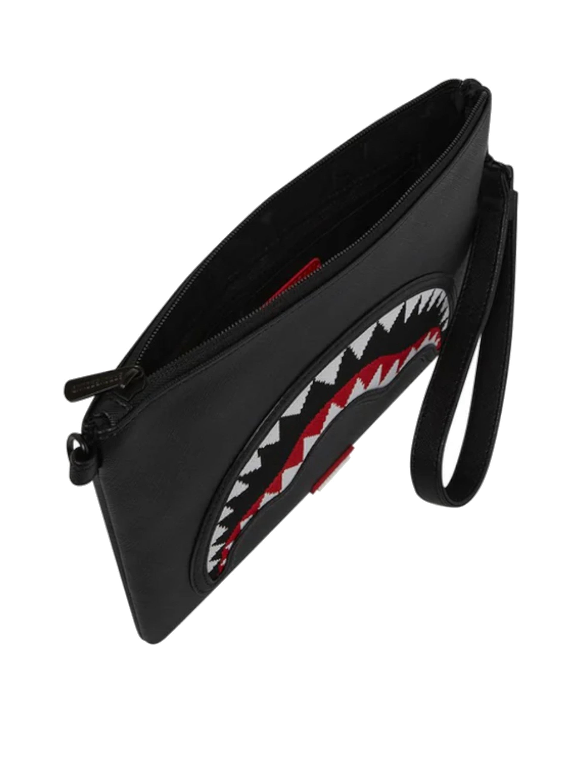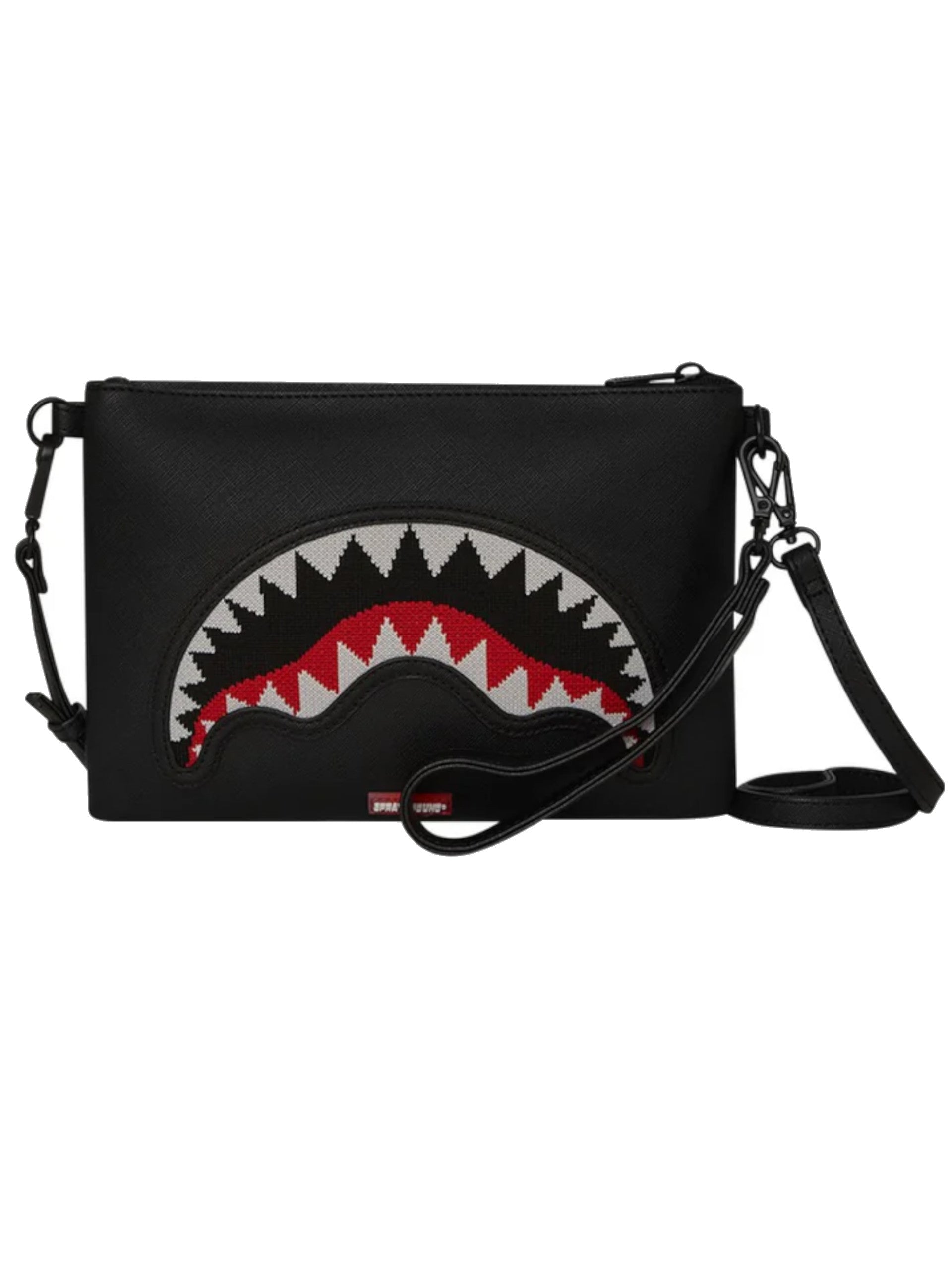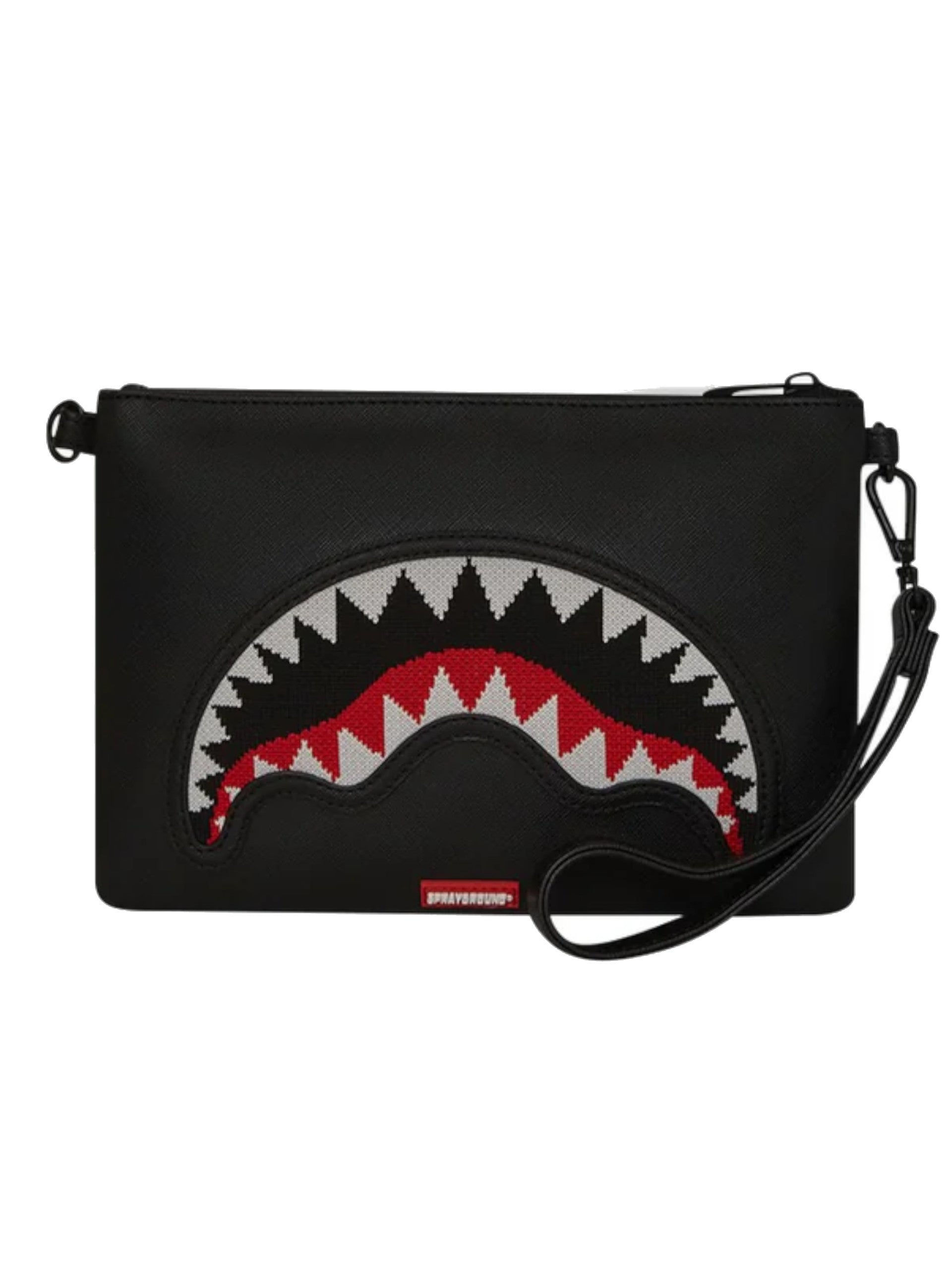 Pochette Sprayground Fly Knit Mouth Crossover nera con tracolla 910B8028. Questa borsa Sprayground nera ha la chiusura full zip centrale, un laccio rimovibile che agevola la presa, la tracolla rimovibile e regolabile e la stampa bocca dello squalo. All'interno di questo borsello Sprayground troviamo un unico grande scomparto con una tasca interna con zip.