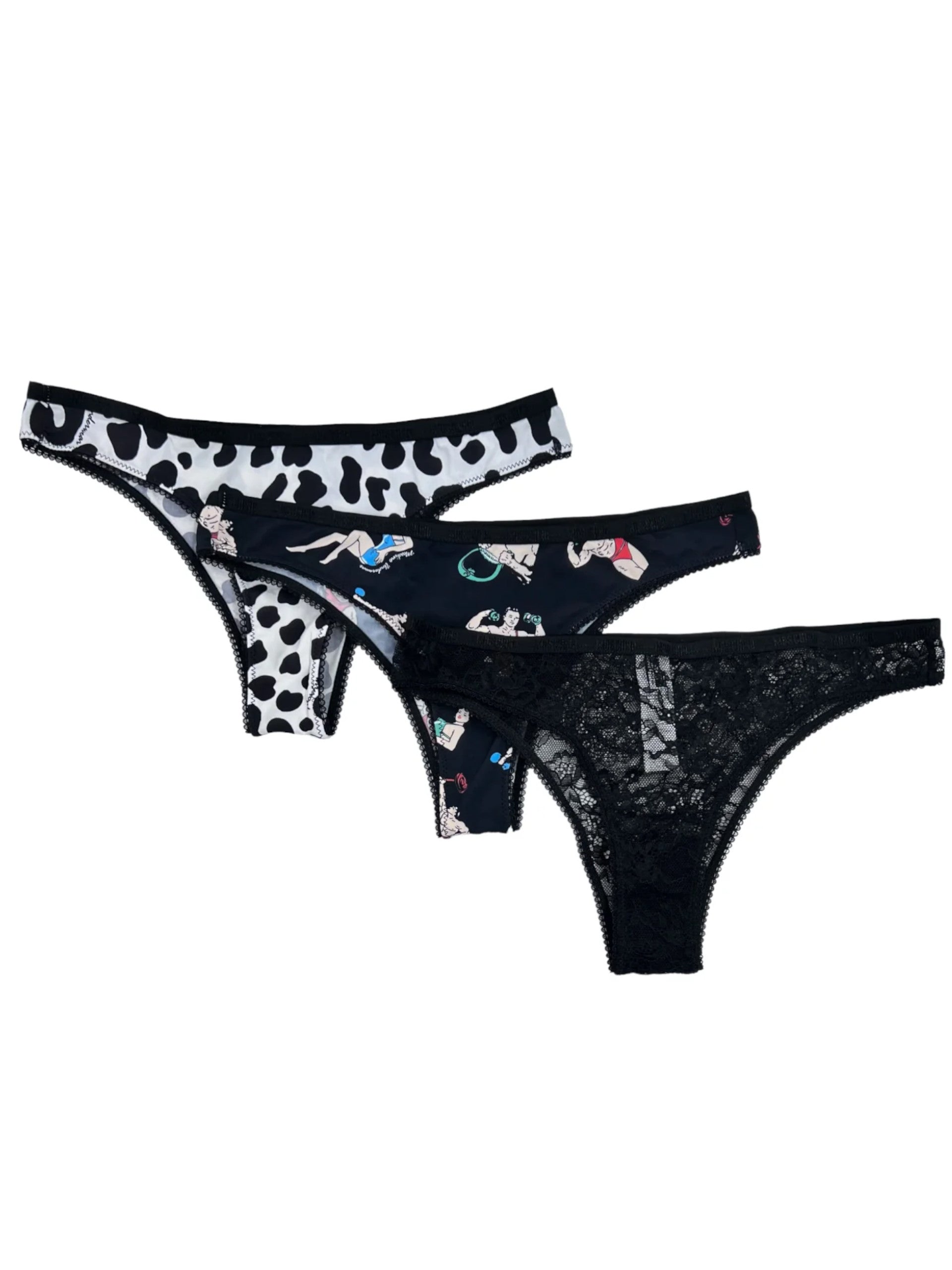Set intimo Moschino Love tre perizoma neri da donna 23025310A. Questo set intimo Moschino Love ha tre slip neri a fantasia.