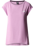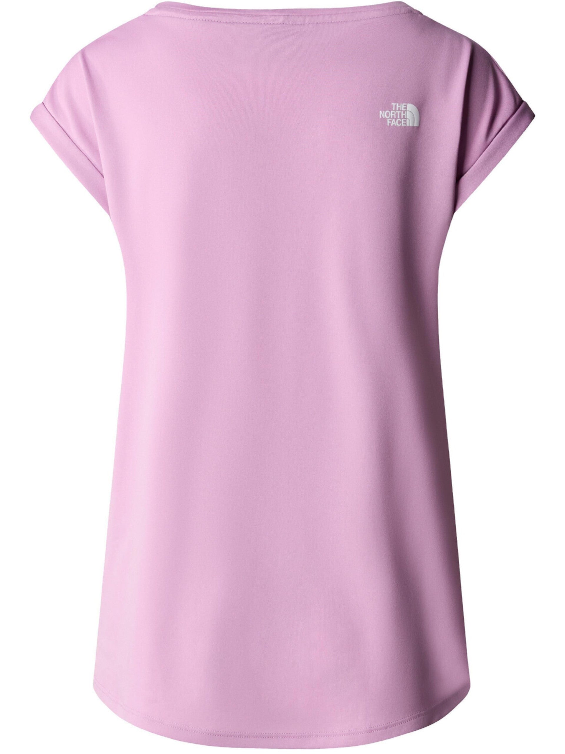 Lilafarbenes Damen-T-Shirt NF0A2S7F von The North Face aus atmungsaktivem technischem Stoff. Dieses fliederfarbene Trekkinghemd von North Face hat Flügelärmel mit Manschetten, einen asymmetrischen Saum und das Markenlogo in einer Kontrastfarbe auf dem Herzen aufgedruckt.