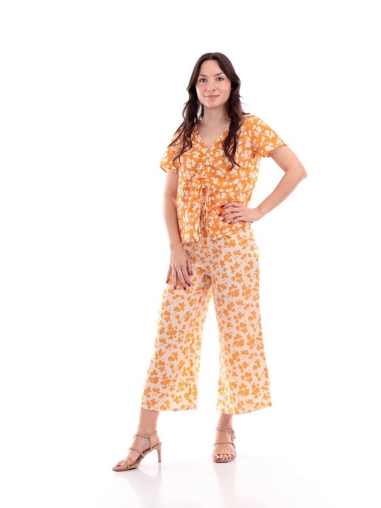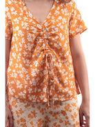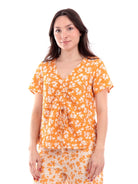 Orangefarbenes Tiffosi-Damen-T-Shirt mit Ausschnitt, Daffodil-Modell 10049373. Dieses orangefarbene Tiffosi-Shirt hat einen V-Ausschnitt, kurze Ärmel, ein durchgehendes Blumenmuster in einer Kontrastfarbe und einen verstellbaren Gummizug vorne mit Schnürsenkeln.