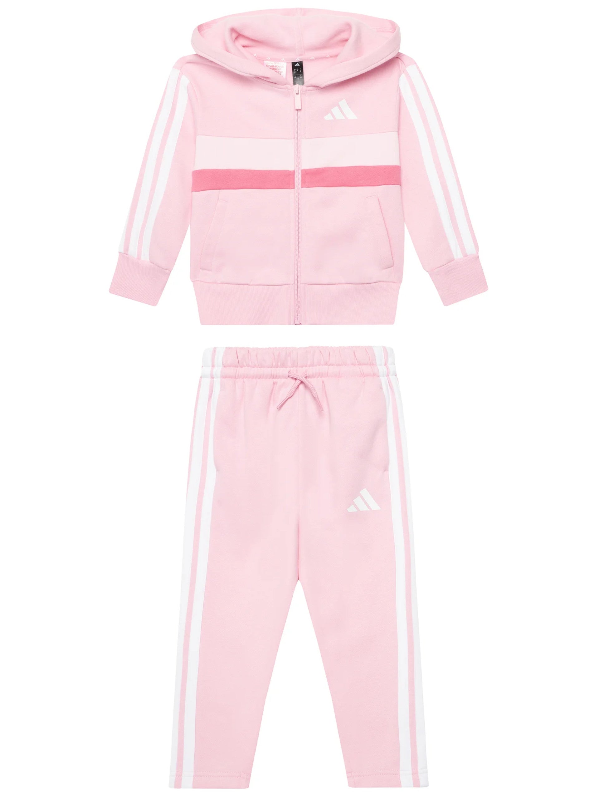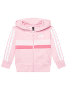 Tuta Adidas rosa da bambina cotone felpato . La felpa di questa tuta Adidas con il cappuccio ha le maniche lunghe, la stampa Adidas bianca, la chiusura con zip e i polsini e fondo elasticizzati. I pantaloni di questa tuta Adidas hanno la banda elastica sul punto vita regolabile con laccetti, due tasche, polsini elasticizzati e il logo Adidas bianco.