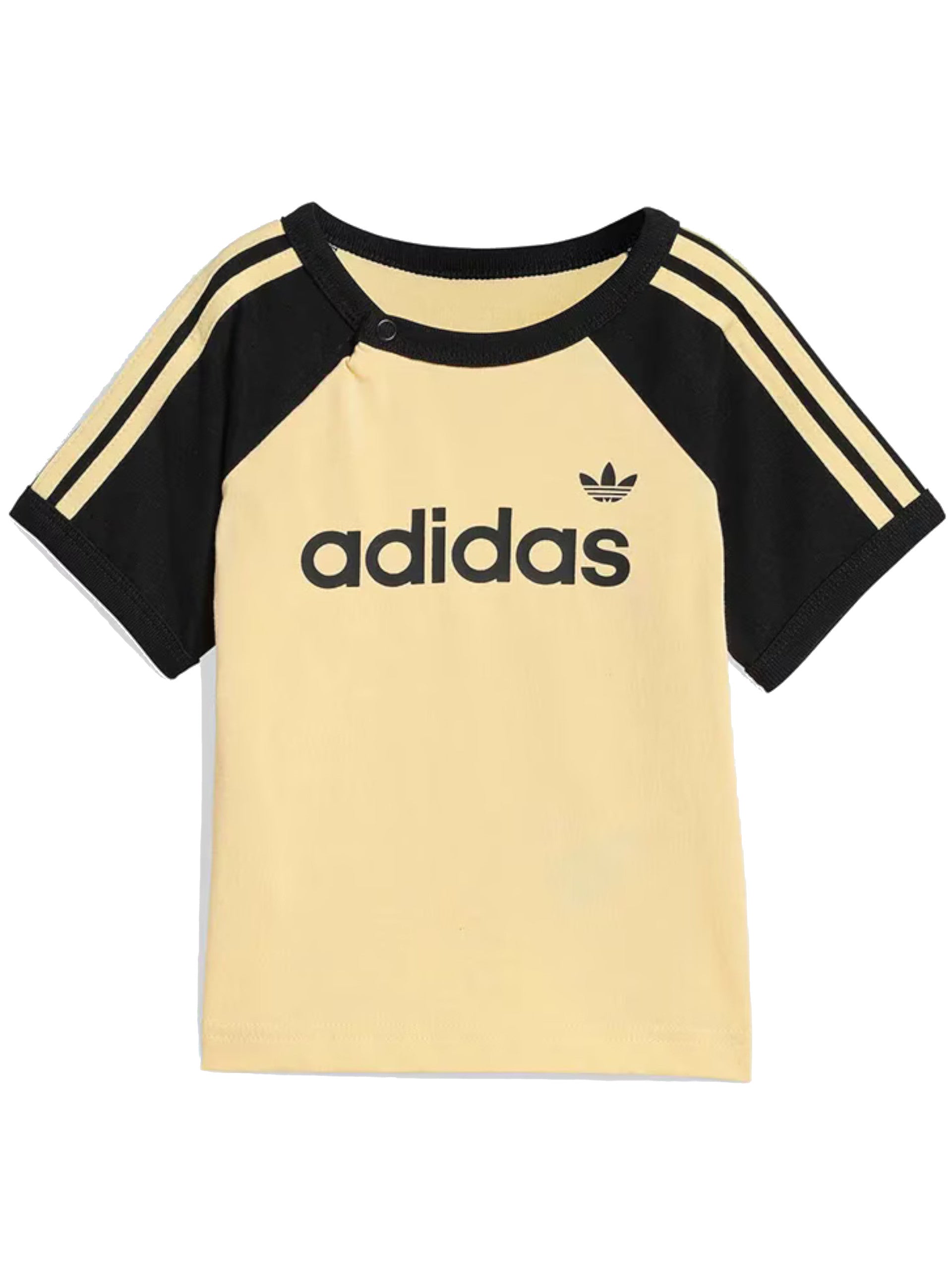 Tuta bambino Adidas giallo. Questa tuta adidas, realizzata 100% in puro cotone, è caratterizzata dalla T-shirt e dal pantaloncino. Questa T-shirt è caratterizzata da girocollo con bottoni, maniche corte con 3stripes e la maxi scritta Adidas applicata sul davanti. Questo pantaloncino ha la banda elastica sul punto vita regolabile con i lacci, 3stripes ai lati e il logo del brand applicato in bassoa sinistra