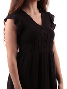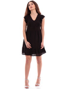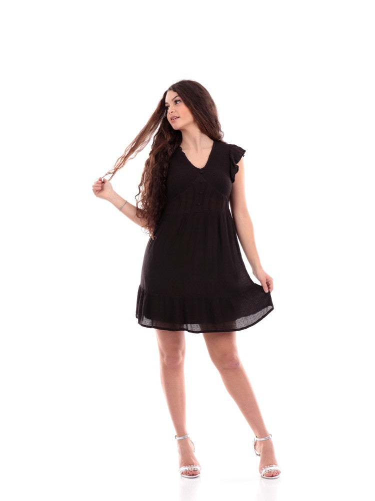 Schwarzes, ausgestelltes Damenkleid mit elastischem Bund am Rücken und V-Ausschnitt. Dieses kleine Schwarze für Damen zeichnet sich durch einen ausgestellten Saum, einen Unterrock, der es nicht transparent macht, und Schmetterlingsärmel aus.