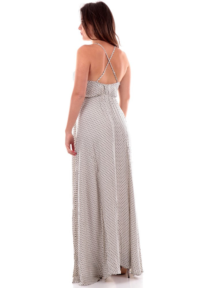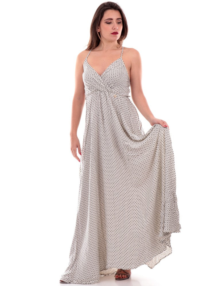 Weißes, schulterfreies Kleid von Yes Zee für Damen, A467CN002, aus 100 % Viskose. Dieses weiße Kleid von Yes Zee hat verstellbare Träger, offene Schultern, einen ausgestellten Saum und ein Geomuster.
