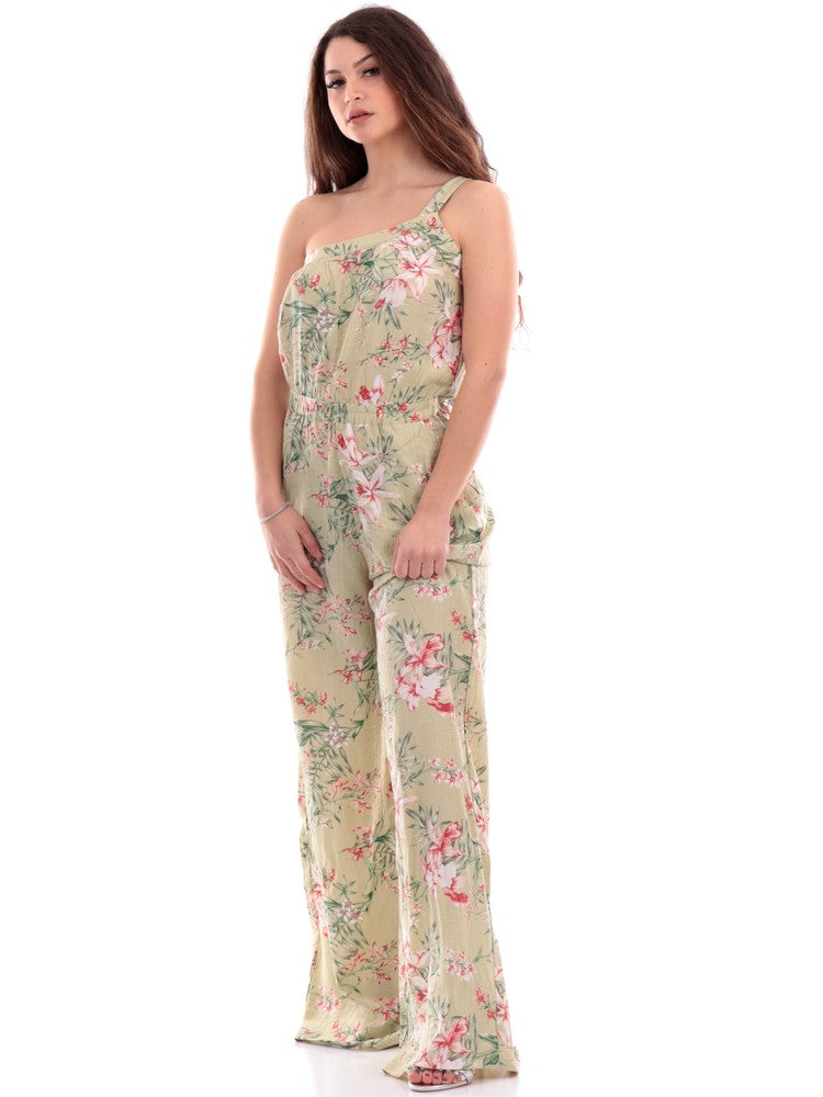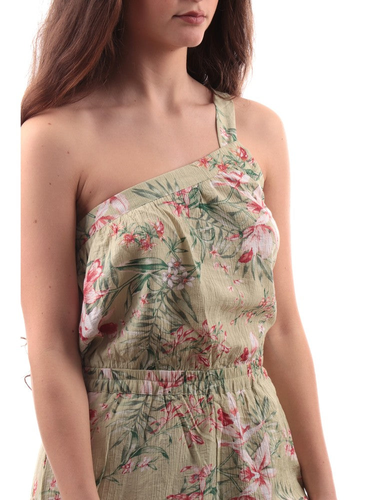 Tiffosi grünes Damen-Trainingsanzugkleid Wadi 1 10054899, aus weicher Viskose. Dieses grüne Tiffosi-Kleid hat ein Gummiband an der Taille, einen einzelnen Träger und ein durchgehendes Blumenmuster in einer Kontrastfarbe.