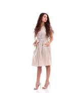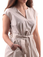 Beigefarbenes Woolrich-Damenkleid mit Taille und V-Ausschnitt. Dieses beige Woolrich-Damenkleid zeichnet sich durch einen ausgestellten Saum, einen Unterrock, der es nicht transparent macht, und Schmetterlingsärmel aus.