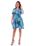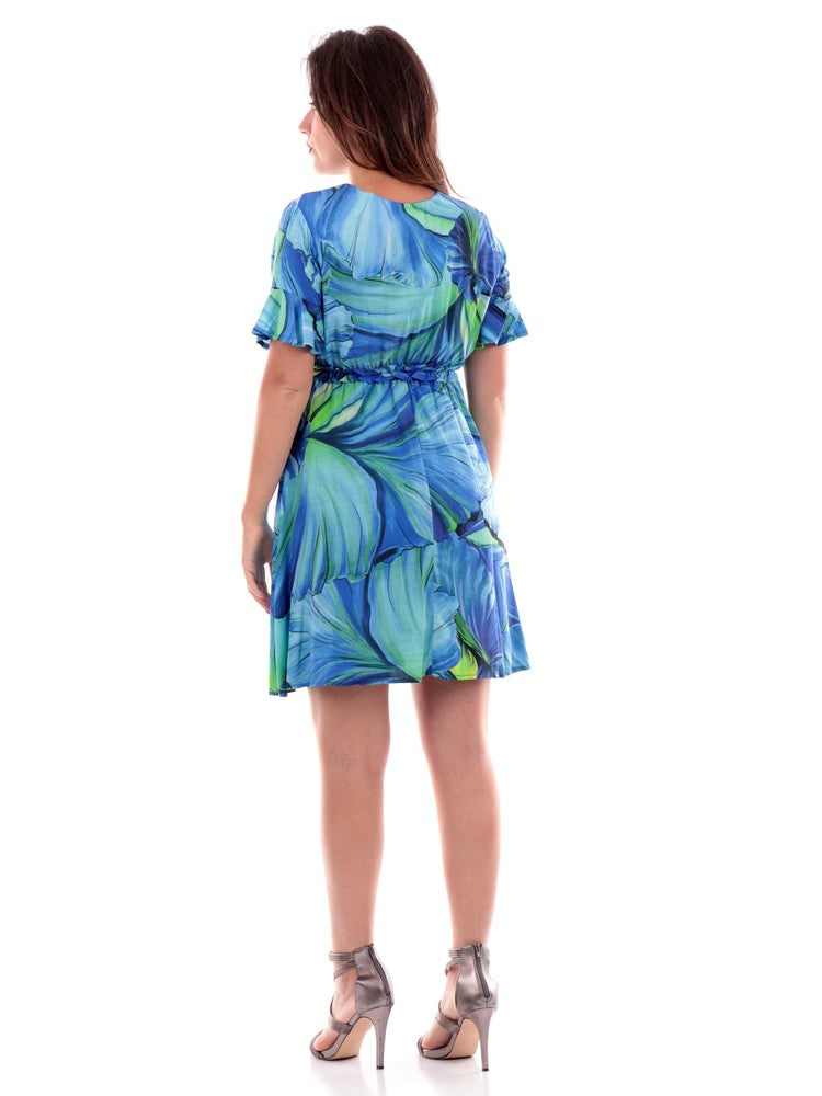 Yes Zee blaues Kleid mit Crossover-Ausschnitt für Damen A252CI002, aus 100 % reiner Baumwolle. Dieses blaue Kleid von Yes Zee hat einen V-Ausschnitt, Rüschenärmel, ein durchgehendes Blumenmuster in einer Kontrastfarbe und einen ausgestellten Saum.