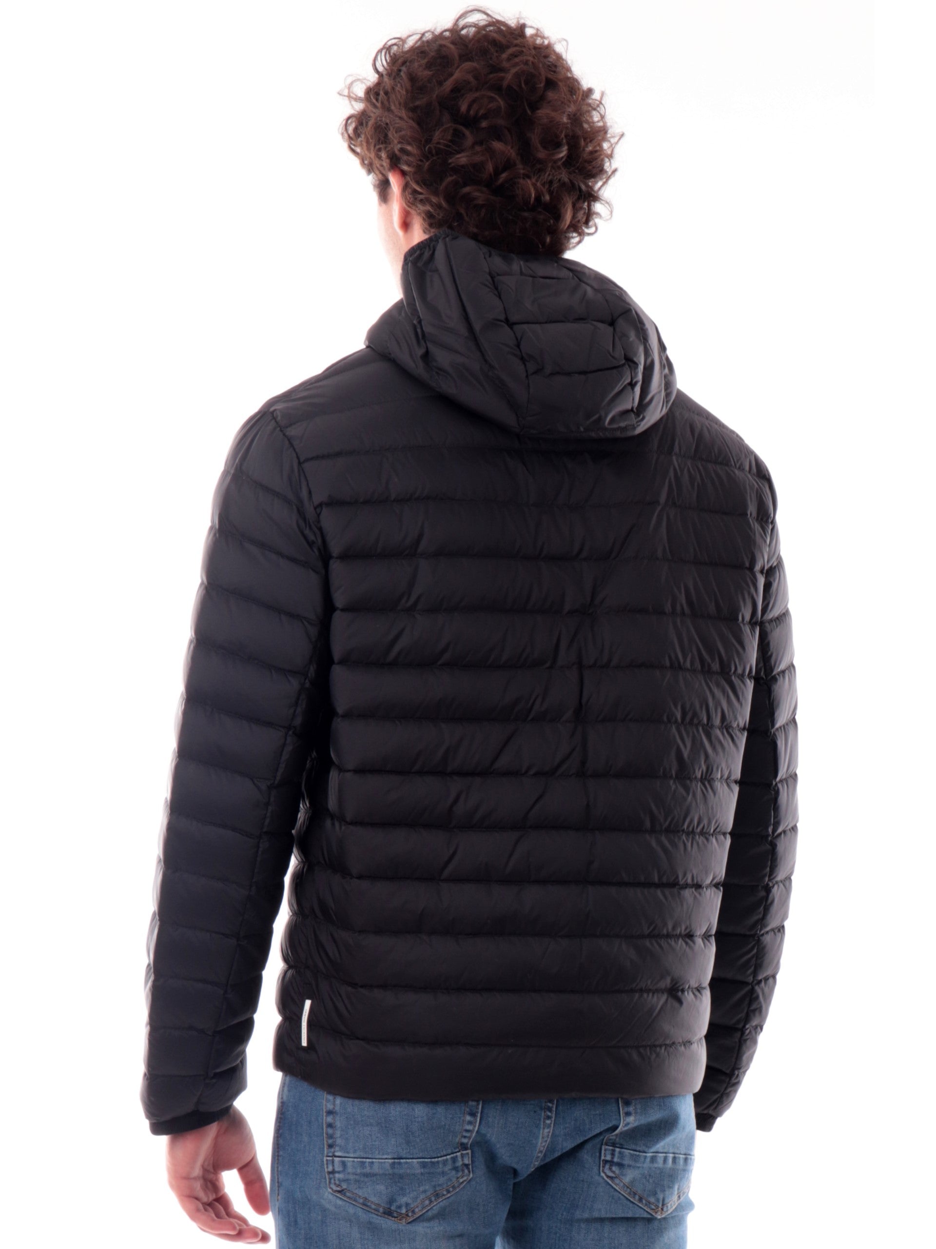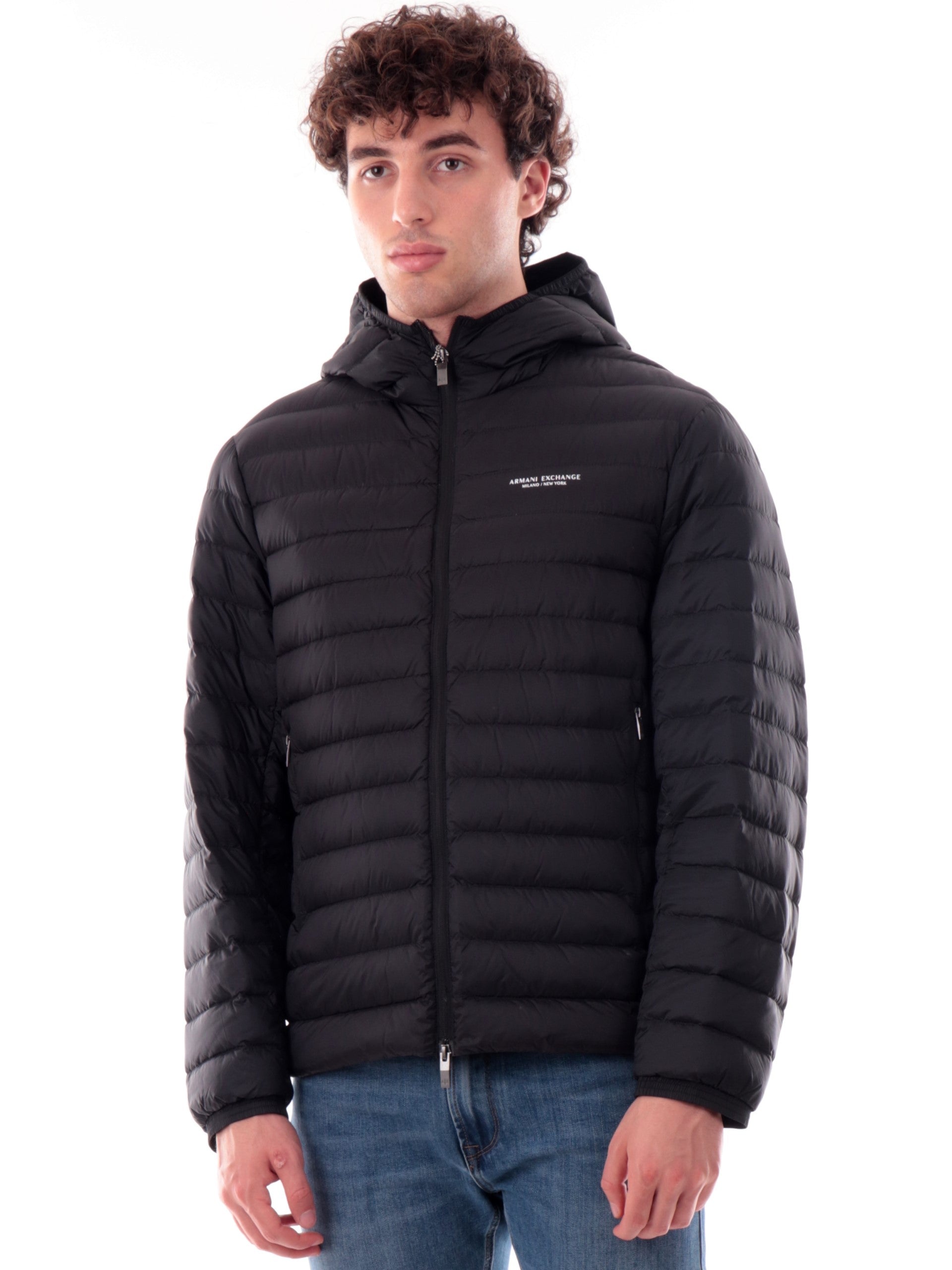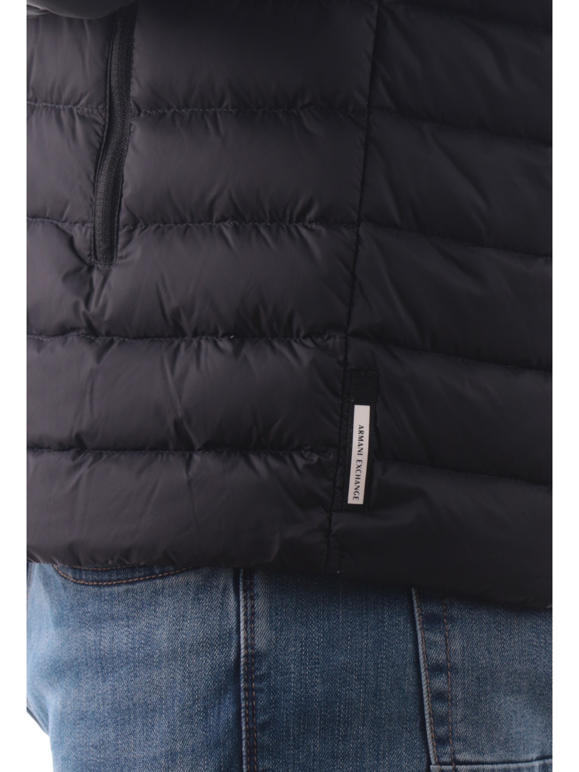 Giacca Armani Exchange AX nera da uomo full zip con cappuccio XM001577AF16927, realizzata con imbottitura in piuma naturale. Questo giubbino AX nero ha il cappuccio fisso con banda elastica, la chiusura full zip centrale, due tasche laterali con zip e il logo Armani lato cuore.