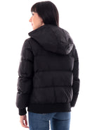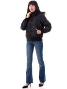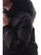 Piumino Armani Exchange AX nero da donna realizzato con imbottitura in vera piuma. Questo piumino AX nero ha il cappuccio removibile, la chiusura full zip centrale, due tasche laterali con zip, polsini e fondo elasticizzati e il logo del brand sulla manica sinistra.