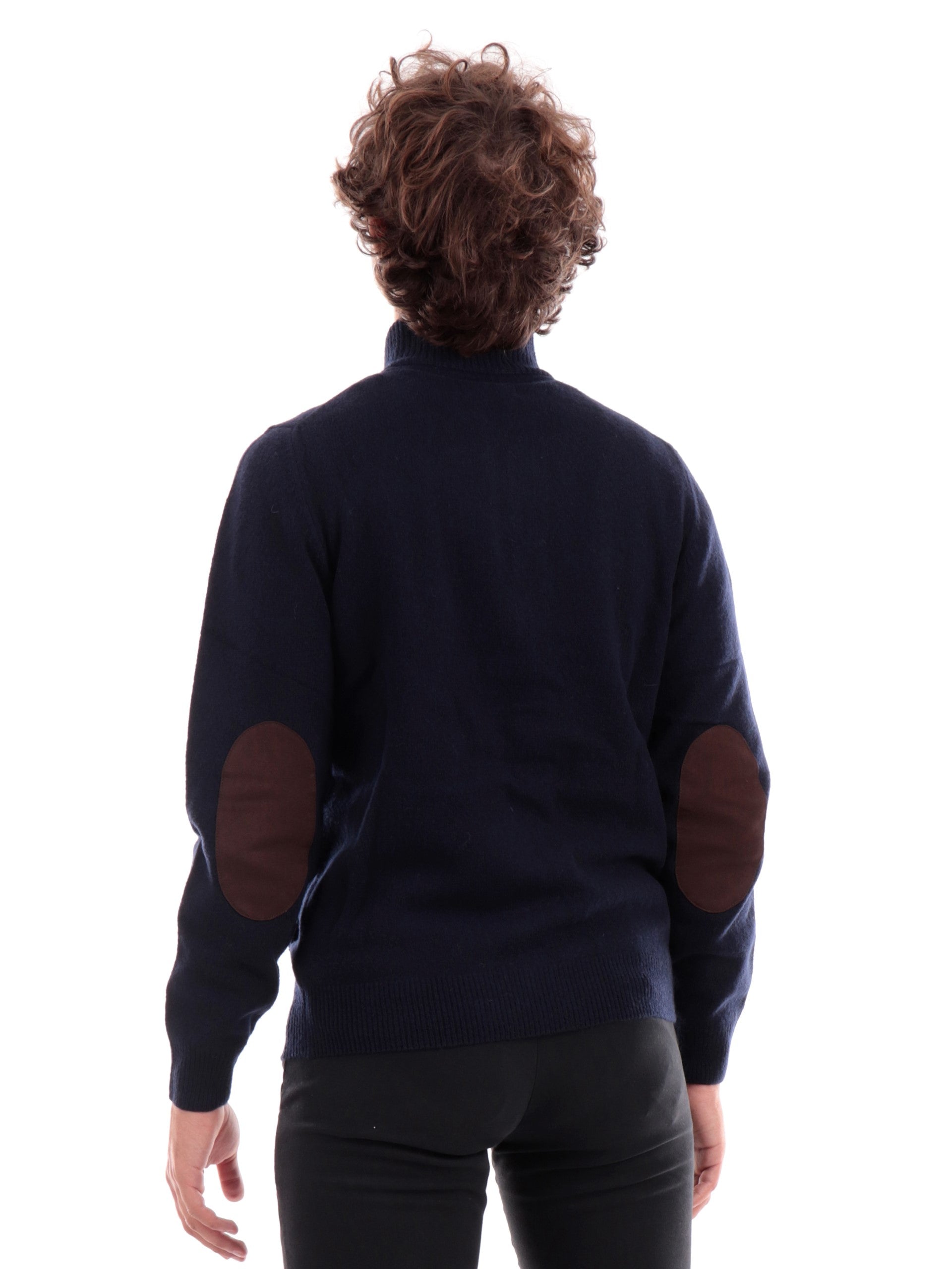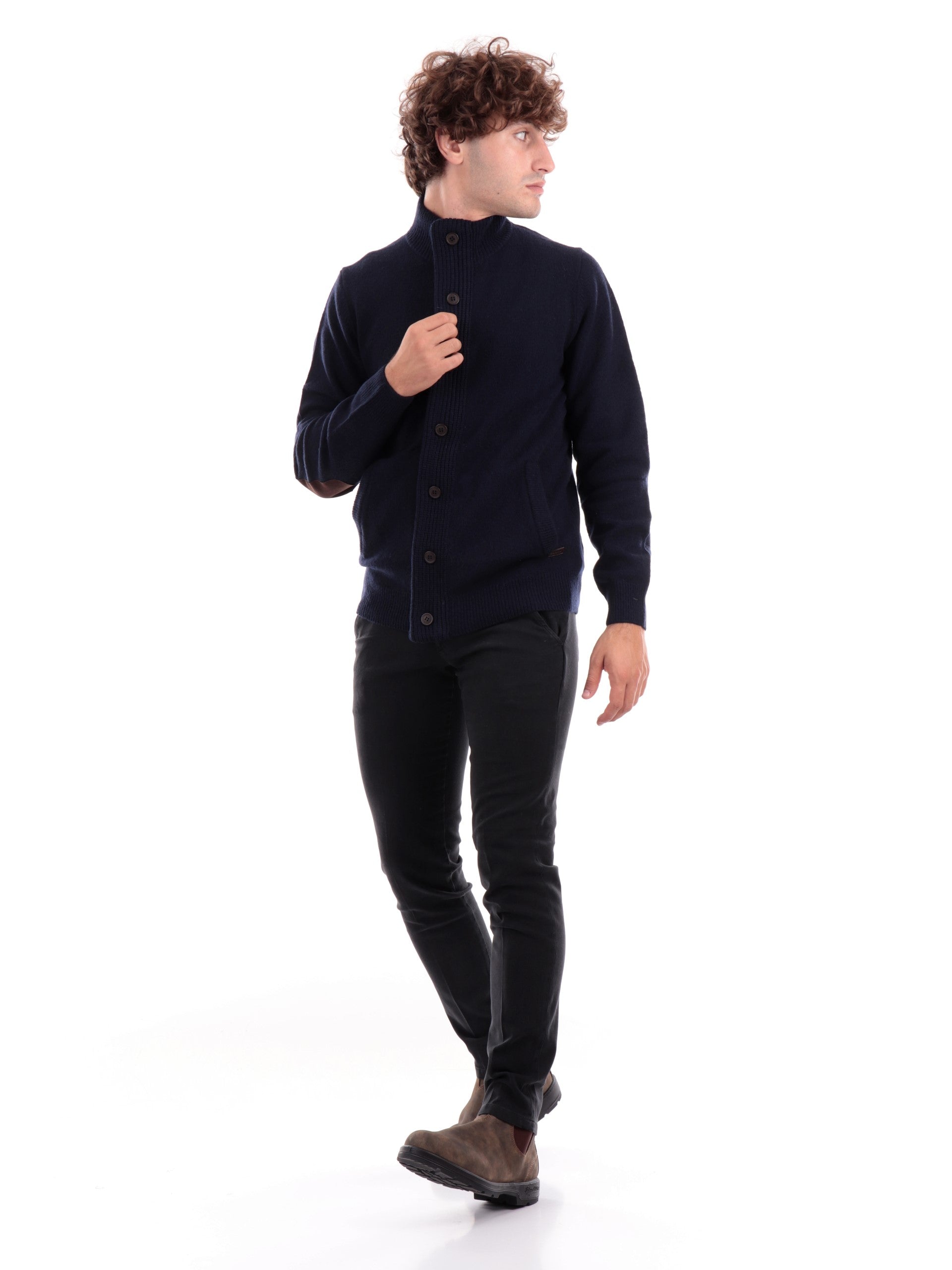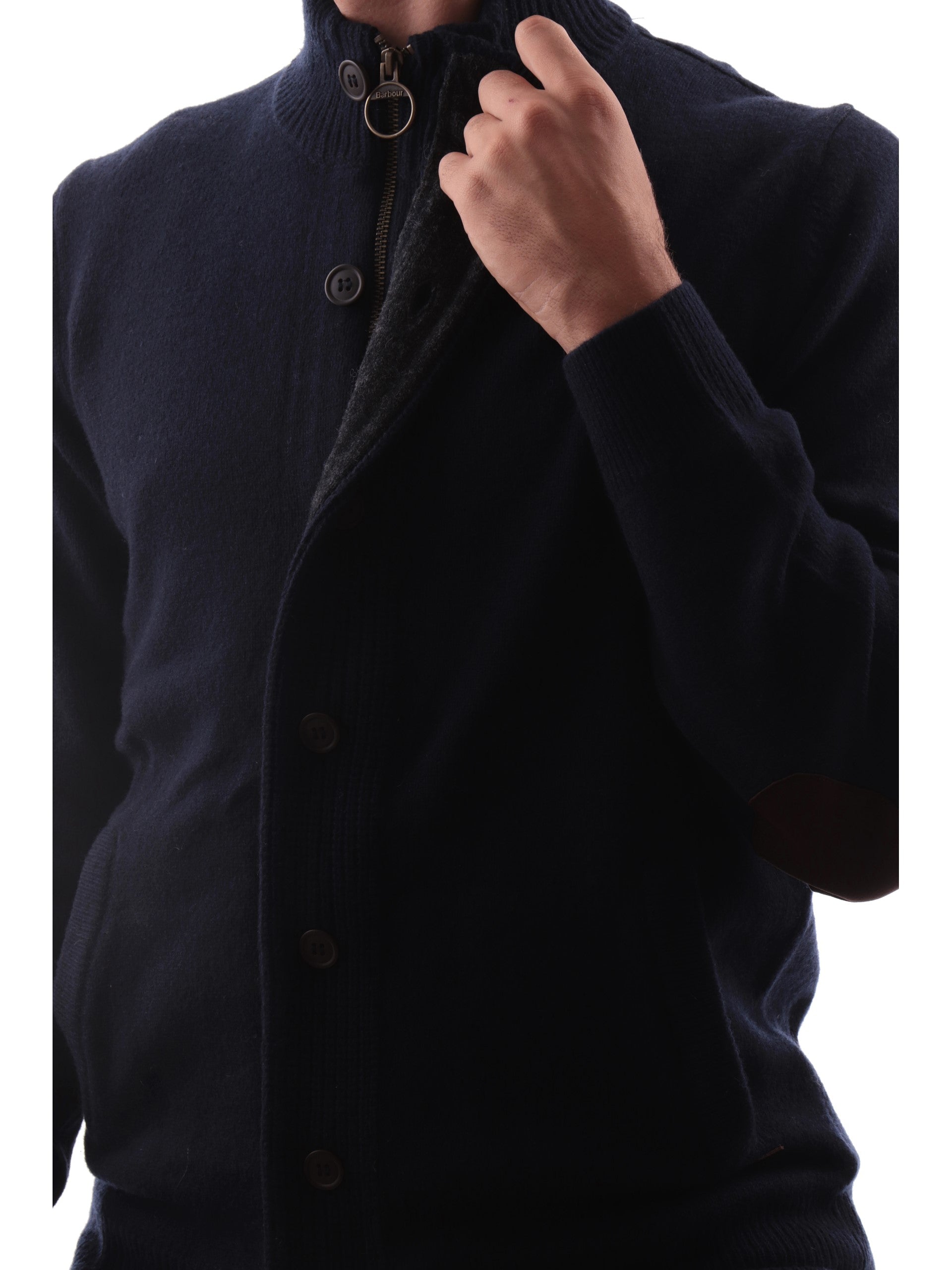 Maglione Barbour blu da uomo con patch logo Barbour sul fondo e toppe sui gomiti. Questo pullover Barbour uomo in calda lana, ha la zip centrale coperta da bottoni che gli donano un animo vintage ed elegante. Un maglione uomo Barbour perfetto da indossare in ogni occasione,da utilizzare come cardigan uomo o come maglione blu uomo.