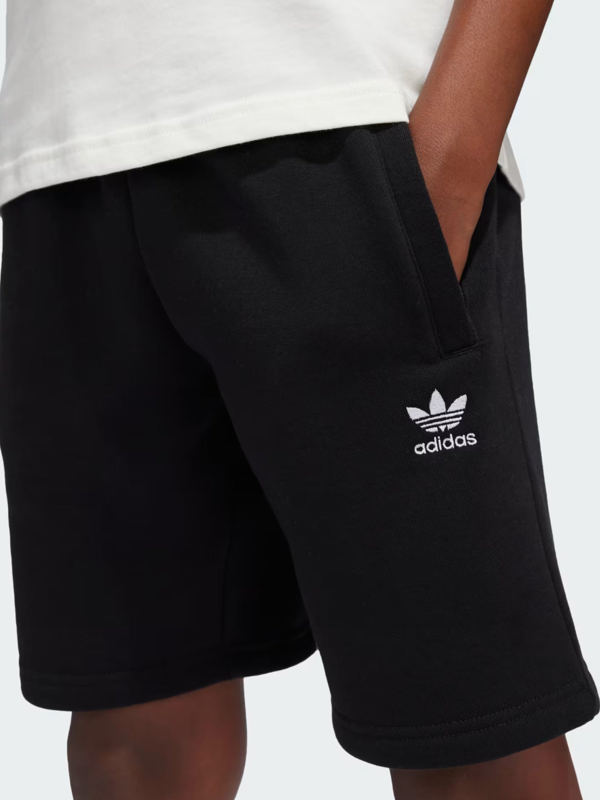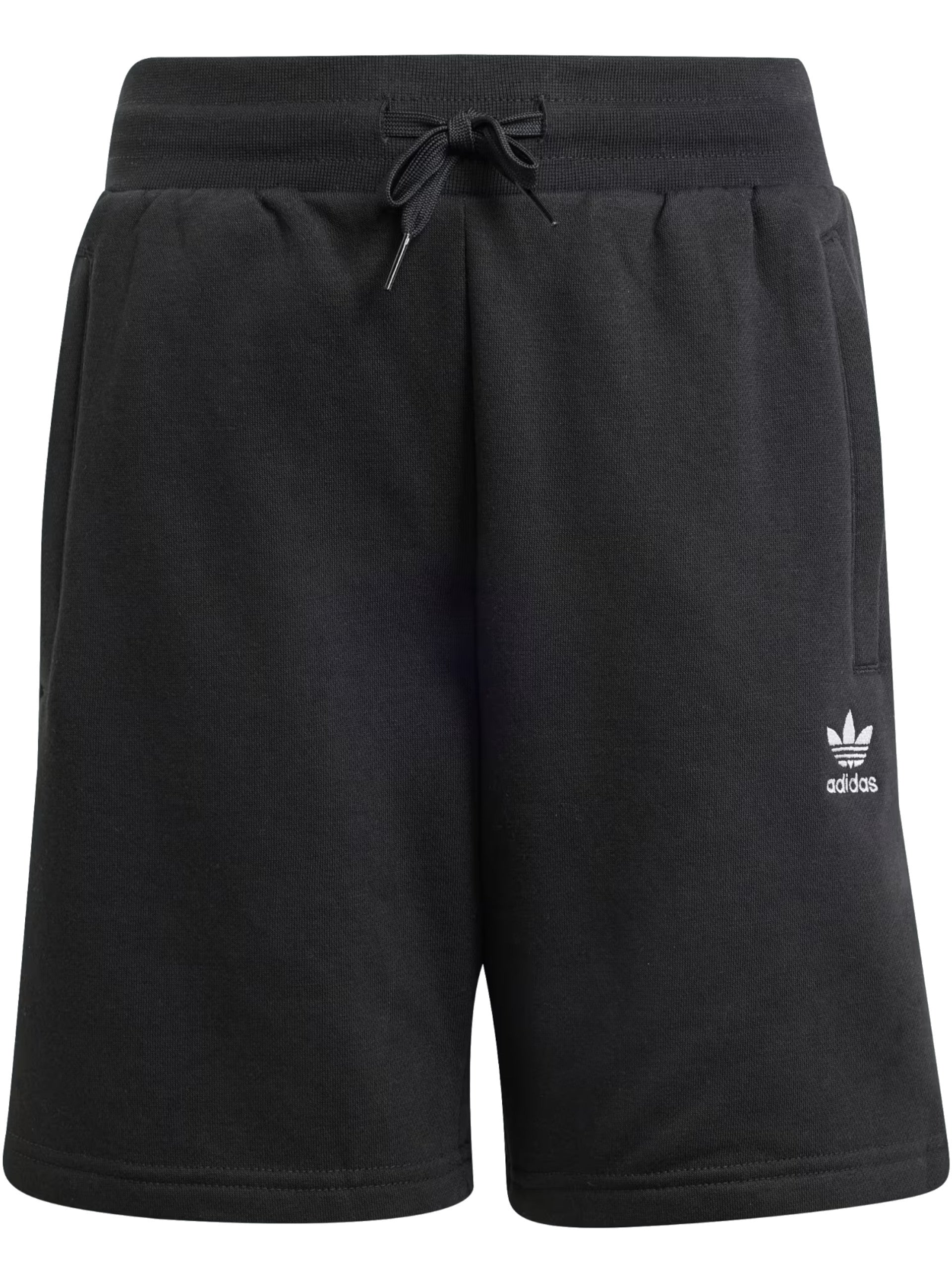 Pantaloncini Adidas neri Kids logo Adidas bianco ricamato IW3499, realizzati in cotone. Questi bermuda Adidas neri hanno la banda elastica sul punto vita regolabile con laccetti, due tasche laterali aperte e il logo Adidas bianco ricamato sul fondo.