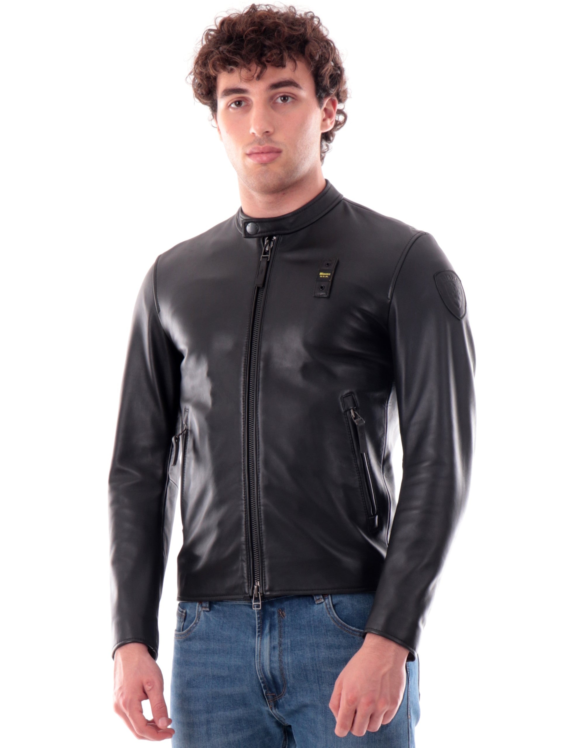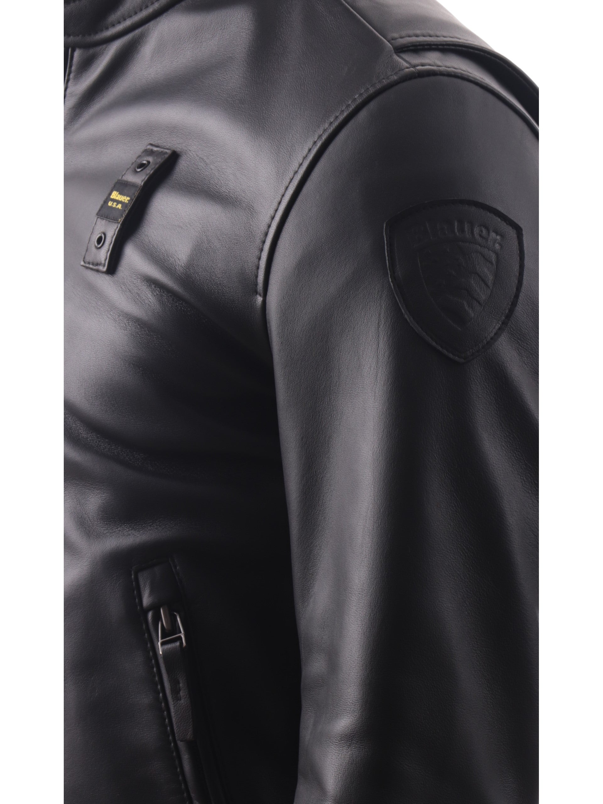 Giacca pelle Blauer nera Ripley full zip L02318007340. Questo giubbino pelle Blauer nero ha il colletto con bottone automatico, la chiusura full zip centrale, due tasche laterali aperte e il logo Blauer applicato sulla manica sinistra tono su tono.