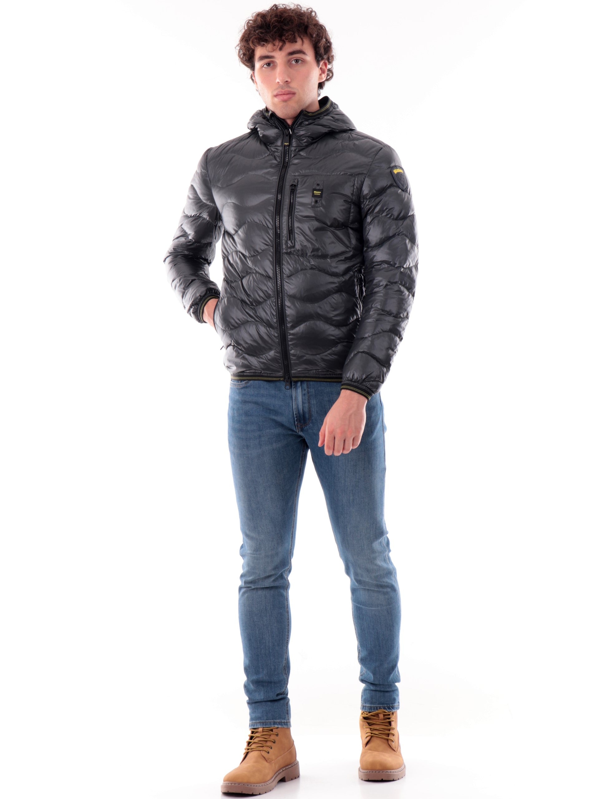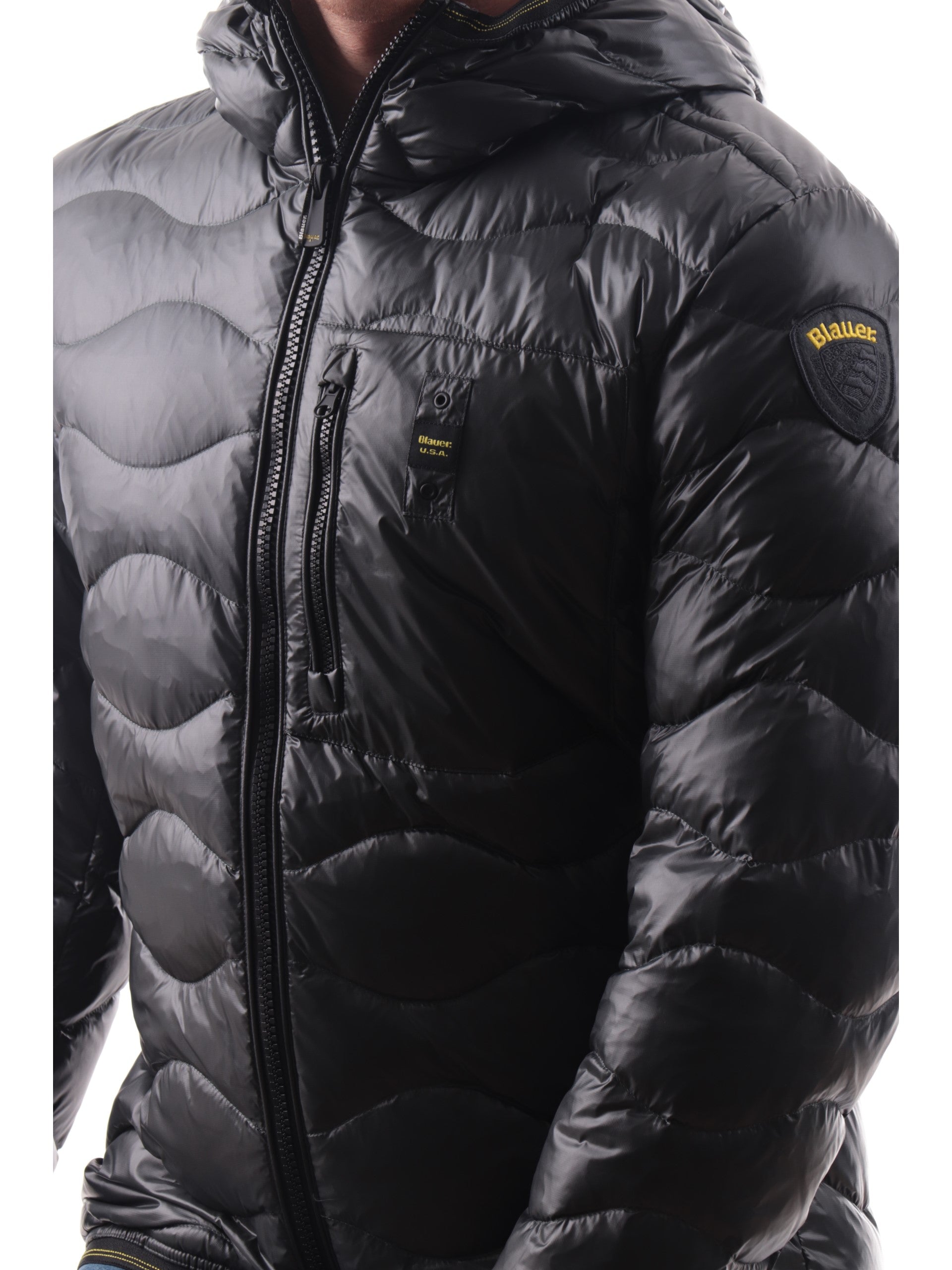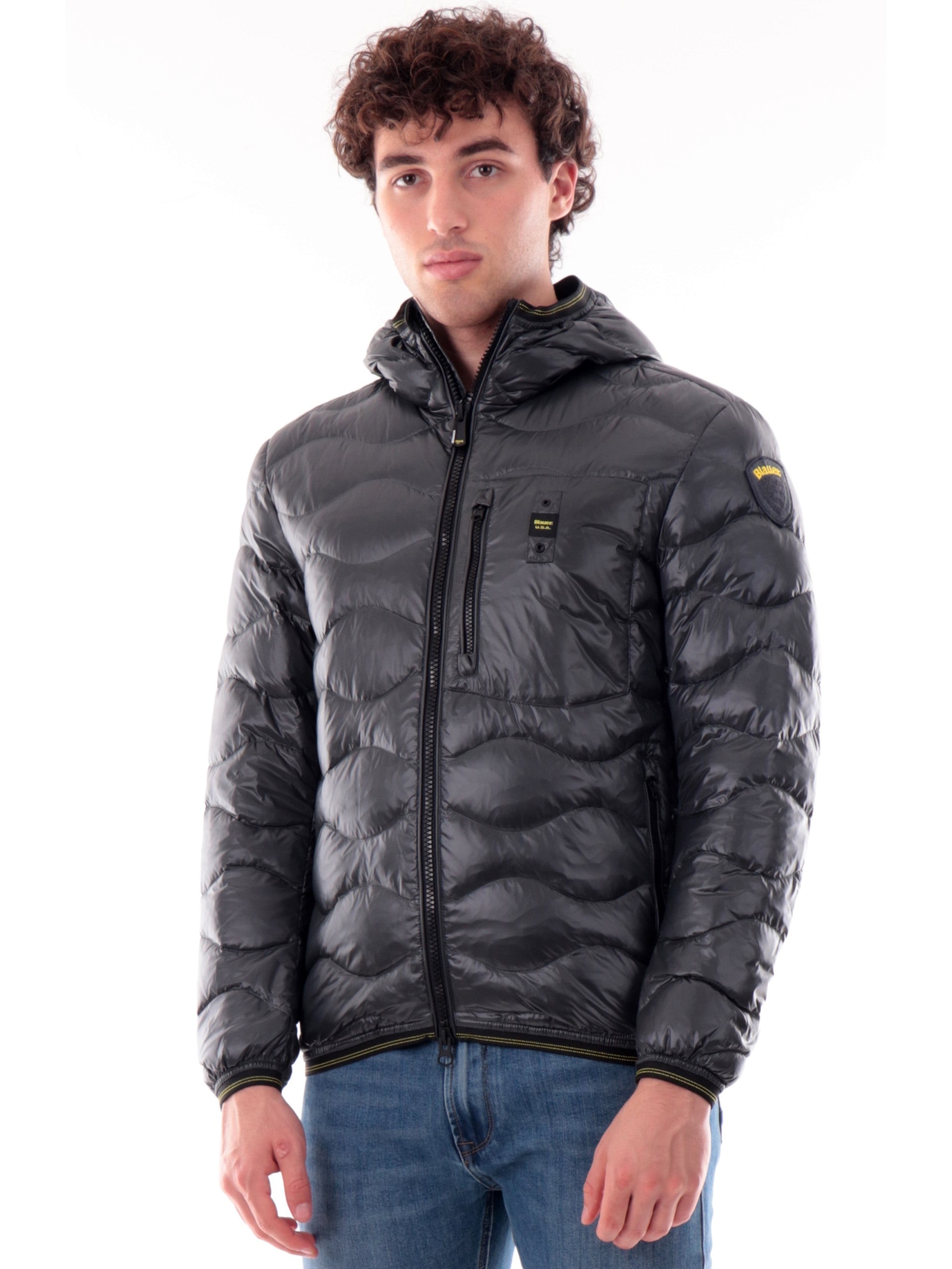 Piumino Blauer Onde grigio da uomo Corto Wave C03074006355, realizzato con imbottitura in vera piuma. Questo giubbino Blauer grigio ha il cappuccio con bordatura elasticizzati, la chiusura full zip centrale, due tasche laterali con zip, un taschino sul cuore, il patch del brand applicato sulla manica sinistra a contrasto colore, polsini e fondo elasticizzati.
