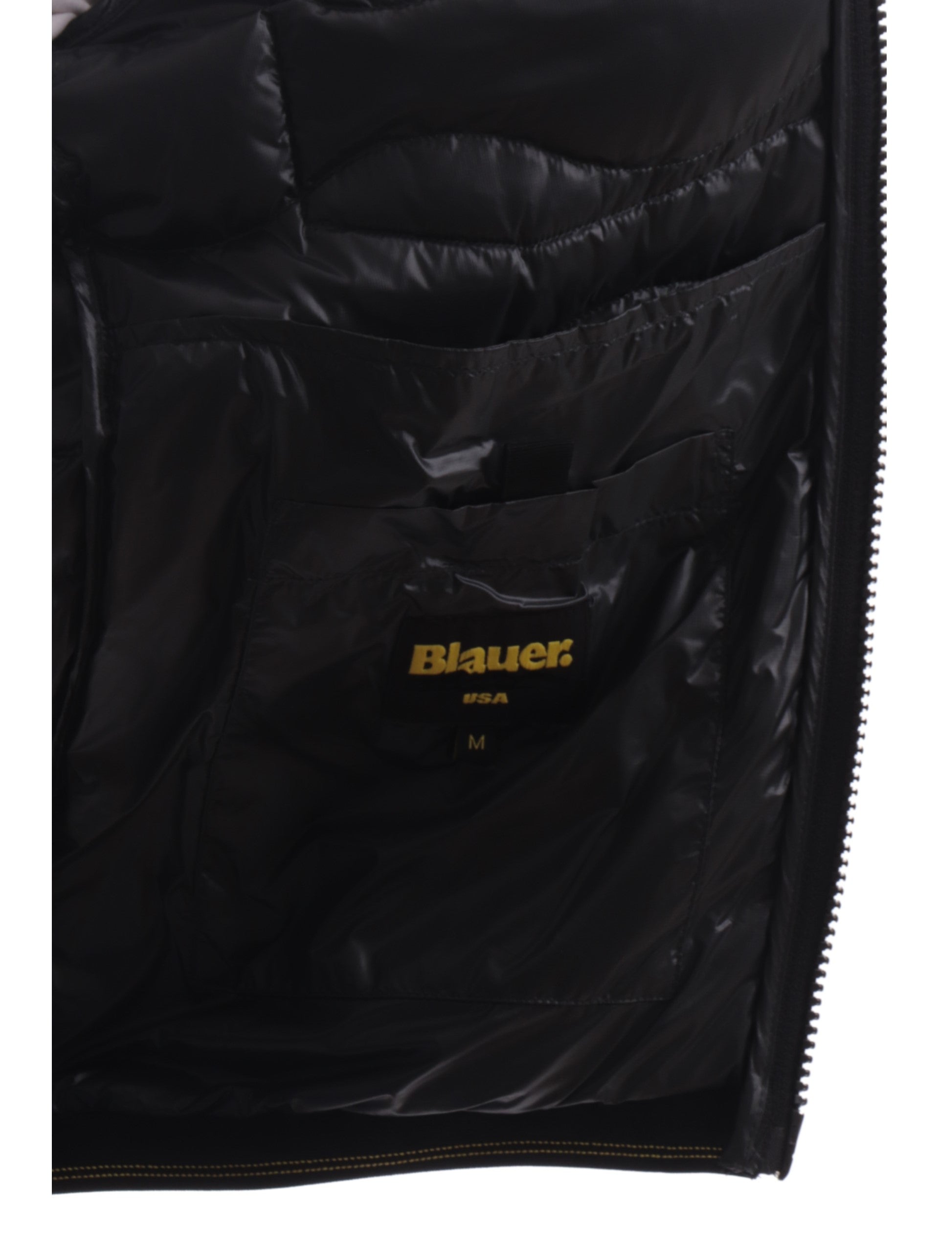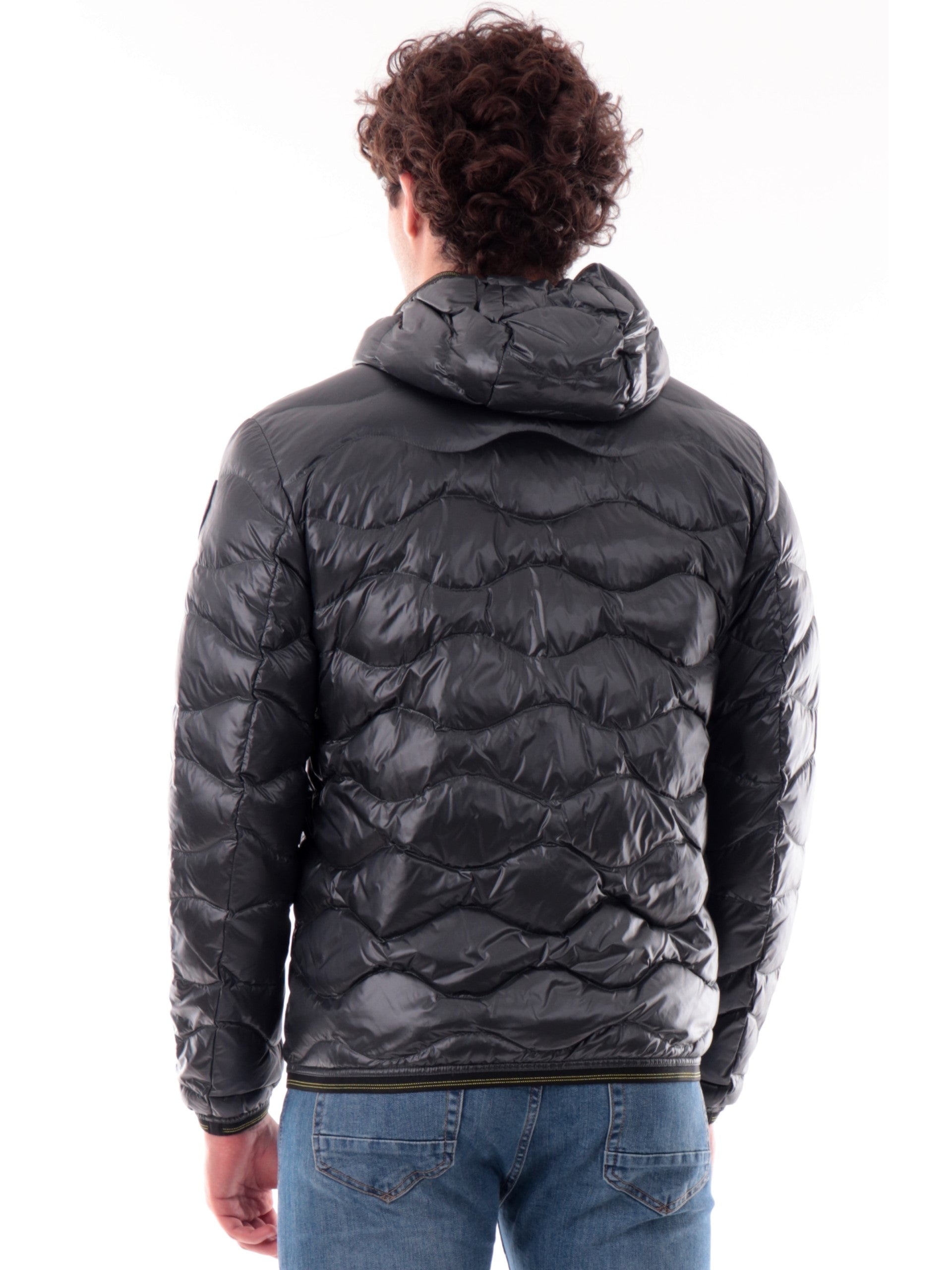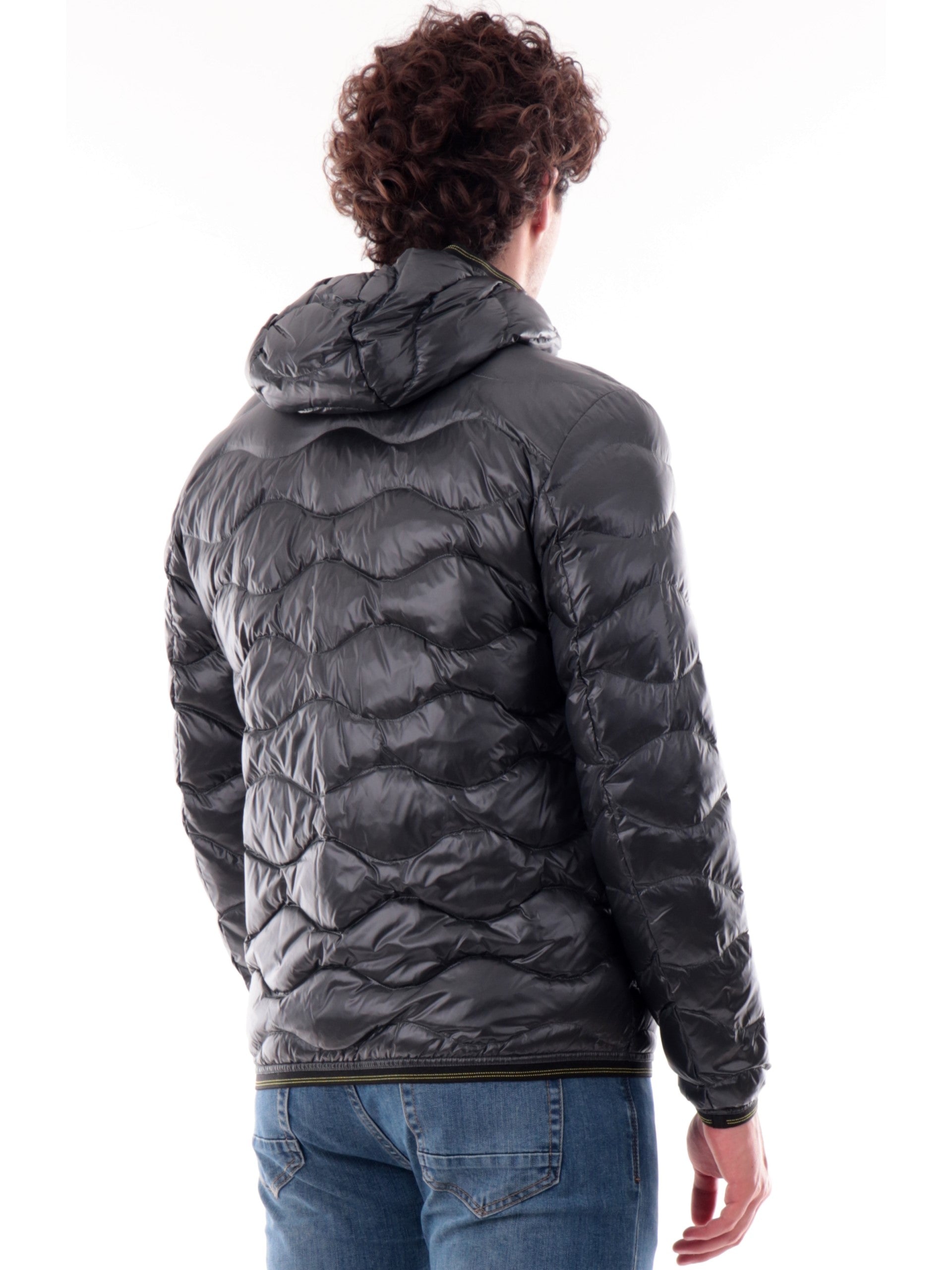 Piumino Blauer Onde grigio da uomo Corto Wave C03074006355, realizzato con imbottitura in vera piuma. Questo giubbino Blauer grigio ha il cappuccio con bordatura elasticizzati, la chiusura full zip centrale, due tasche laterali con zip, un taschino sul cuore, il patch del brand applicato sulla manica sinistra a contrasto colore, polsini e fondo elasticizzati.