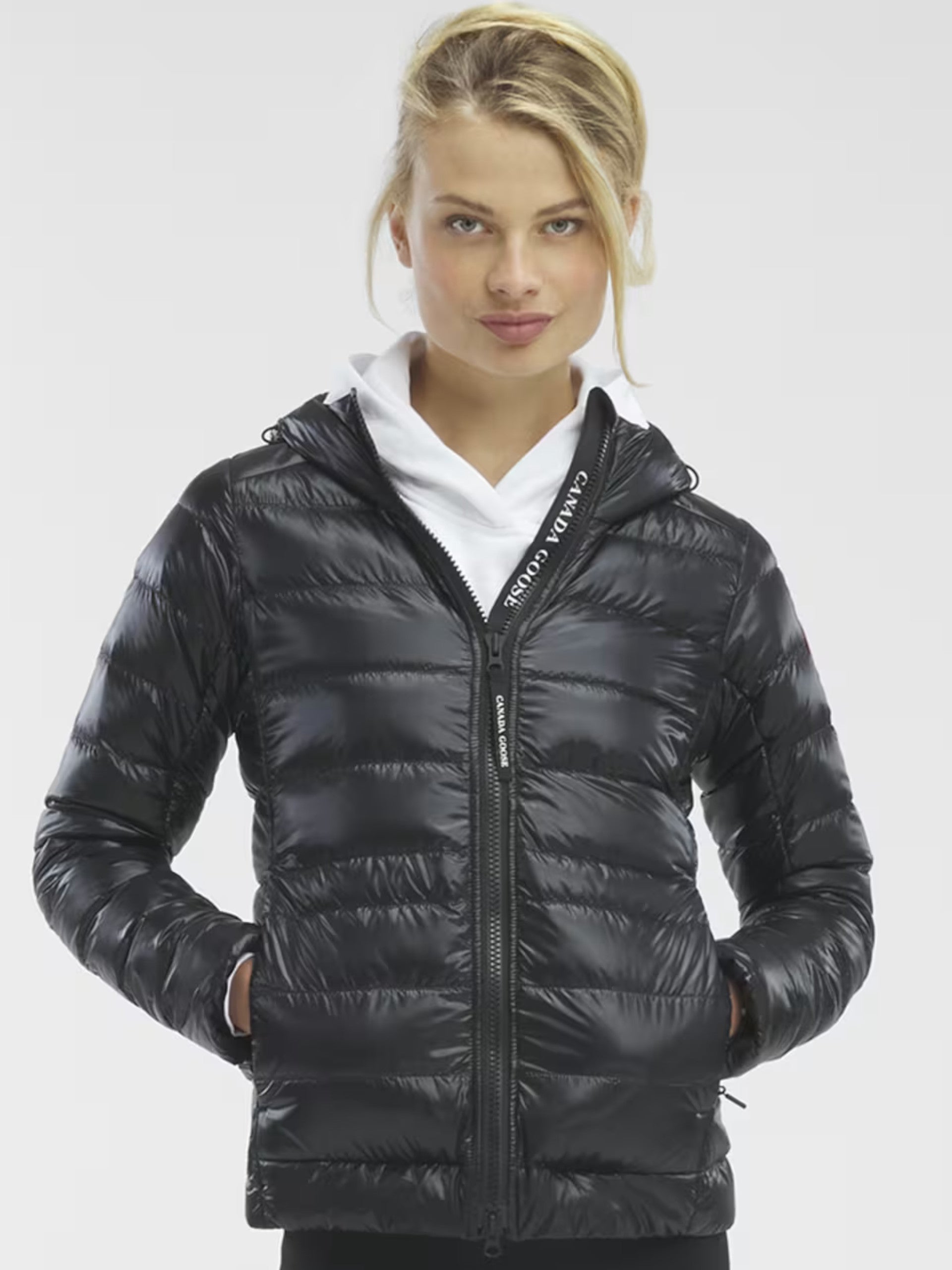 Giacca Canada Goose Cypress Hoody nera da donna con bretelle interne 2242, progettata per arrivare a temperature molto rigide fino a -5°C. Piumino donna Canada Goose dalle linee pulite realizzato concappuccio regolabile. Giacca nera Canada Goose con chiusura full zip centrale, due tasche laterali ed inconfondibile logo cucito sulla manica sinistra.