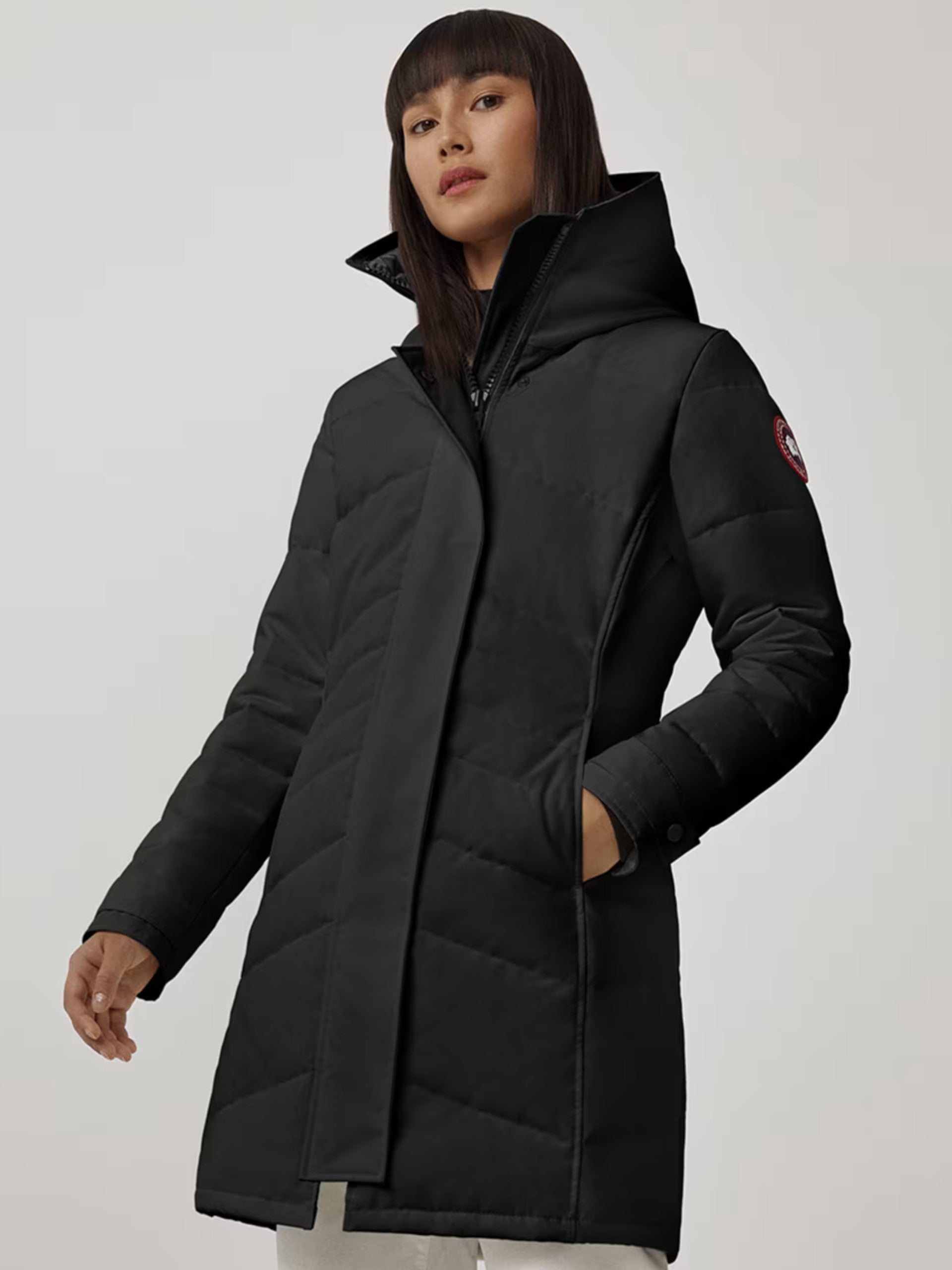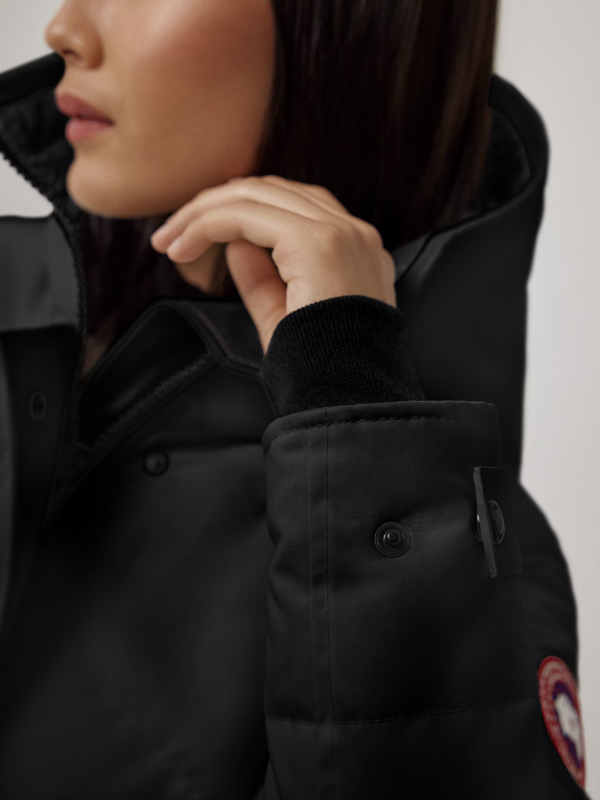 Giacca Canada Goose Lorette Parka Reset nera da donna tessuto tecnico 2090, progettata per arrivare a temperature molto rigide fino a -20°C. Cappotto donna Canada Goose dalle linee pulite realizzato con cappuccio regolabile. Giaccone nero Canada Goose con chiusura full zip centrale nascosta da una patta con bottoni automatici, due tasconi laterali ed inconfondibile logo cucito sulla manica sinistra.