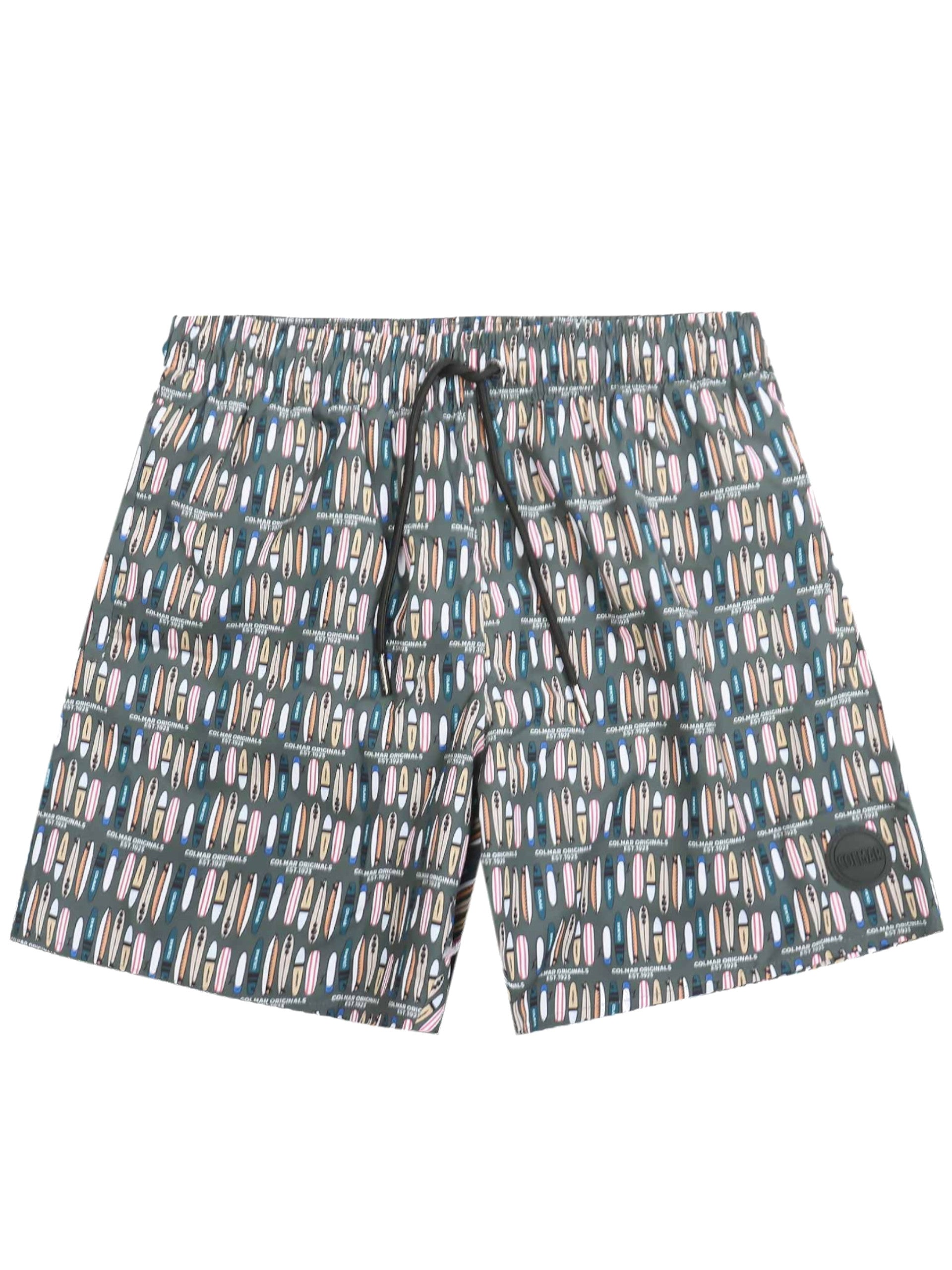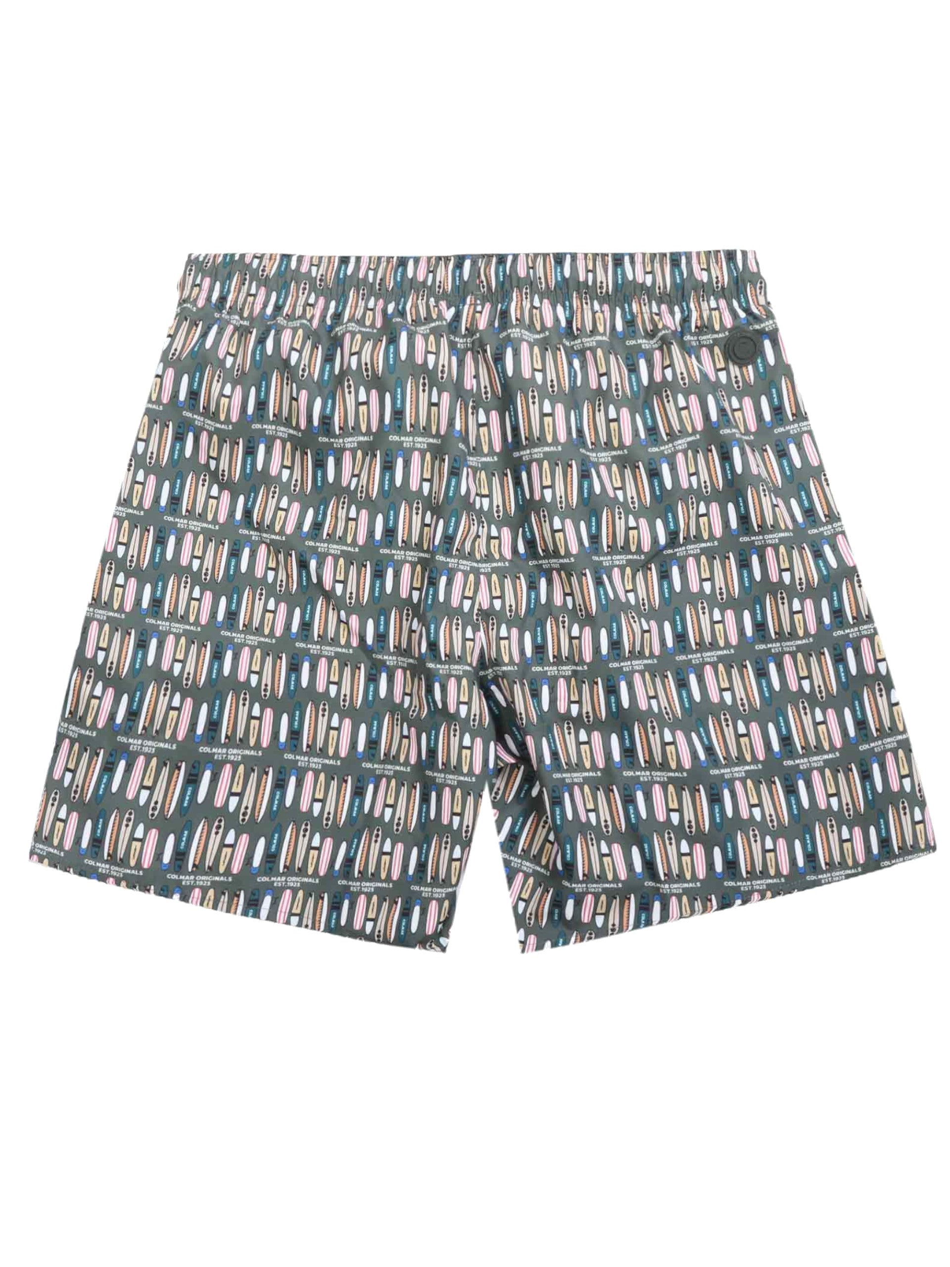 Costume mare Colmar verde da uomo stampa tavole da Surf 7269A3ZD, realizzato in tessuto in grado di asciugarsi in pochissimi minuti. Questo costume Colmar verde ha la banda elastica sul punto vita regolabile con laccetti, due tasche laterali aperte, il patch Colmar applicato sul fondo e la stampa tavole da Surf all over.