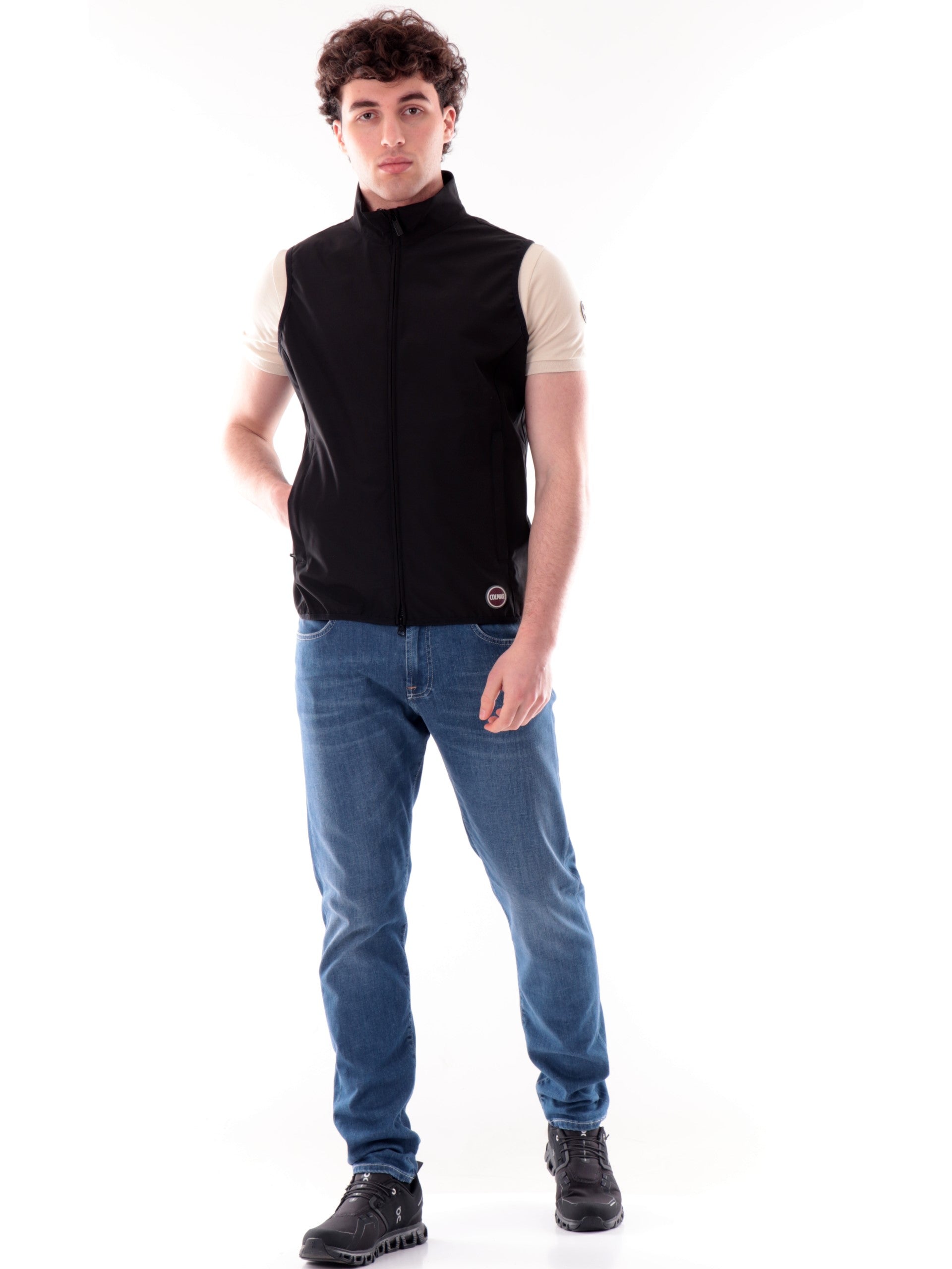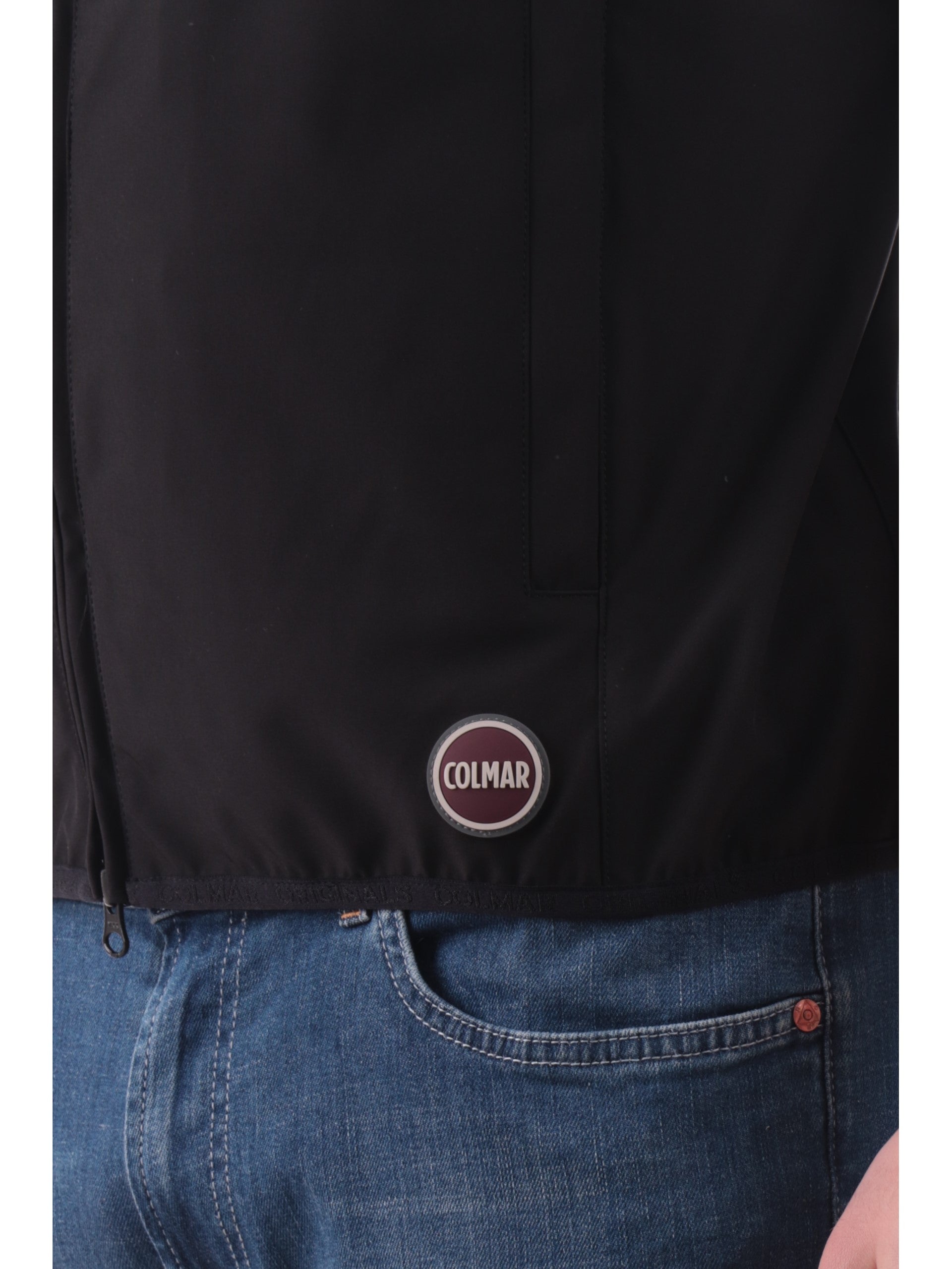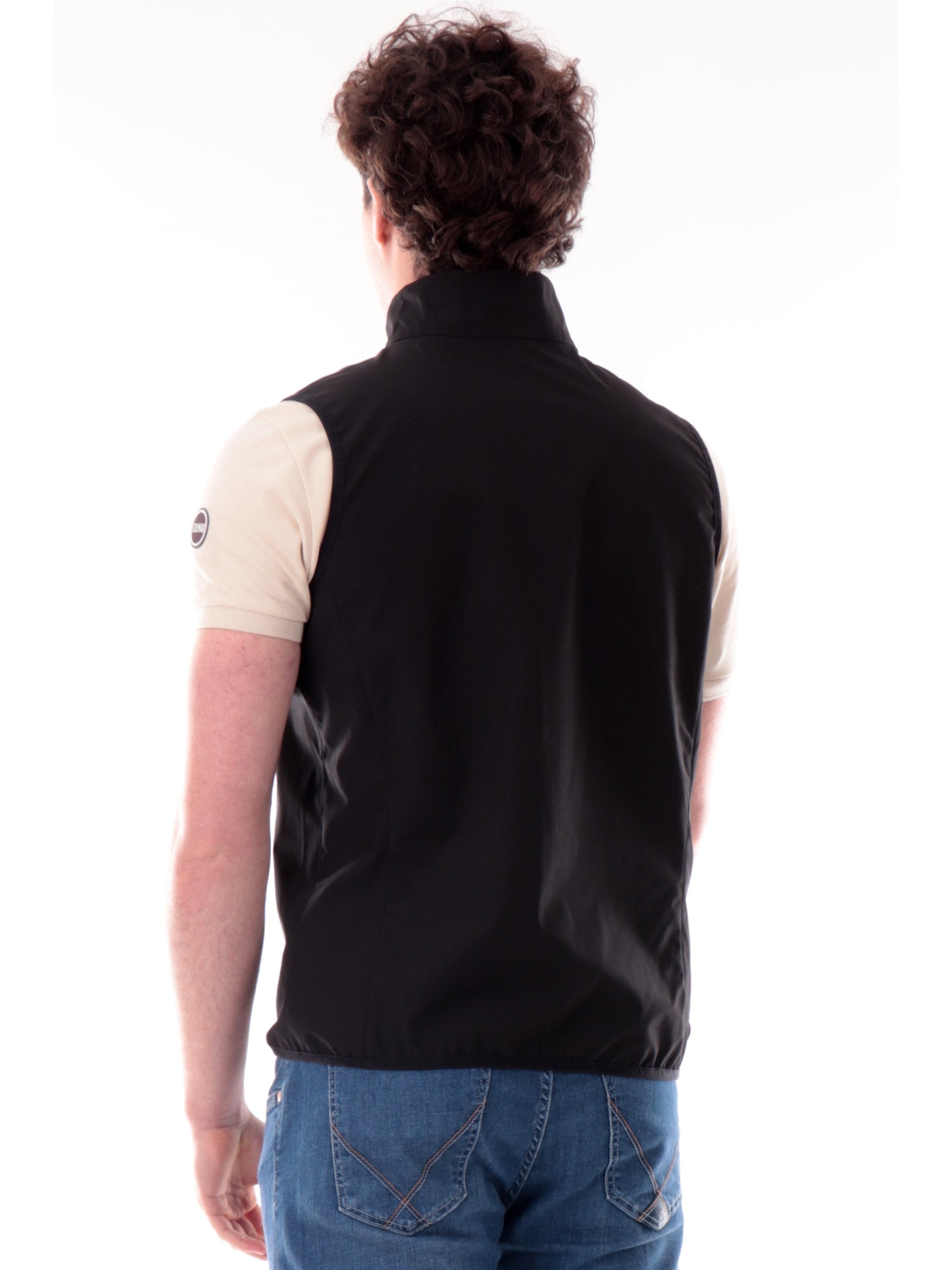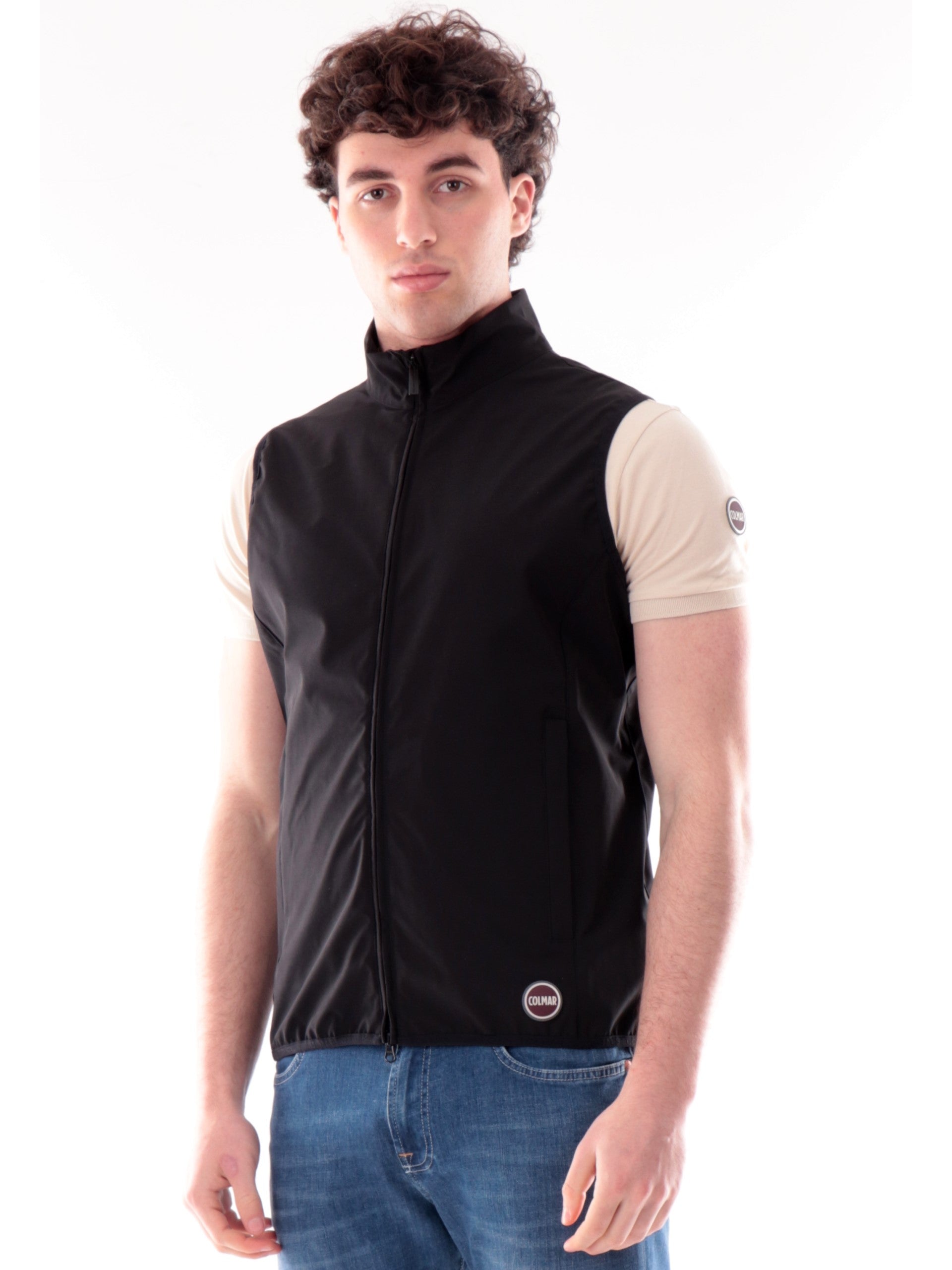 Gilet Colmar nero da uomo. Questo gilet Colmar nero in piuma perfetto per la primavera, impermeabile, completa con stile ogni outfit, è caratterizzato da chiusura a zip con doppio cursore, tasche laterali con zip, fondo regolare, logo Colmar applicato in basso a sinistra