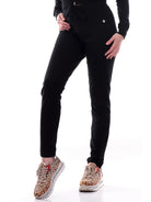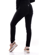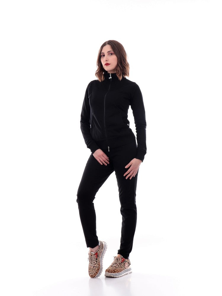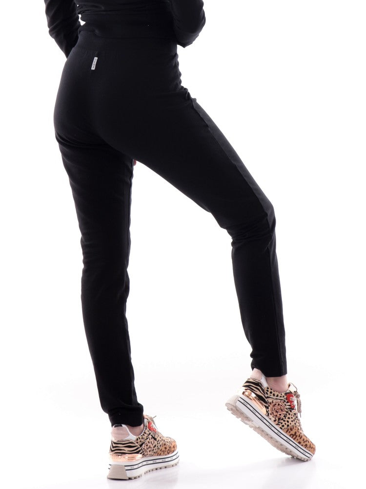 Deha women's trousers made of stretch organic cotton fleece, available in solid black shades. The A00535 model features an elasticated waist with a ribbed finish, with an adjustment drawstring to adjust the fit and a regular fit. Deha tracksuit trousers with a simple design, belonging to the Deha Essential line, are personalized with a contrasting color Deha monogram on the left leg.