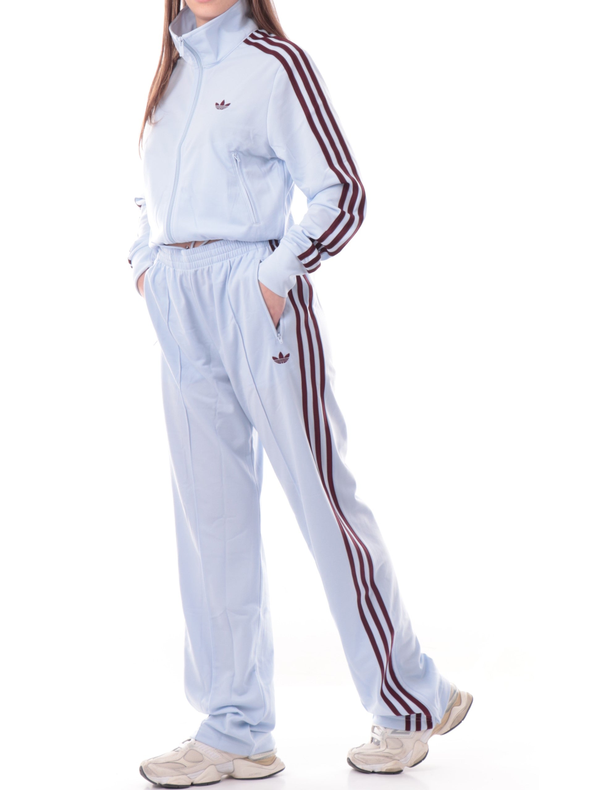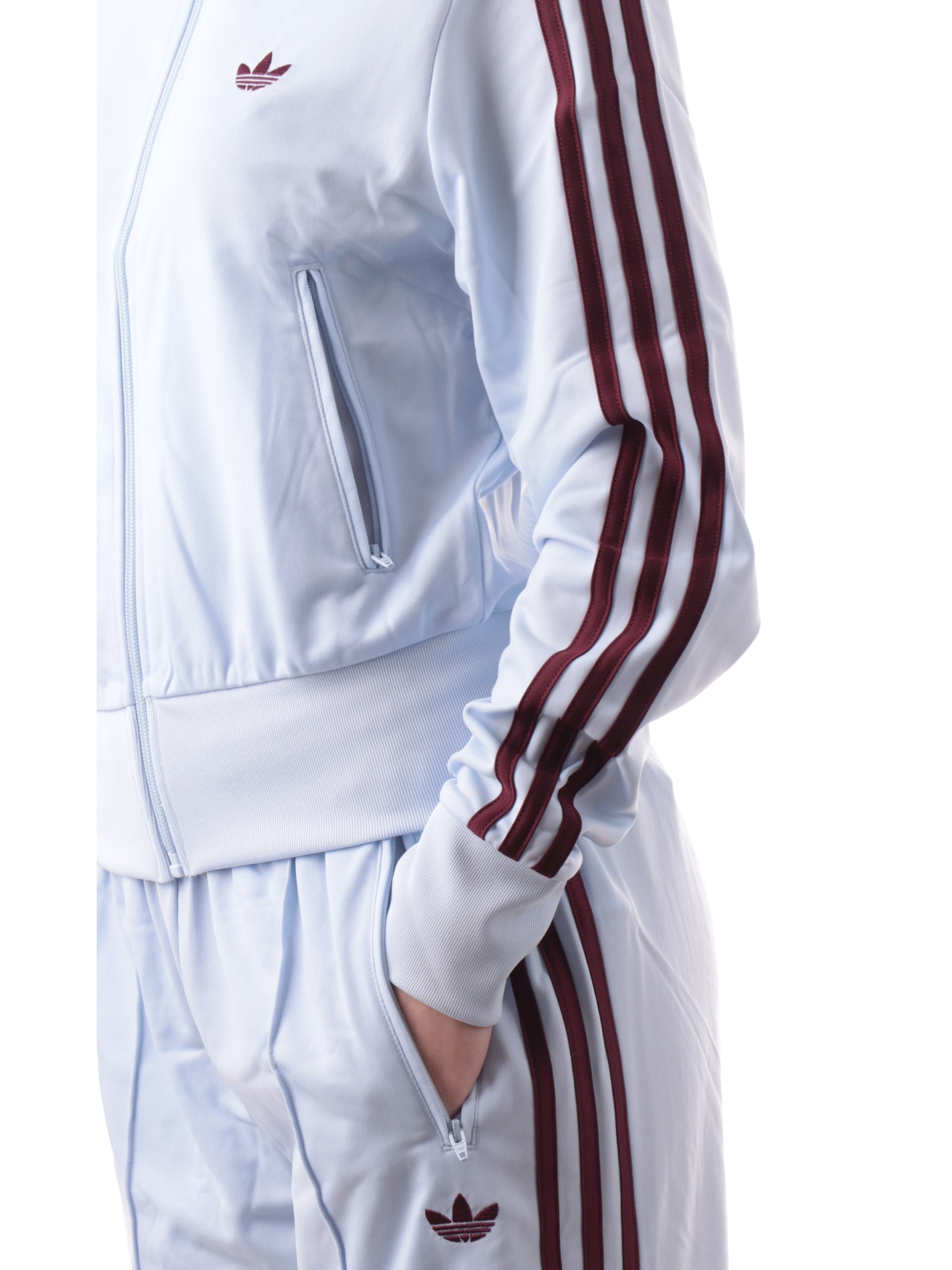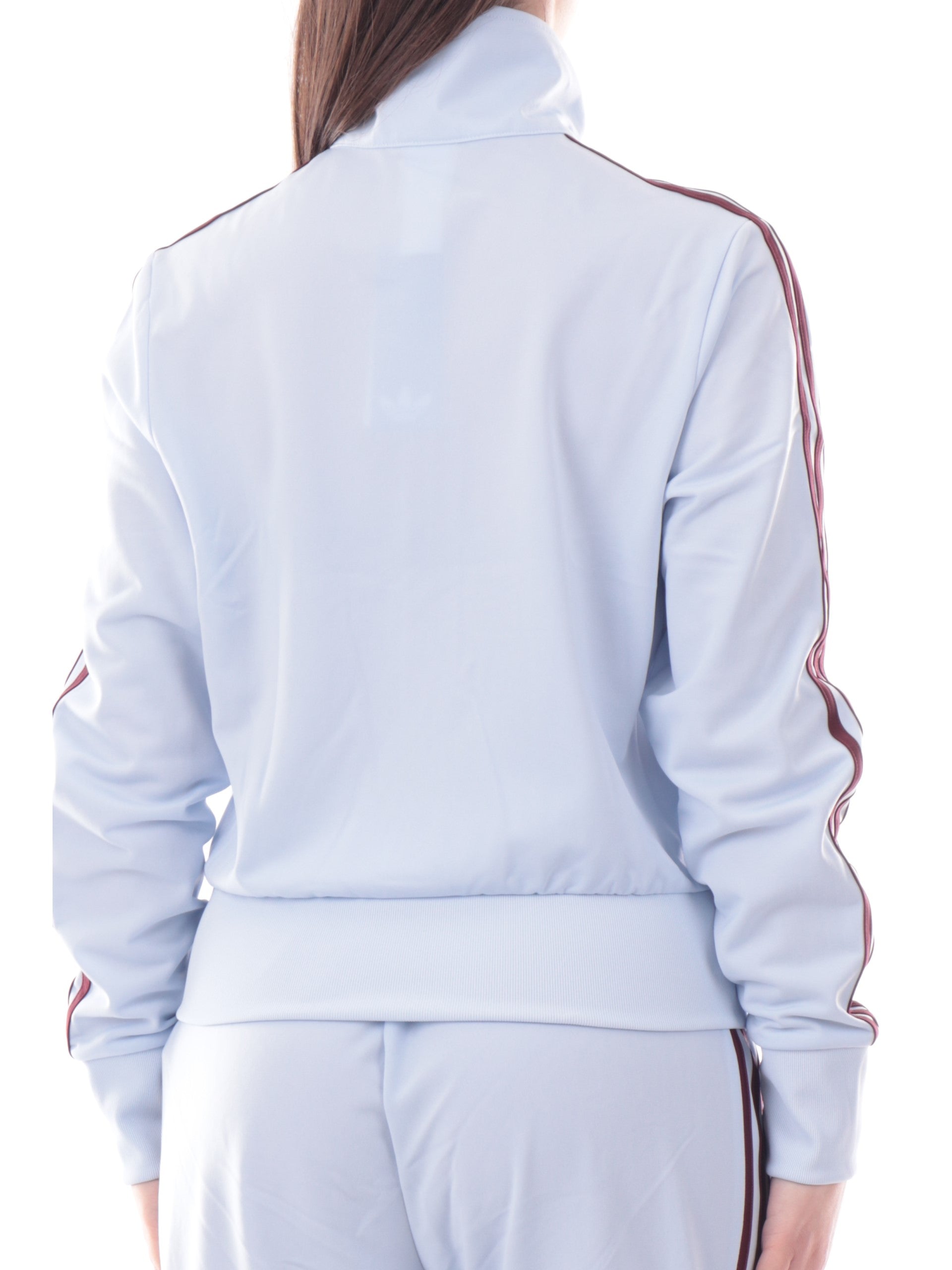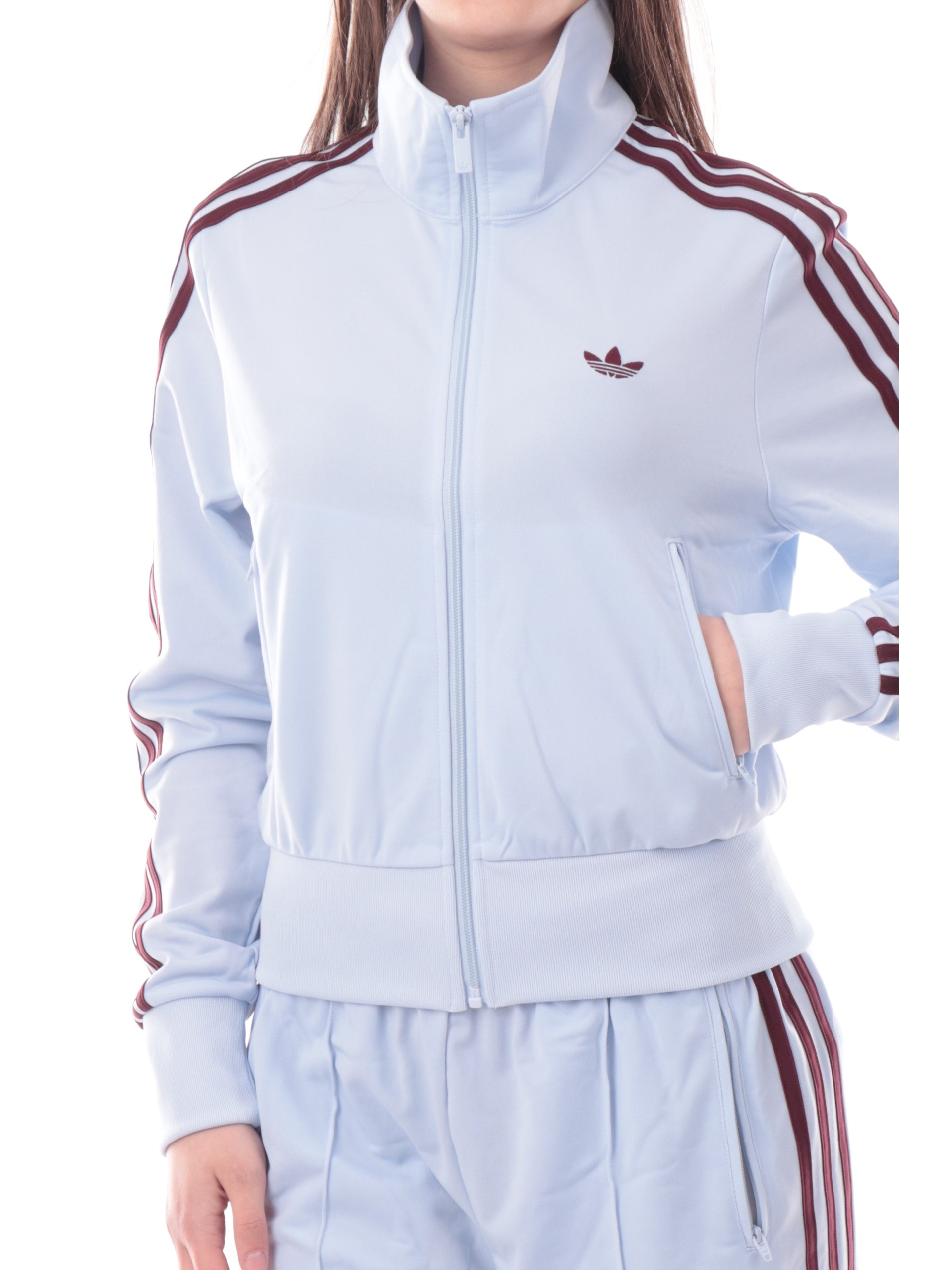 Felpa Adidas celeste da donna acetata 3Stripes. Questa felpa da donna, realizzata da un morbido tessuto, perfetta per la stagione primavera-estate e perfetta per un look sportivo, è caratterizzata dal collo alto, chiusura full zip, due tasche laterali con zip, le iconiche 3Stripes ambo lati, il logo Adidas ricamato a lato cuore, polsini e fondo elasticizzati a costine