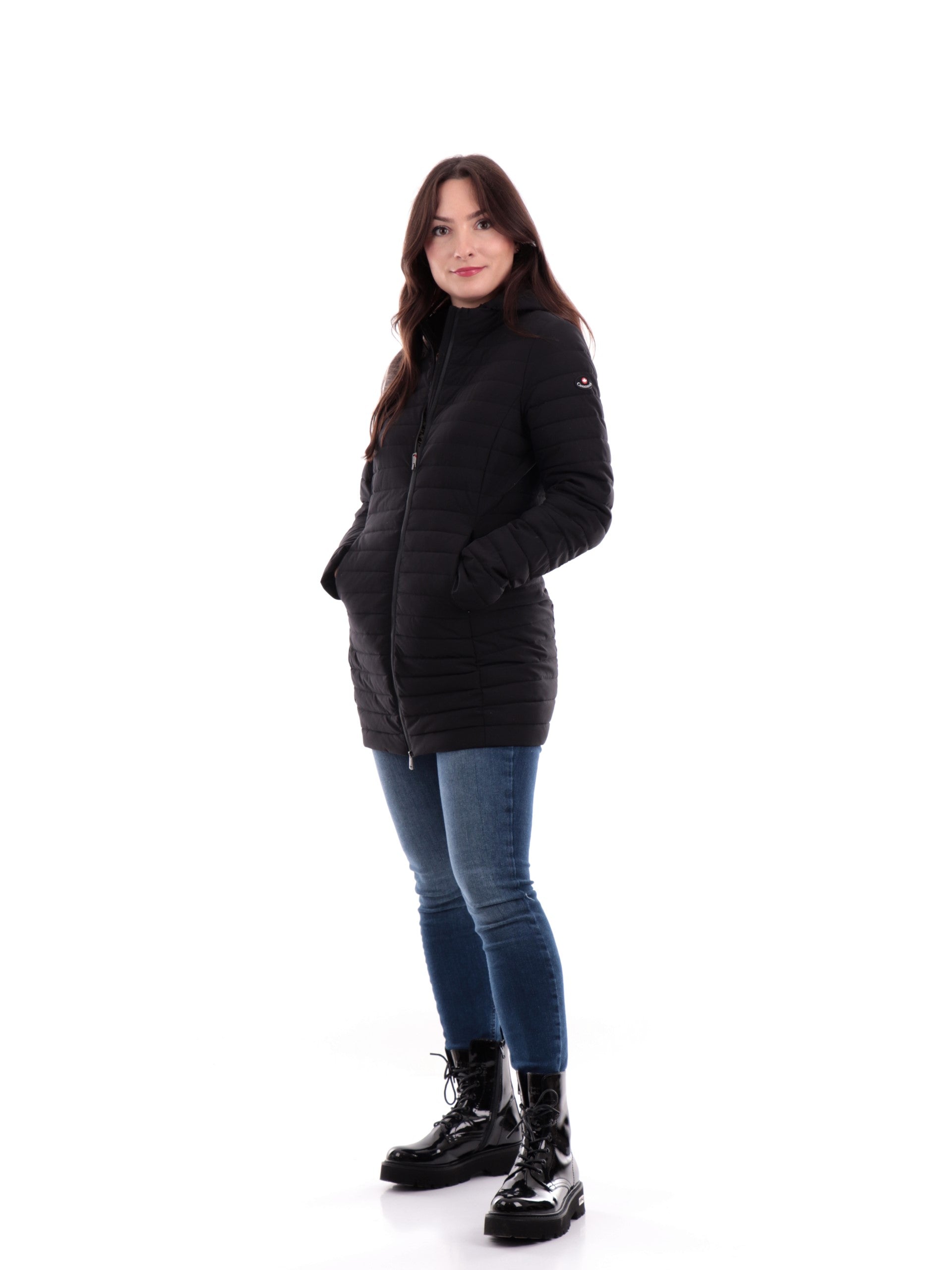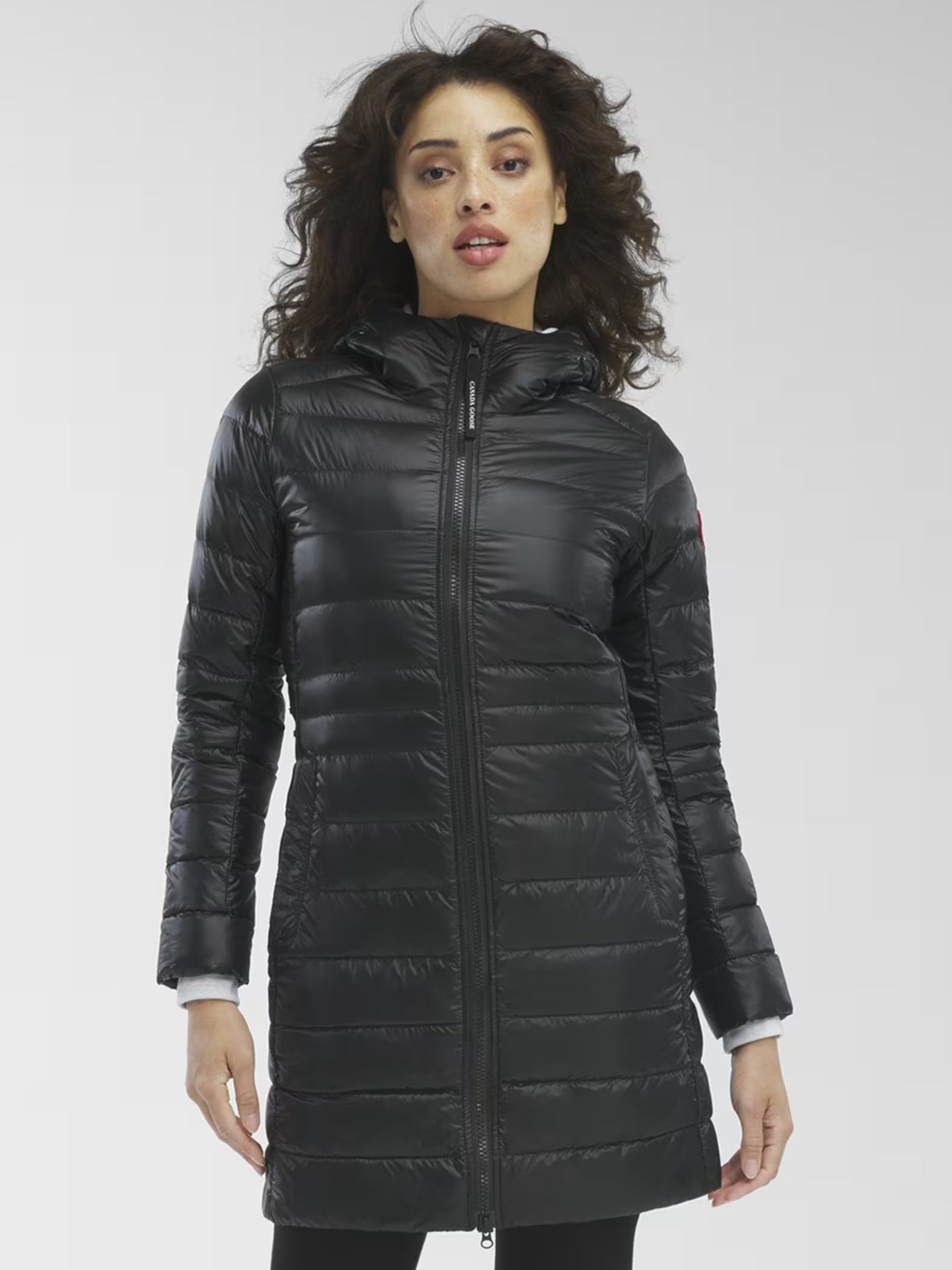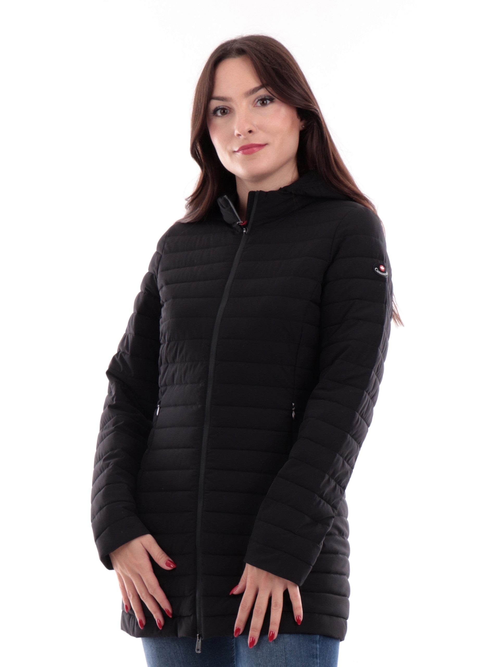 Cappotto Canada Goose Cypress Hooded Jacket nero da donna 2235, progettato per arrivare a temperature molto rigide fino a -5°C. Piumino lungo donna Canada Goose dalle linee pulite realizzato con cappuccio regolabile. Giacca lunga nera Canada Goose con chiusura full zip centrale, due tasche laterali ed inconfondibile logo cucito sulla manica sinistra.